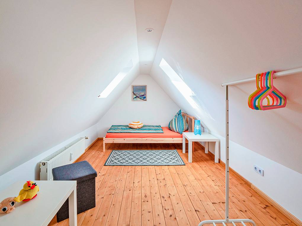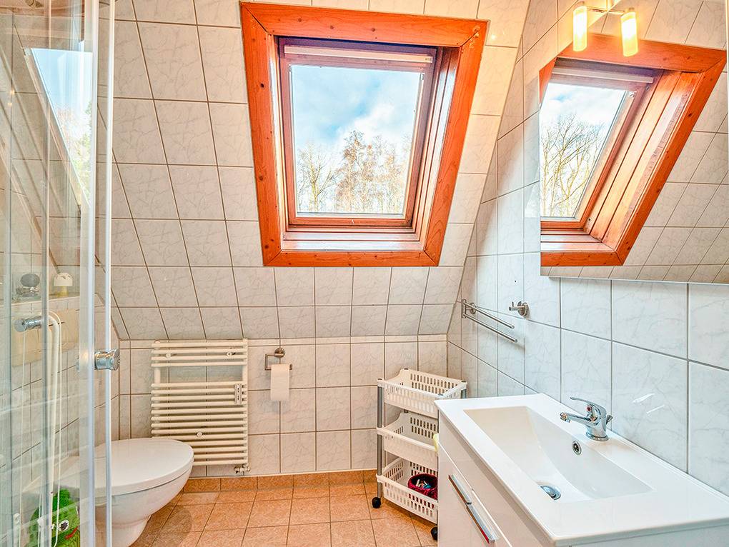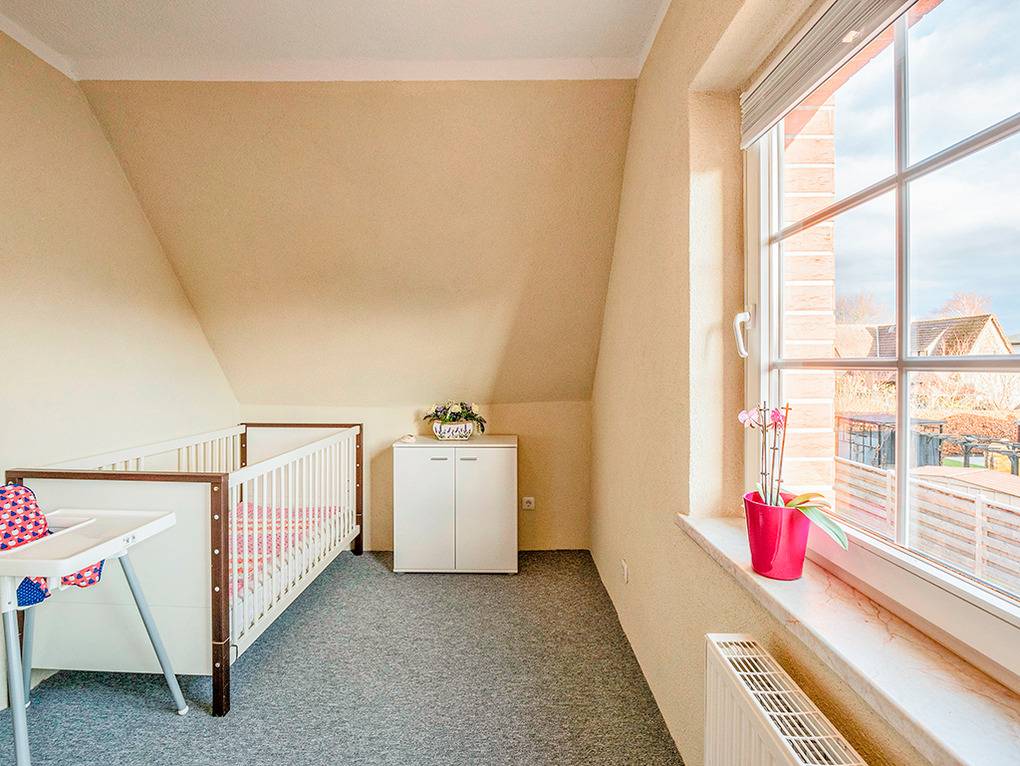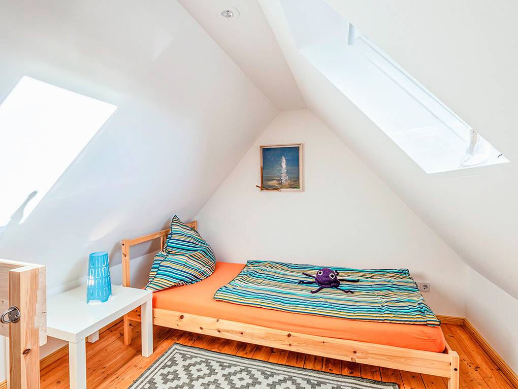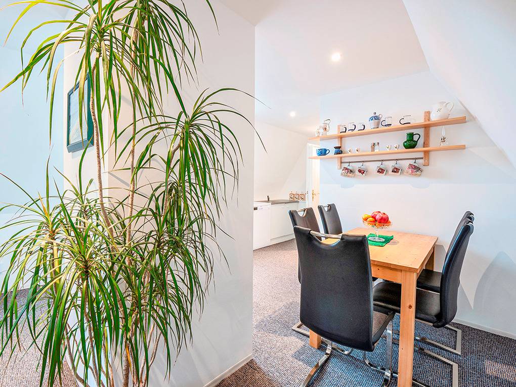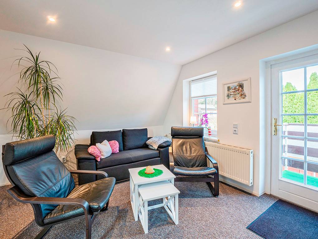D 61.27 Wohnung 1-4 Pers.: 3-Zimmerwohnung mit 65 qm Wohnfläche über 2 Etagen mit Dachschrägen, 1. Etage, separater Zugang über Außentreppe. Großzügiger Wohn/-Essraum mit Couchgarnitur (Ausziehcouch 2 Pers.), Sat-TV, Esstisch, Küchenblock (2 Pl. E-Herd, Backofen, Spülmaschine). Doppelzimmer. Bad/WC. Steile Stiege ins ausgebaute Dachgeschoss (maximale Stehhöhe: 190 cm): 2-Bettzimmer. Hinweis: Der Vermieter gestattet eine maximale Belegung mit 4 Personen.