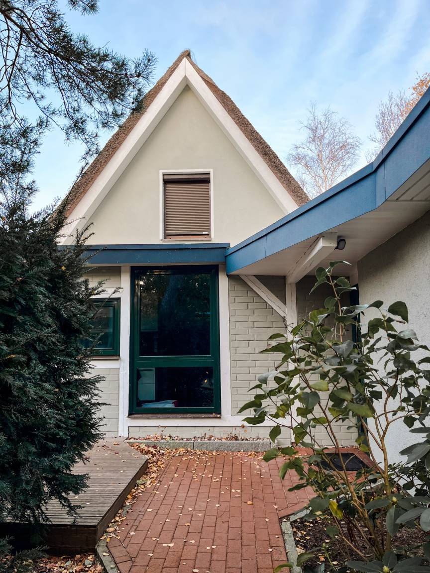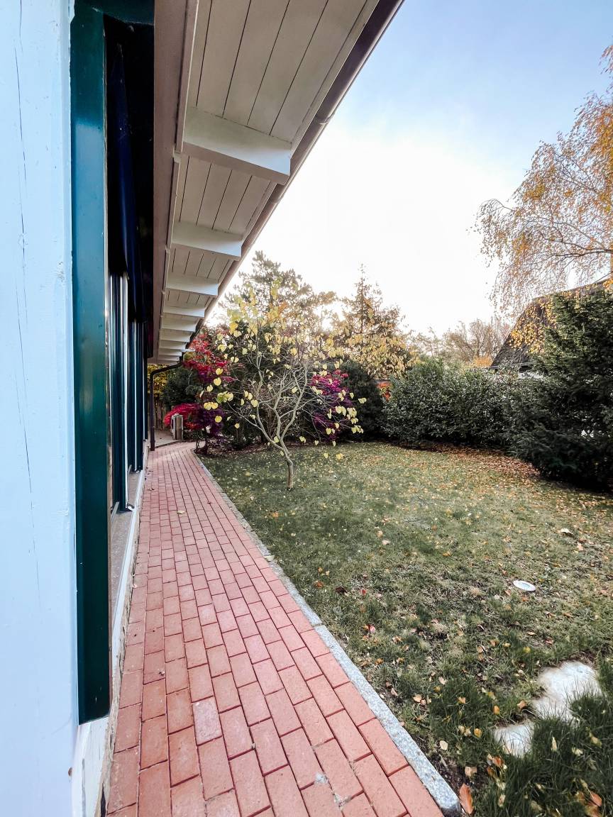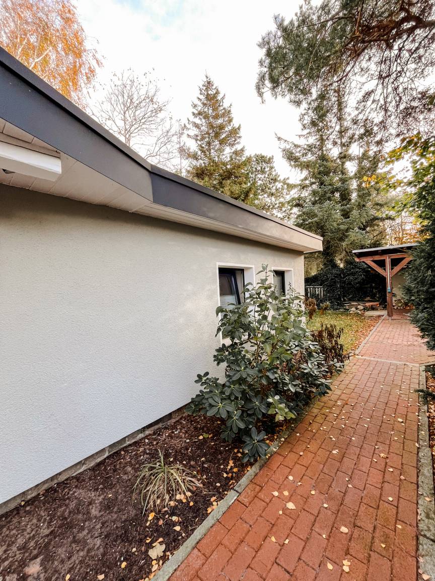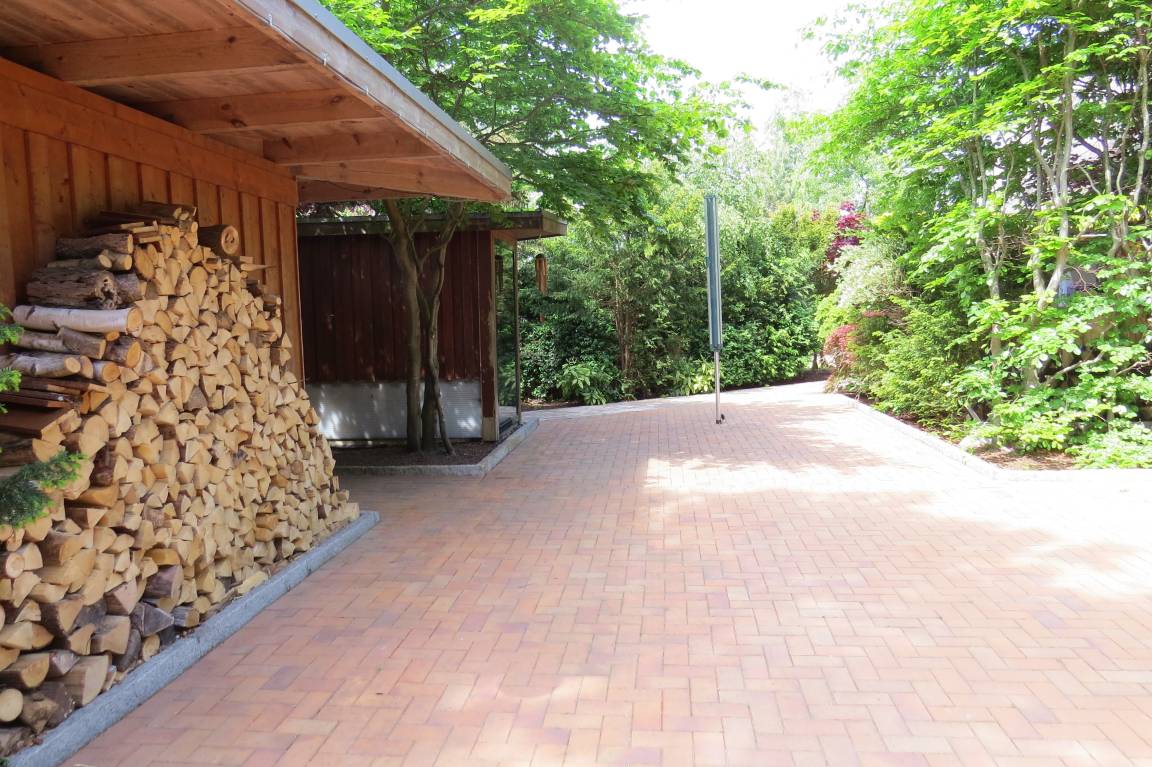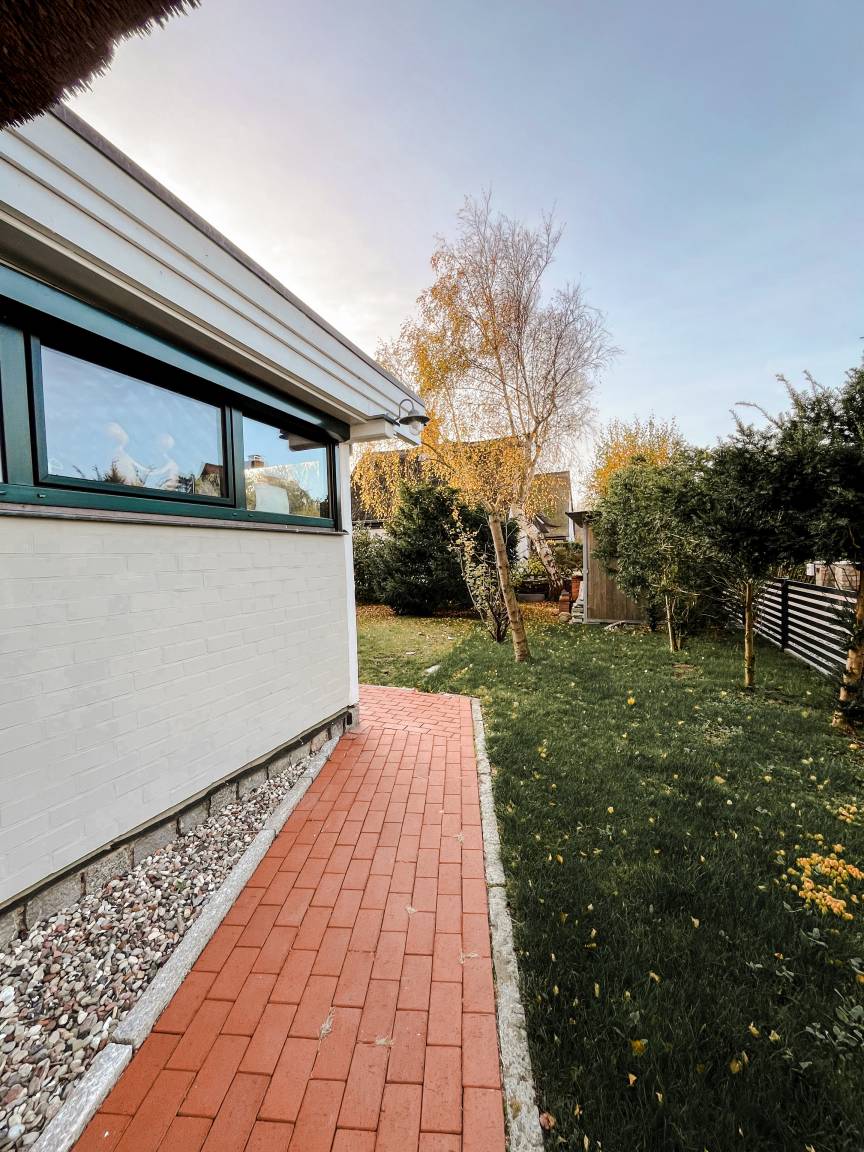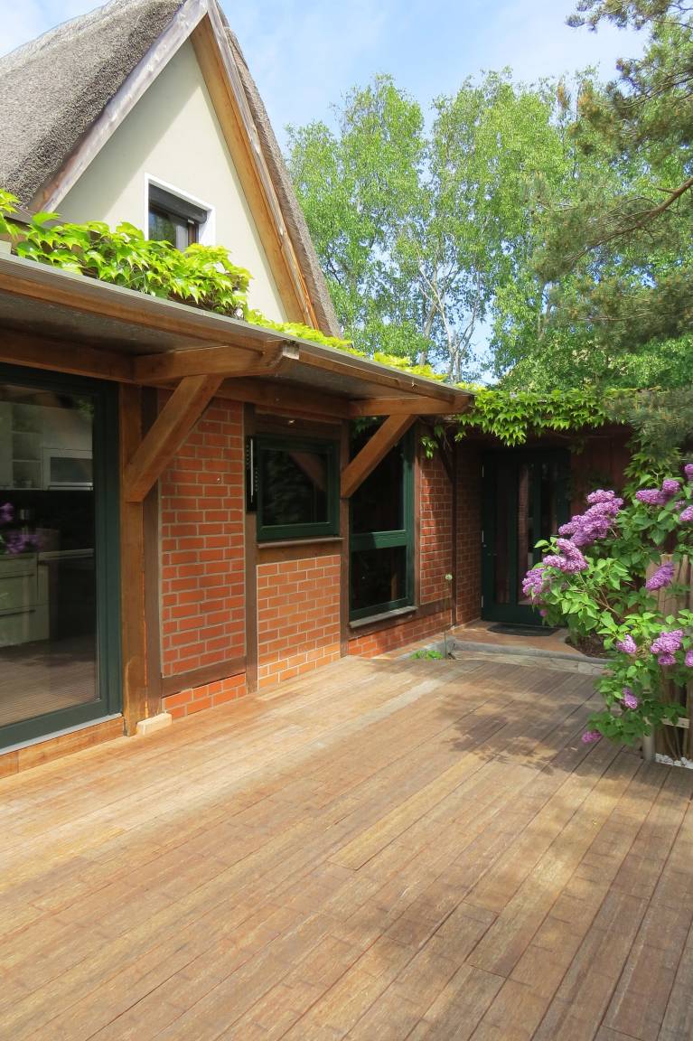 Das Haus mit etwa 130qm Wohnfläche steht auf einem 750qm großen Grundstück. Der kleine Garten ist zum Süden ausgerichtet und mit heimischen Anpflanzungen romantisch eingefriedet. Auch auf der großen Bambusholz-Terrasse genießt man viel Ruhe vom Alltagsgeschehen.