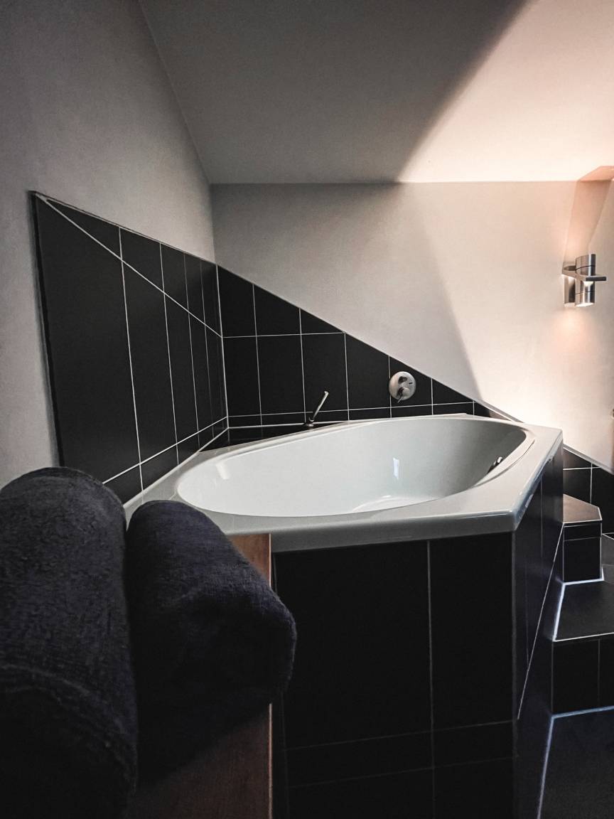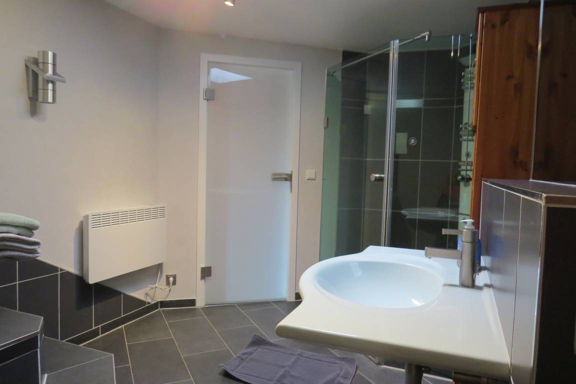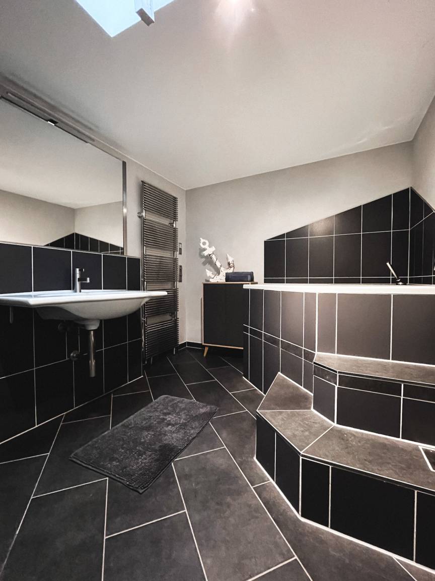 Im hinteren Teil des Hauses befindet sich ein Schlafzimmer mit Doppelbett von 1,80m x 2,00m. Daran angrenzend ist das Hauptbad mit Wanne, Dusche und WC. Ein kleines Gäste-WC mit Waschmaschine und Trockner befinden sich ebenfalls auf dieser Ebene.