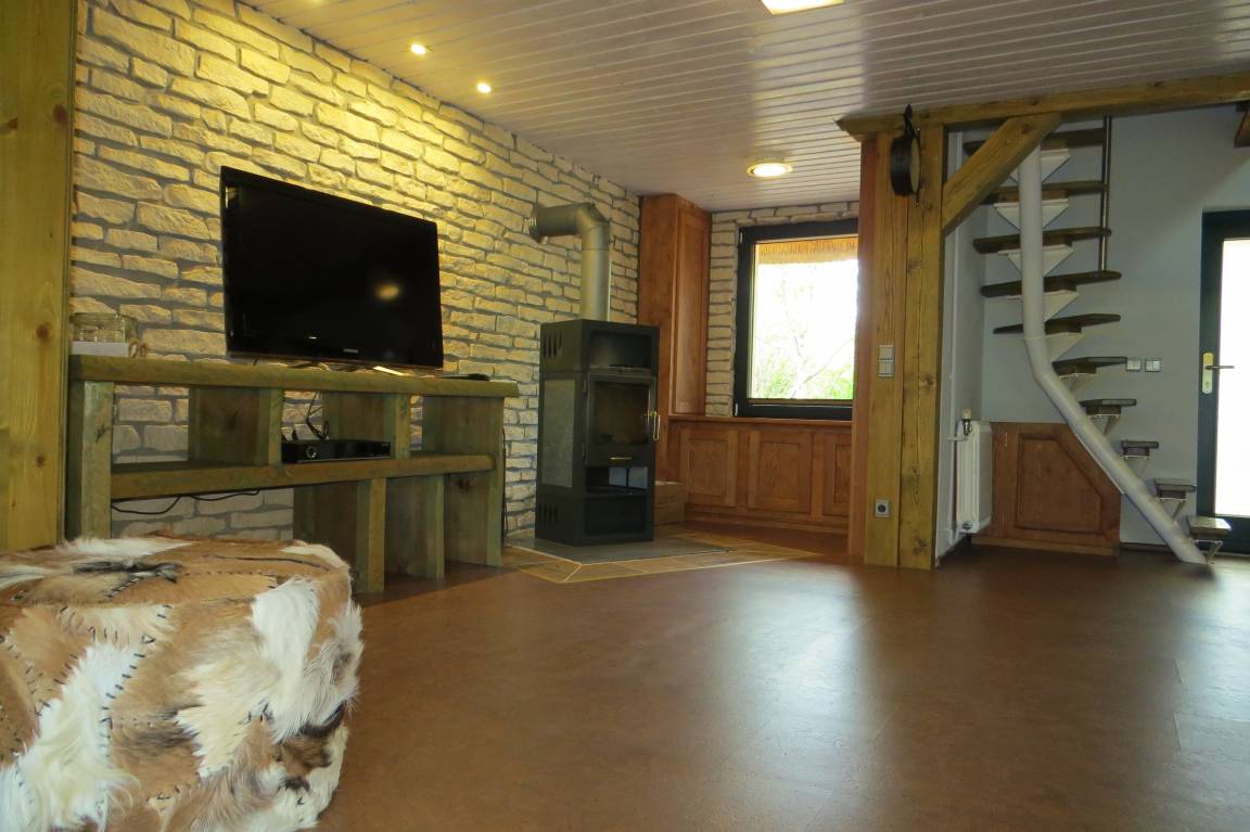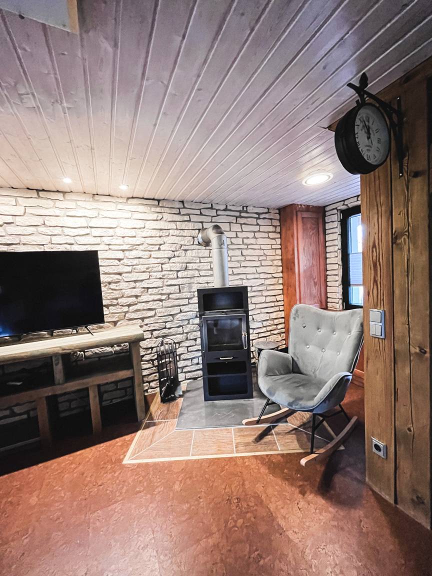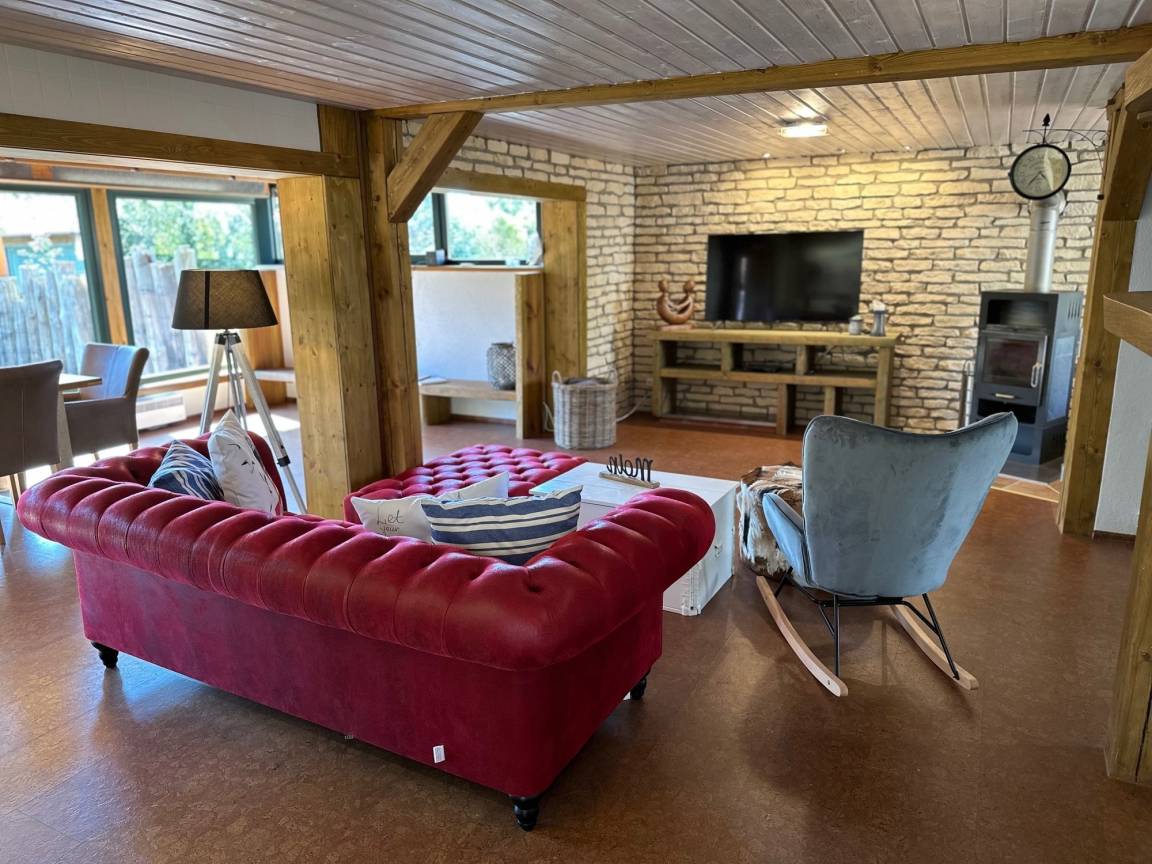 Das Haus verfügt über einen großzügigen Wohnbereich mit Kamin und einem Essbereich mit Blick in den Garten. Nach einem Umbau befindet sich seit Mai 2020 ein kleines Bad mit Dusche und WC neben dem Wohnbereich. Die offene Küche ist modern und vollständig eingerichtet.