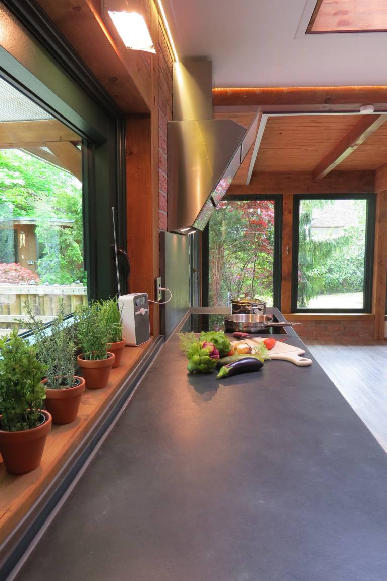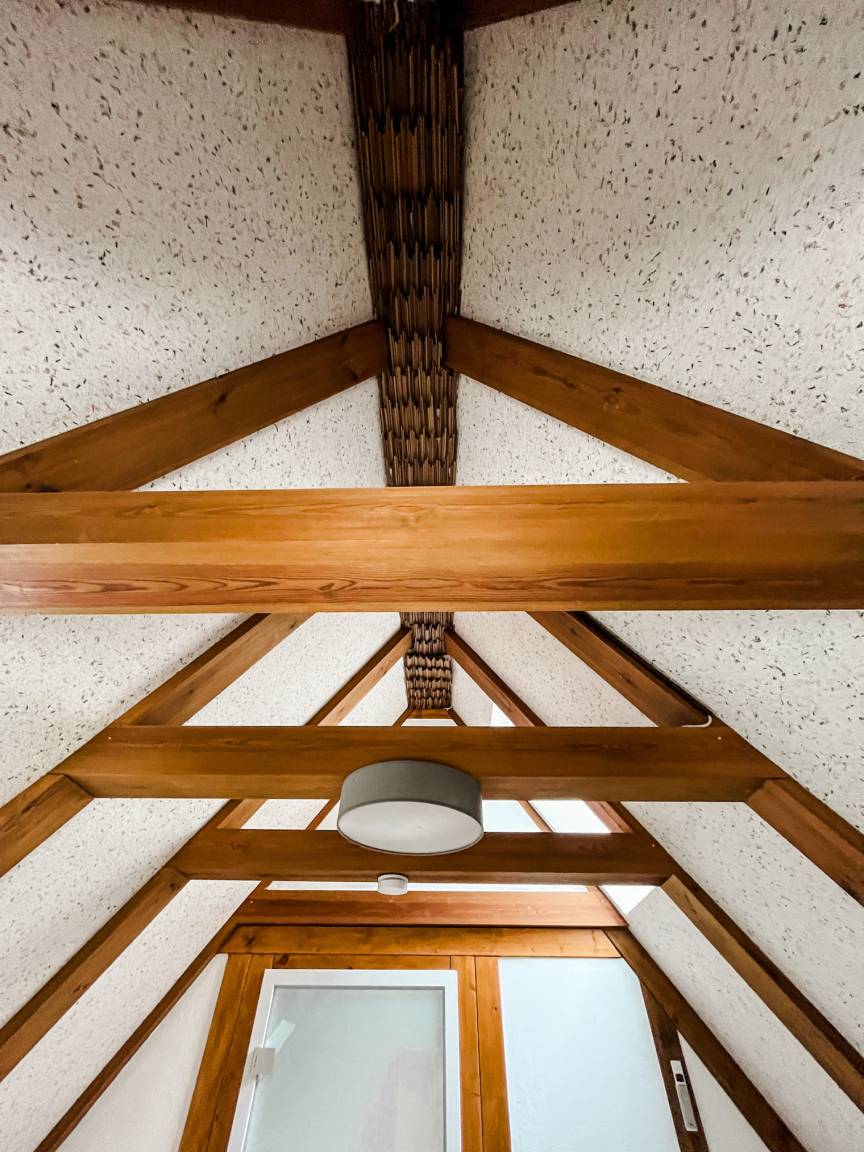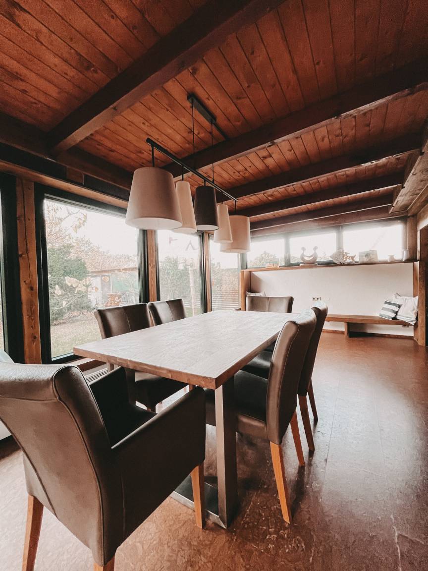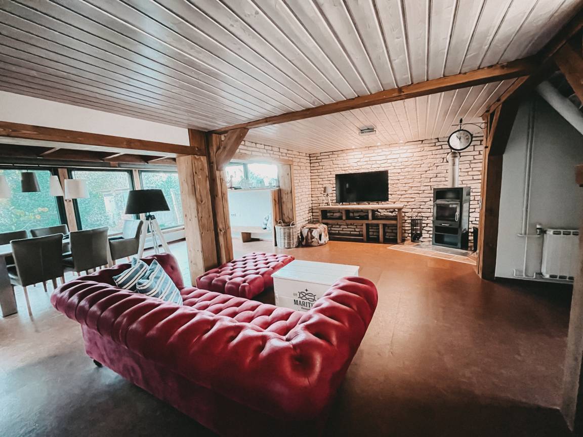 Das Haus verfügt über einen großzügigen Wohnbereich mit Kamin und einem Essbereich mit Blick in den Garten. Nach einem Umbau befindet sich seit Mai 2020 ein kleines Bad mit Dusche und WC neben dem Wohnbereich. Die offene Küche ist modern und vollständig eingerichtet.