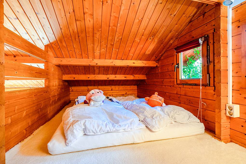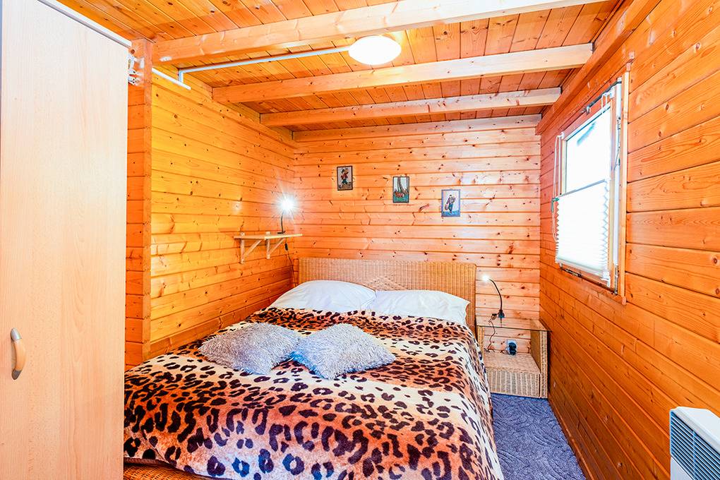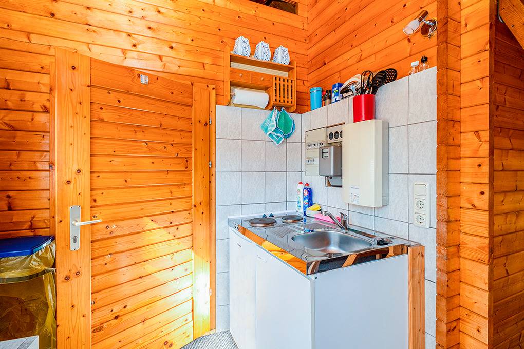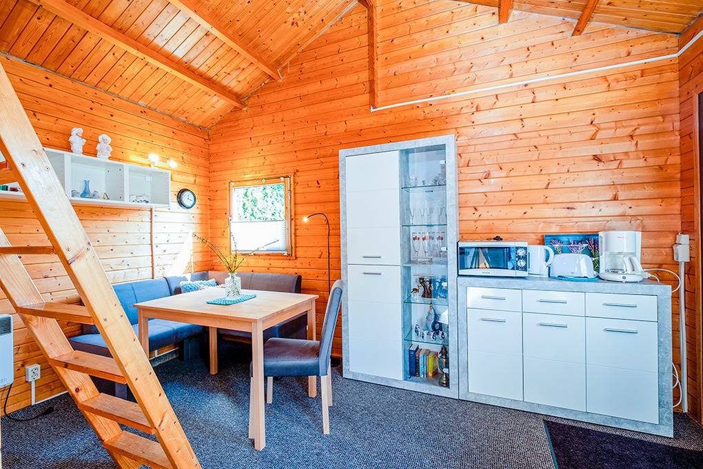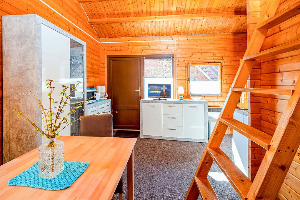 D 61.29 Ferienhaus 2 Erw., 2 Kinder (bis 12 Jahre): 1-Zimmerhaus mit ca. 30 qm Wohnfläche. Wohn-/Schlafraum mit Couchgarnitur, Sat-TV, Esstisch, Küchenblock (2 Pl. E-Herd, Mikrowelle), Doppelbett in Raumnische, Leiter auf Dachboden (eingeschränkte Stehhöhe: 1,20 m) mit 2 Einzelmatratzen für Kinder. Bad/WC.
