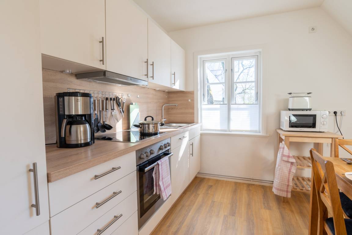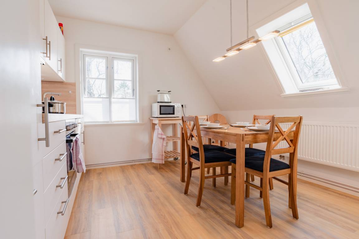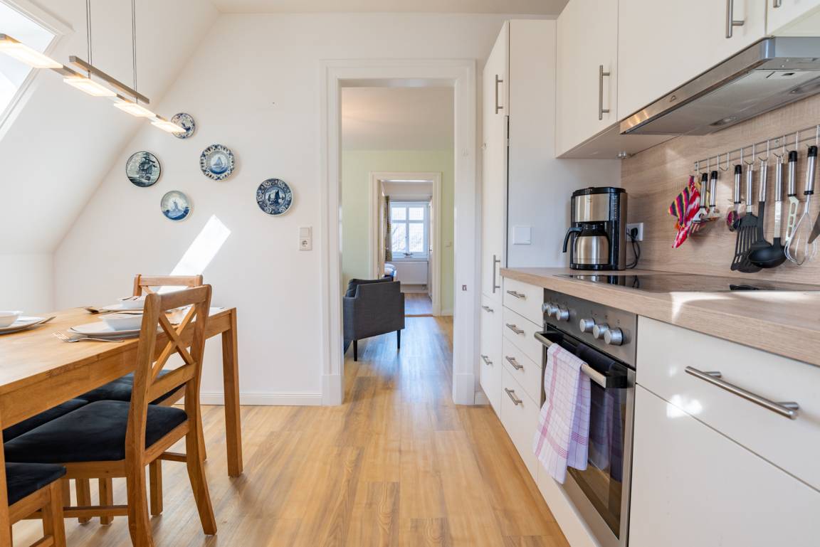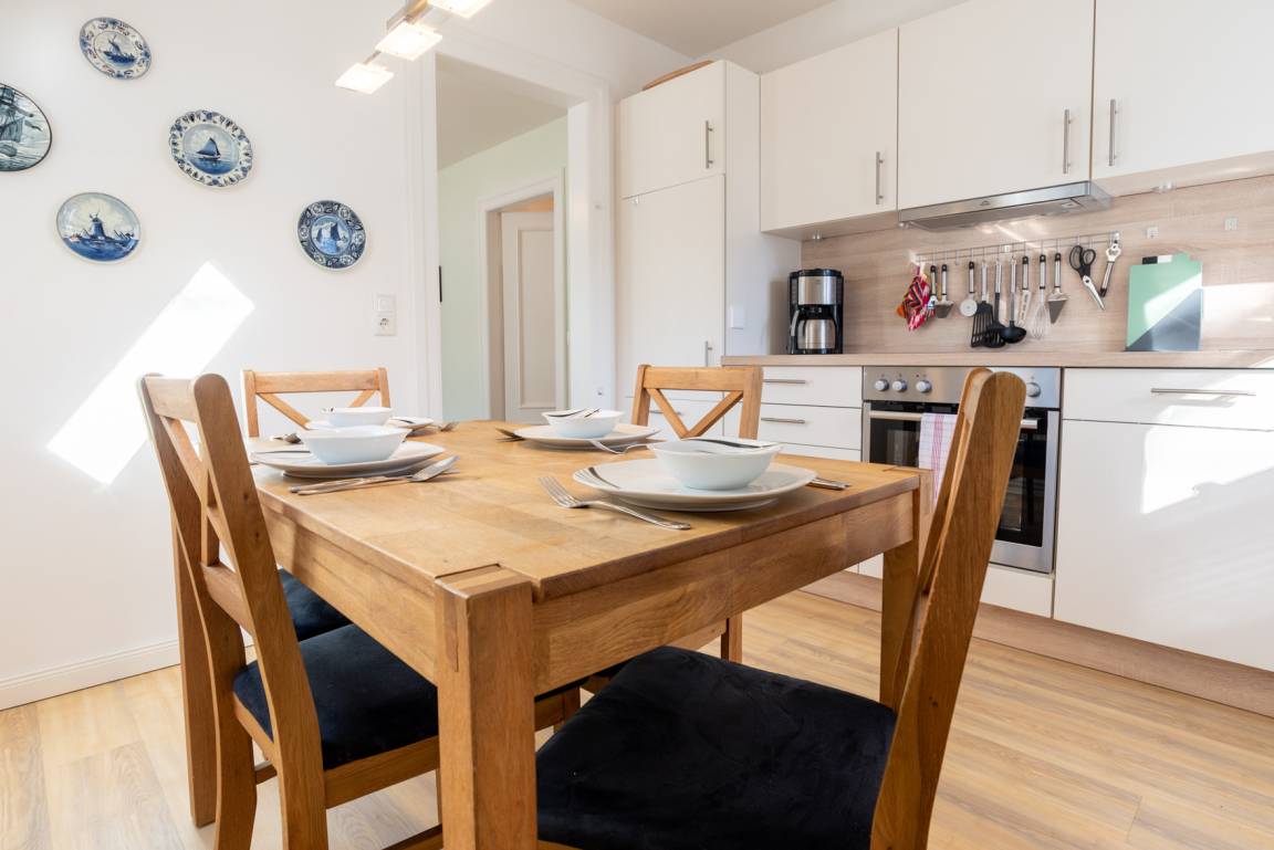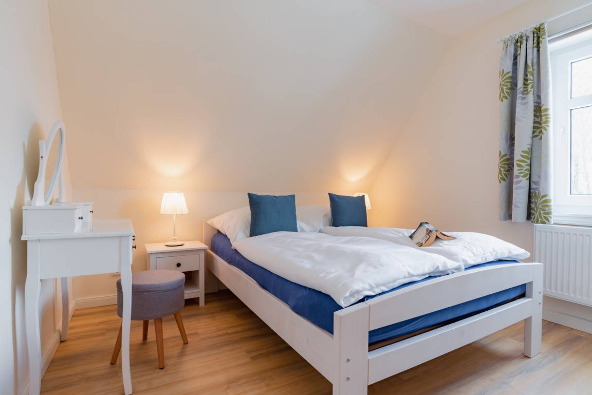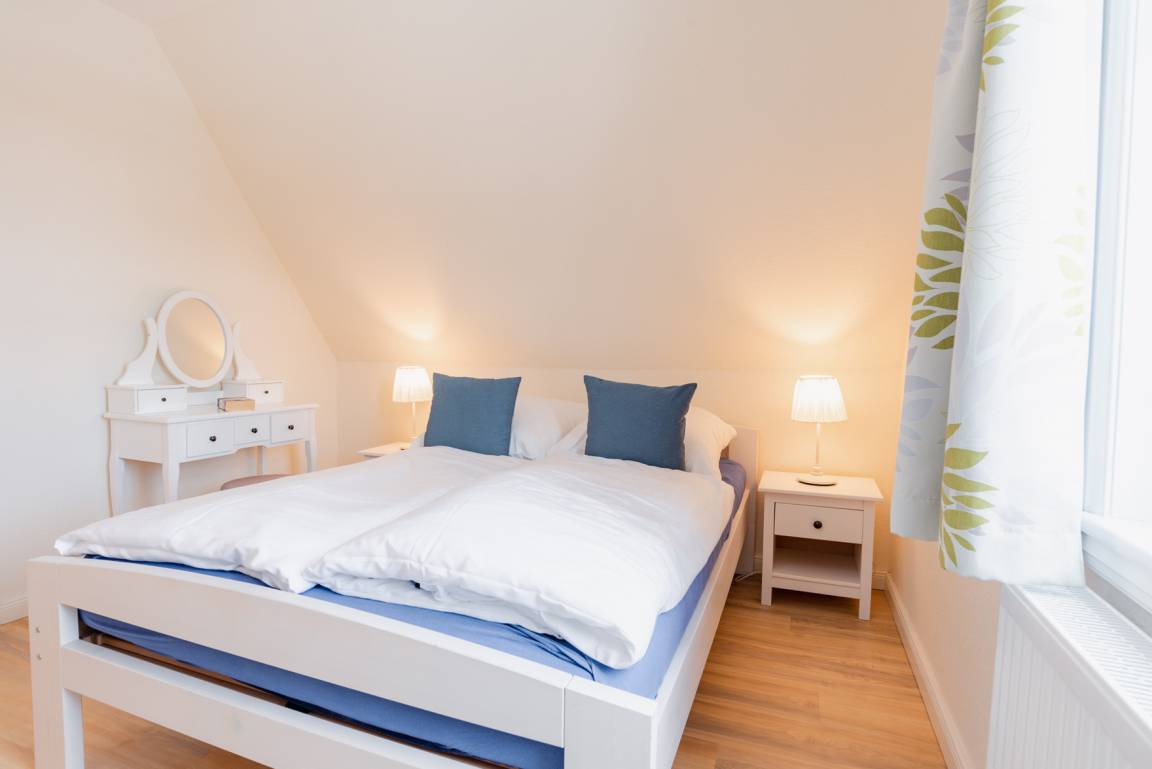 Die Wohnung ist gemütlich eingerichtet. Im Wohnzimmer steht ein Flat-TV zur Verfügung, falls man mal nicht zum Strand möchte. Das Badezimmer ist mit einer Dusche ausgestattet und verfügt über einen Waschtrockner. Die Küche bietet genügend Platz für 4 Personen und hat für Kleinkinder einen Kinderhochstuhl. In beiden Schlafzimmern befinden sich Doppelbetten, in dem großen Schlafzimmer steht ein 180 x 200 cm Bett und in dem kleinen Schlafzimmer ein 140 x 200 cm Bett. Im kleinen Schlafzimmer steht außerdem ein Schminktisch.