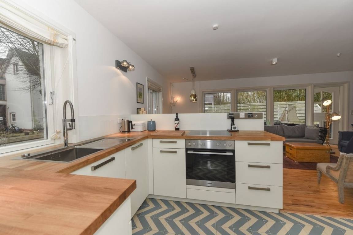 Trotz der zentralen Lage genießen Sie auf dem eingewachsenen Grundstück in einer ruhigen Einbahnstraße erholsame Momente und viel Privatsphäre. Das Haus wurde mit viel Liebe und einem Blick für besondere Details renoviert und überzeugt durch geschmackvolles Design und eine warme, einladende Atmosphäre. Der Kamin im Wohnzimmer mit großem Sichtfenster wird schnell zum Mittelpunkt Ihres Aufenthalts – hier können Sie bei einem prasselnden Feuer entspannen. Große Fensterfronten lassen viel Sonnenlicht in das Haus und sorgen für eine helle, freundliche Stimmung. Der Essbereich bietet genügend Platz für gesellige Runden mit Familie oder Freunden und führt Sie direkt auf die Holzbohlenterrasse mit Gartenmöbeln, wo Sie Ihre Mahlzeiten oder einfach die frische Luft genießen können.