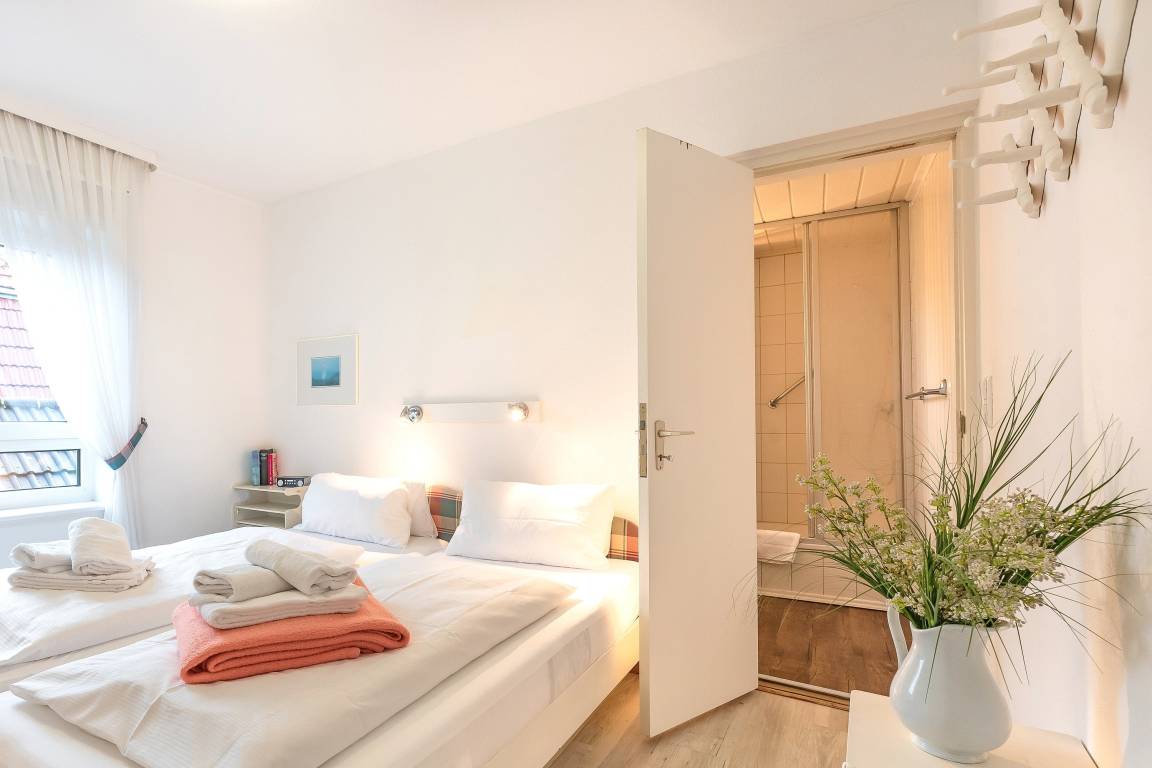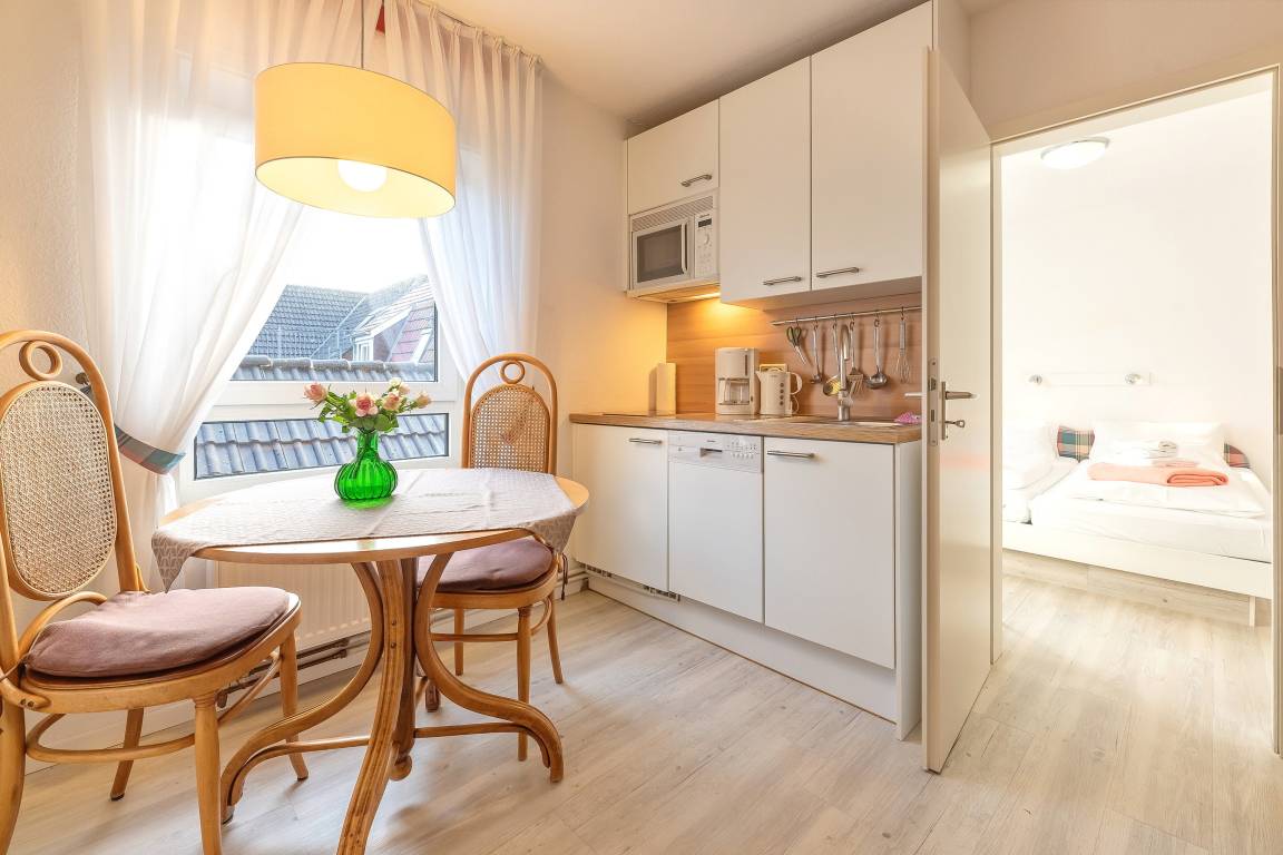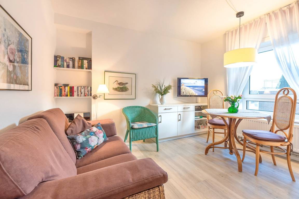 Die kleine aber feine Wohnung "Gröde" liegt ebenfalls im zweiten Stock des Hauses in der Innenstadt und eignet sich ideal für 1 bis 2 Personen. Der Wohnraum mit Sofa, Essecke und kleiner Küchenzeile ist optimal genutzt und liebevoll hergerichtet. Von hier uas gelangen Sie in das Schlafzimmer mit Doppelbett und Kleiderschrank. Das ans Schlafzimmer angrenzende Bad ist mit einer Dusche und einem beleuchteten Spiegel ausgestattet und verfügt zudem über ein kleines Fenster. In der Wohnung Gröde können Sie herrliche Urlaubstage mitten in der Wyker Innenstadt erleben.