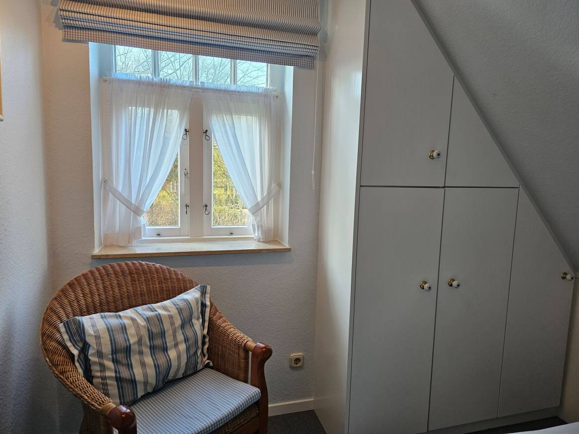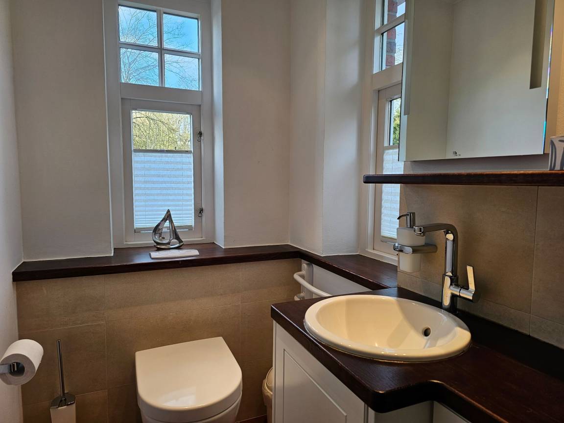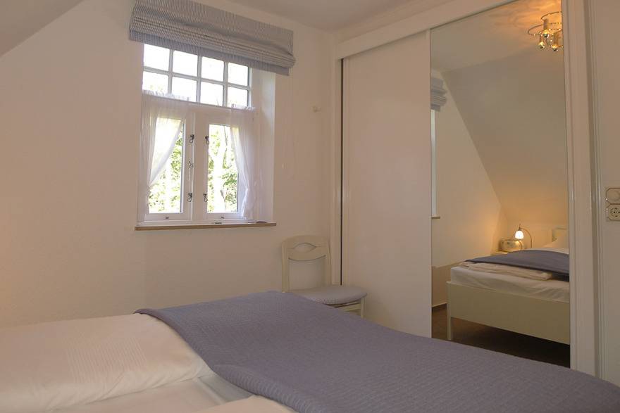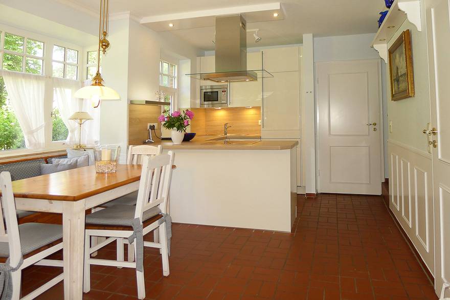 Im Erdgeschoß der Wohnung befindet sich ein Vorflur mit Gäste-WC, eine voll ausgestattete Küche inkl. Waschtrockner, ein Essplatz, eine gemütliche Couch, ein Mylin-Kachelofen für kühle Abende sowie eine Terrasse mit Strandkorb (während der Saison) und angrenzendem Garten. Im Obergeschoss befinden sich 2 Schlafzimmer und ein Duschbad (Badewanne mit Trennwand).
