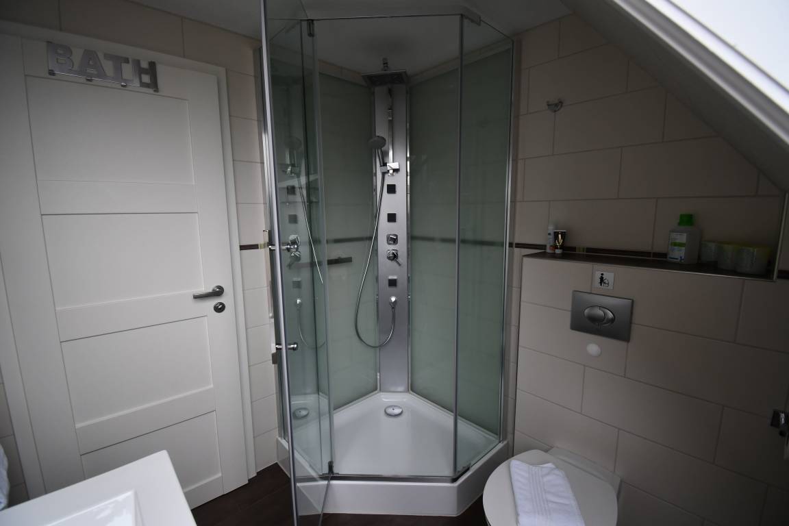 Alleinreisende oder Paare finden in dieser Unterkunft in einem Wohnzimmer mit einem Sofa und einem Schlafzimmer mit Doppelbett ausreichend Platz. Das Badezimmer ist mit Regendusche ausgestattet.