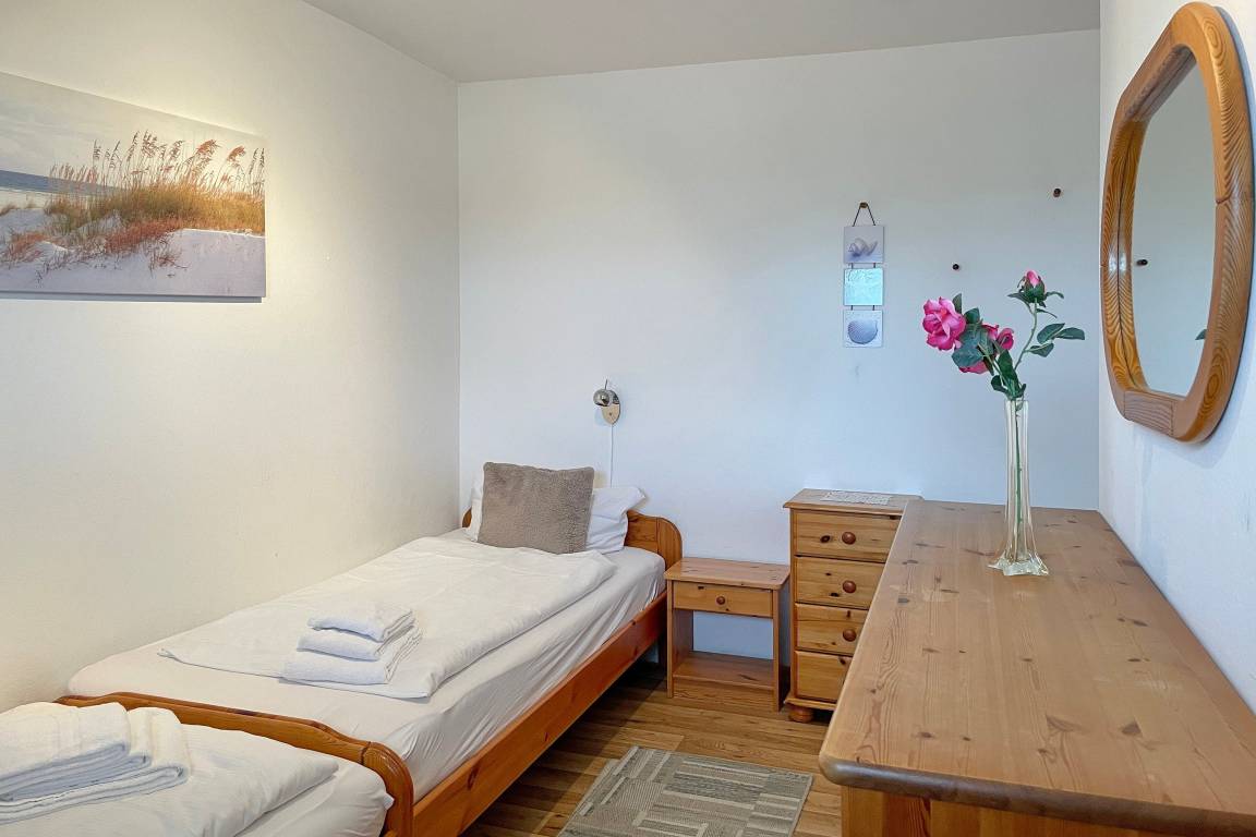 Warme Holzmöbel und eine bequeme Sitzgarnitur im Wohnbereich mit WLAN geben der Wohnung einen einladenden Charakter. Im Wohnzimmer befindet sich weiterhin eine gemütliche Essecke, die direkt am großen Fenster steht und ein Schrankbett (90 x 190 cm), welches eine weitere Schlafmöglichkeit für 1 Person anbietet. Von hier gelangen Sie auch auf den Südbalkon und können die Föhrer Nordseeluft atmen, den Möwen beim Fliegen zuschauen und das Meeresrauschen erleben. Das Schlafzimmer mit zwei Einzelbetten (90 x 200 cm) und Einbauschrank sorgt für eine angenehme Nachtruhe. Das kleine Bad mit Dusche ist hell und funktional und in der modern gestalteten separaten Küche mit Backofen, Ceranfeld und Geschirrspüler lassen sich kleine Gerichte wunderbar zubereiten, wenn Sie nicht in eines der vielen Cafés und leckeren Restaurants speisen möchten, die Sie überall in der Innenstadt finden werden. Kaum gehen Sie aus dem Haus haben Sie sämtliche Einkaufsmöglichkeiten, Cafés und Restaurants sowie natürlich Strand und Meer in unmittelbarer Nähe. Dem Haus stehen insgesamt 15 PKW-Stellplätze zur Verfügung, von denen Sie gerne einen Nutzen können falls er frei ist. Ansonsten ist fußläufig der große Inselparkplatz erreichbar. Genießen Sie den Erholungswert dieser Wohnung und schalten Sie vom Alltag ab. Erleben Sie entspannte Tage ohne Hektik sondern lassen Sie sich den Nordseewind ins Gesicht wehen und spüren Sie den feinen Sand des Strandes unter Ihren Füßen.