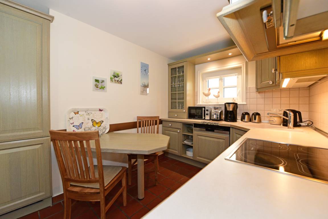 Die voll ausgestattete Küche mit Geschirrspüler, Mikrowelle, Backofen, großem Kühlschrank mit Tiefkühlfach und einem gemütlichen Bistrotisch lädt zu entspannten Kaffeepausen ein. Hier können kreative Köche ihre Talente zeigen und für kulinarische Abwechslung sorgen.