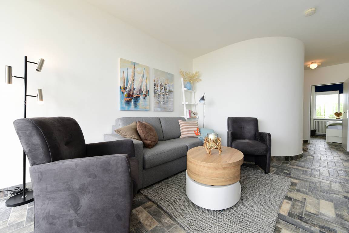 Der Wohnbereich überzeugt mit moderner Unterhaltungstechnik sowie einer bequemen Sitzgarnitur, die zu entspannten stunden einlädt.