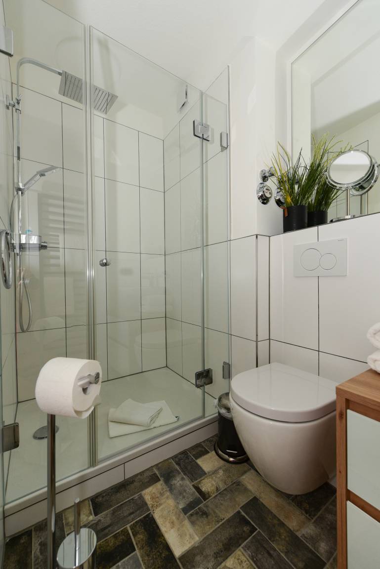 Das moderne Duschbad mit Regendusche rundet alles ab.
