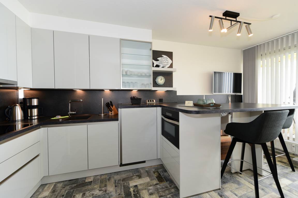 Die Küchenzeile ist harmonisch in den Wohnbereich integriert und vollständig ausgestattet mit Wasserkocher, Cerankochfeld, Kaffeemaschine, Backofen und vielem mehr.