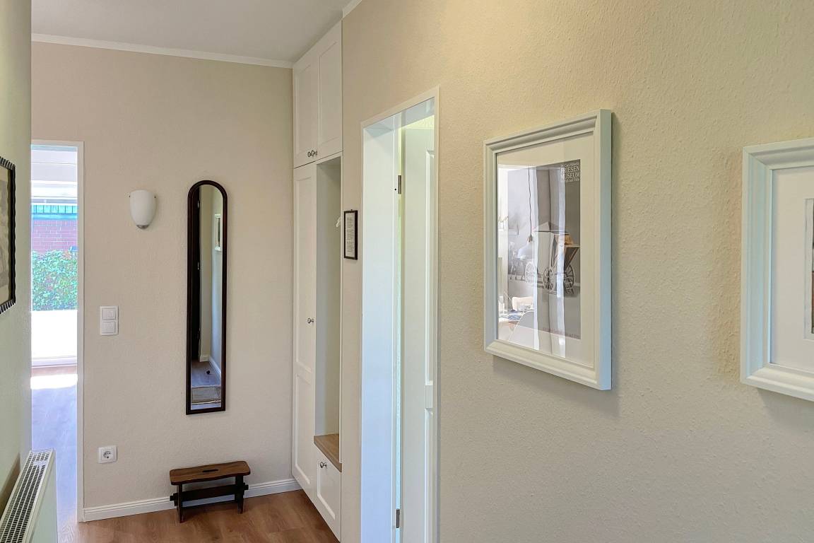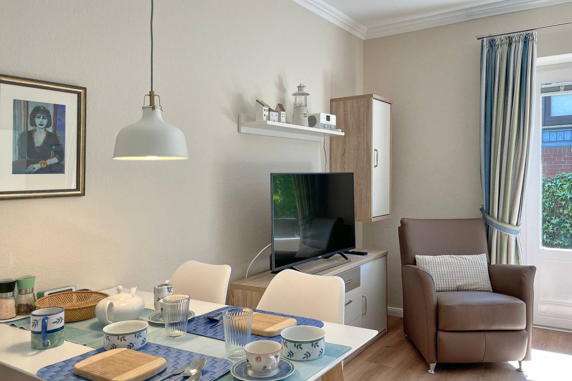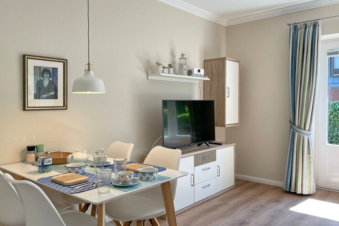 Zentral und doch ruhig in zweiter Reihe am Sandwall liegt unsere geschmackvoll eingerichtete Ferienwohnung Norderaue nur wenige Gehminuten entfernt von der Wyker Innenstadt mit den kleinen, netten Geschäften, gemütlichen Cafés und gastfreundlichen Restaurants, dem Meerwasserwellenbad Aqua Föhr und natürlich der Nordsee. Im Sommer lädt der feinsandige Strand und das Wattenmeer mit seinen Gezeiten zu Ausflügen unterschiedlichster Art ein sei es ein Badetag mit Relaxen am Strand oder die Erkundung des Lebensraums vieler Tierarten bei einer Wattwanderung. Die Norderaue ist eine hübsche Erdgeschosswohnung für 2 Personen (Mindestalter 6 Jahre). Mit viel Liebe zum Detail haben die Eigentümer hier ein Wohlfühldomizil erschaffen. Der großzügige Wohnschlafraum mit einem hochwertigen Doppelschrankbett (160x 200 cm), Flachbild-TV, W-Lan und einer modernen Essgruppe lädt zum Entspannen ein. Von hier aus gelangen Sie auf die windgeschützte Terrasse mit Gartenmöbeln und einer Marquise. Weiterhin gehört zur Wohnung ein separates Schlafzimmer mit beleuchtetem Kleiderschrank und einem Einzelbett (90x200 cm), ein modernes Bad mit Fußbodenheizung und Fenster, Dusche mit flachem Einstieg (ca. 5 cm) und Haltegriff. Die raffiniert im Flurbereich integrierte Küche mit Ceranfeldherd, Mikrowelle, Geschirrspüler und Kaffeemaschine ist sehr gut ausgestattet. Erleben Sie herrliche Urlaubstage auf Föhr bei und in der Norderaue. Wir freuen uns auf Ihren Besuch!