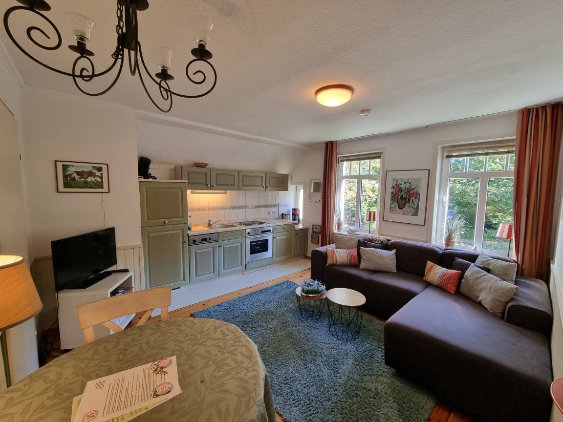 Der helle, offene Wohnbereich vereint eine Einbauküche mit allem Komfort für Selbstversorger, einen gemütlichen Essbereich sowie eine behagliche Sitzecke zum Entspannen.