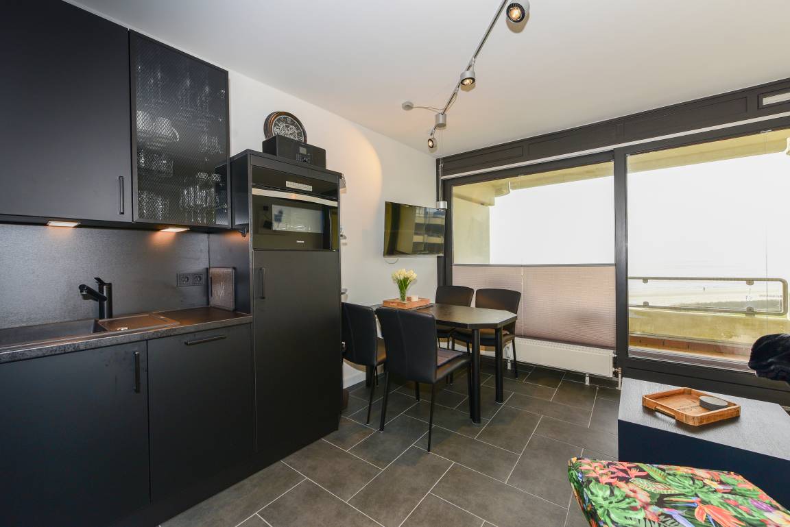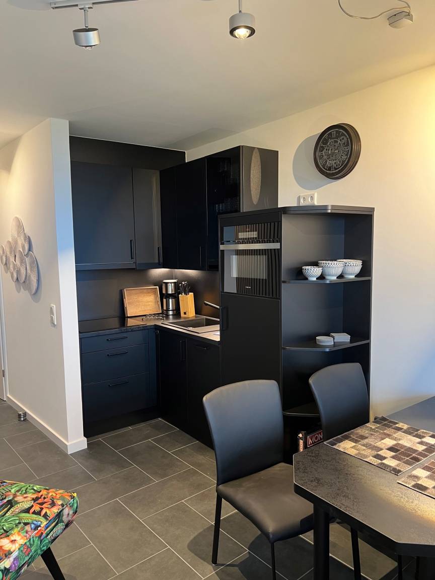 Die harmonisch in den Wohnbereich integrierte Küchenzeile lässt keine Wünsche offen: mit Wasserkocher, Induktionsherd, Spülmaschine und einem Backofen auf Arbeitshöhe steht Ihnen eine vollständig ausgestattete Küche für Ihre kulinarischen Abenteuer zur Verfügung.