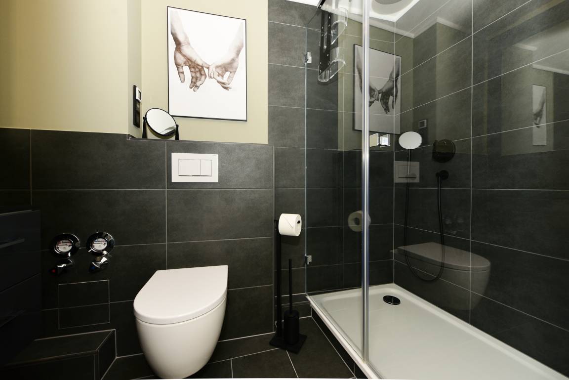 Das moderne Duschbad überzeugt mit einer Fußbodenheizung, einem Haartrockner sowie einem Radio.