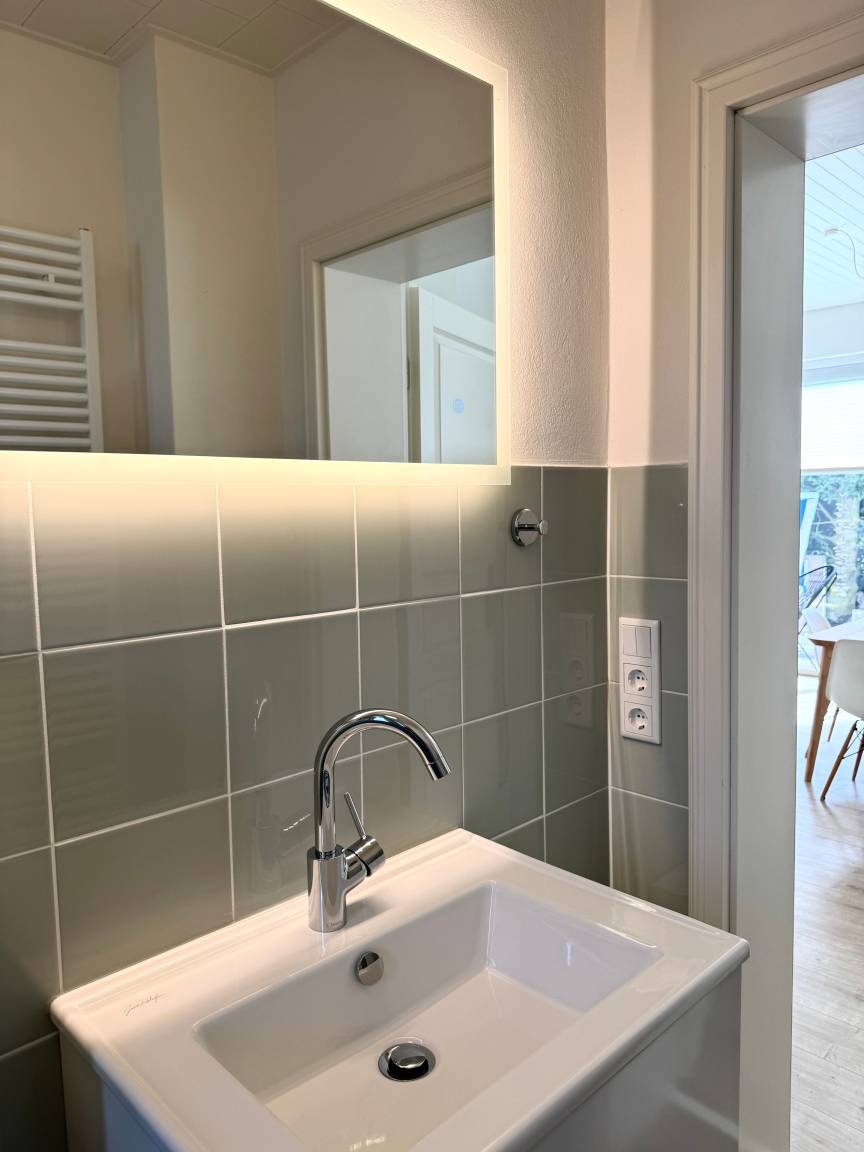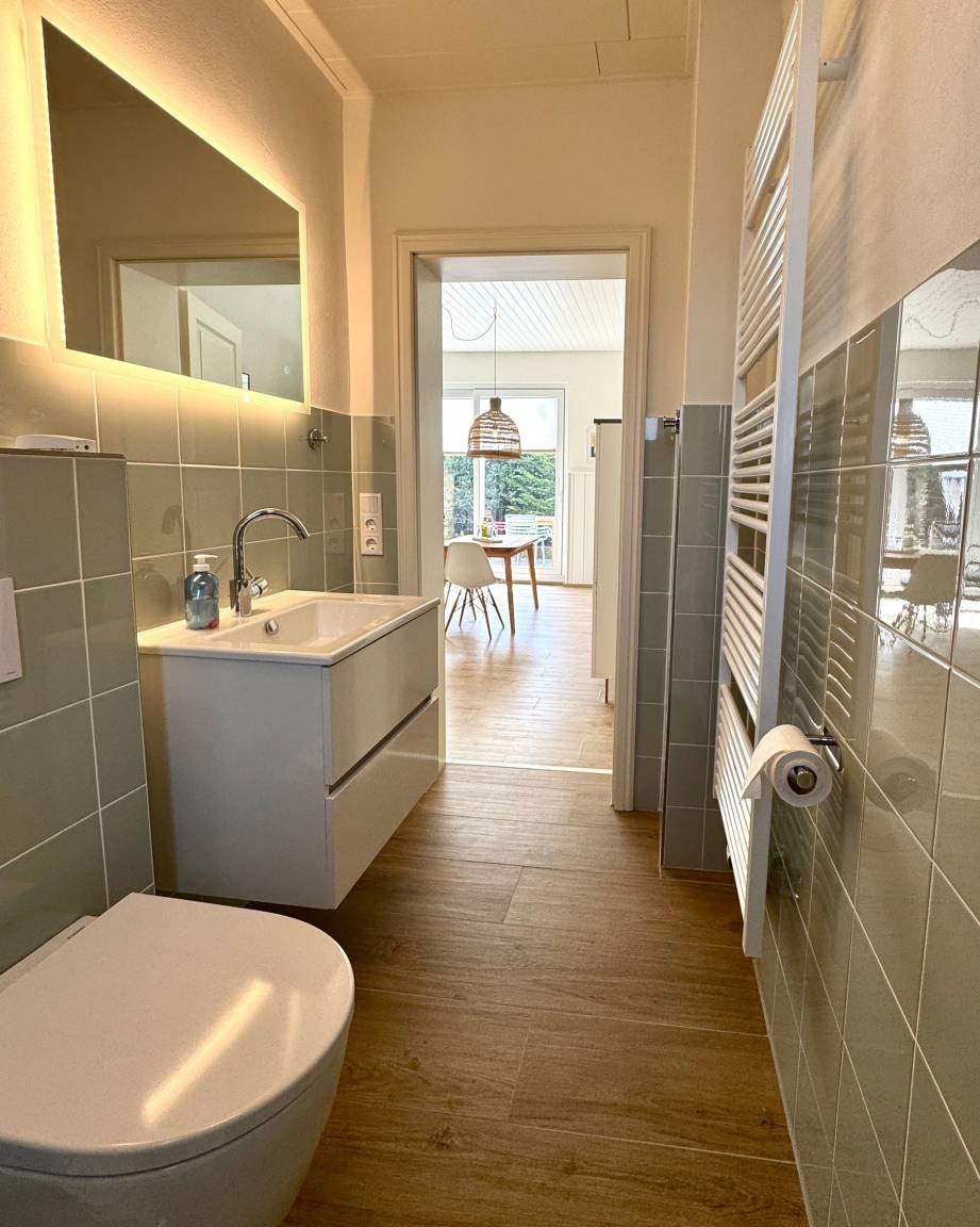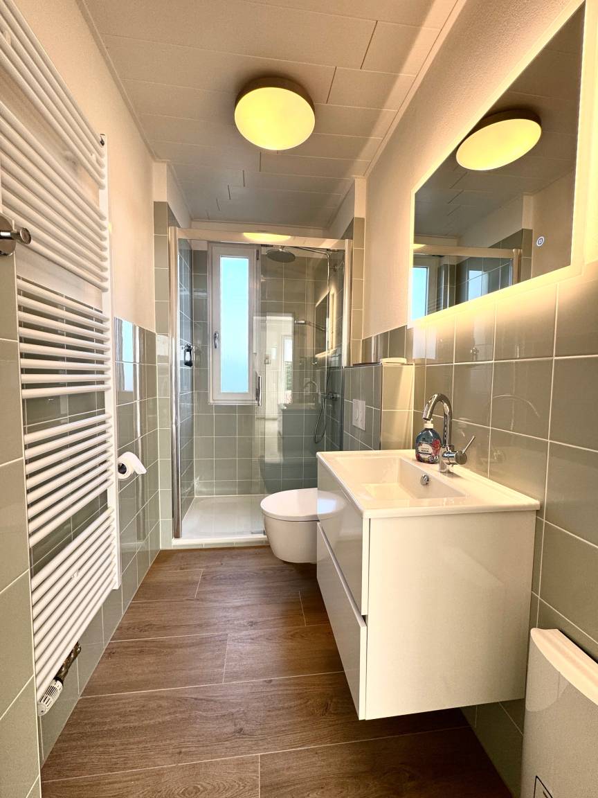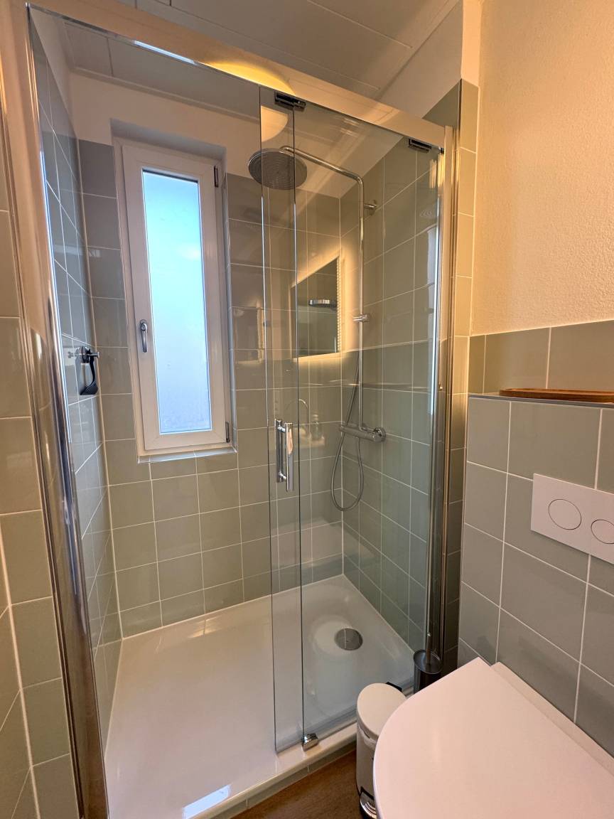 Für noch mehr Wellness sorgt das moderne und helle Bad mit Tageslicht. Flachwanne mit Regendusche und Handbrause, Anti-Beschlagspiegel mit verschiedenen Lichteinstellungen sowie Wand- und Bodenfliesen in warmen Farbtönen machen den Start in den Tag ebenso perfekt wie das Ende.