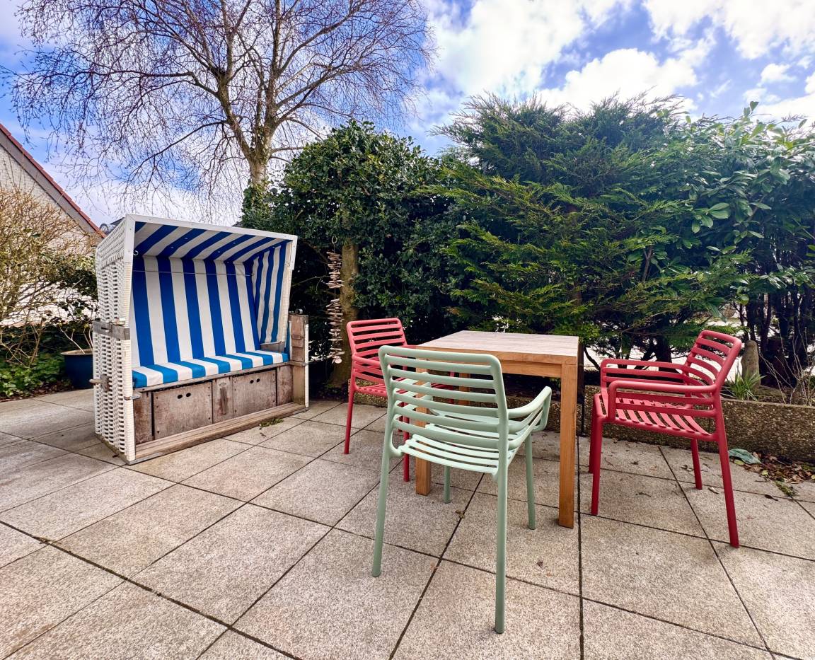 Der helle, in freundlichen Farben gestaltete Wohnraum im "Südnest" bietet Ihnen eine behagliche Lounge-Atmosphäre mit großem Sofa und Sat-TV sowie einen Essplatz. Sie blicken direkt auf die durch eine Hecke geschützte Terrasse mit Strandkorb und schönen Gartenmöbeln. Hier können Sie durch die Süd-Ost-Ausrichtung viele sonnige Stunden genießen. Durch einen kleinen Spalt in der Hecke sind sogar das Meer und die Hallig Langeneß zu sehen.