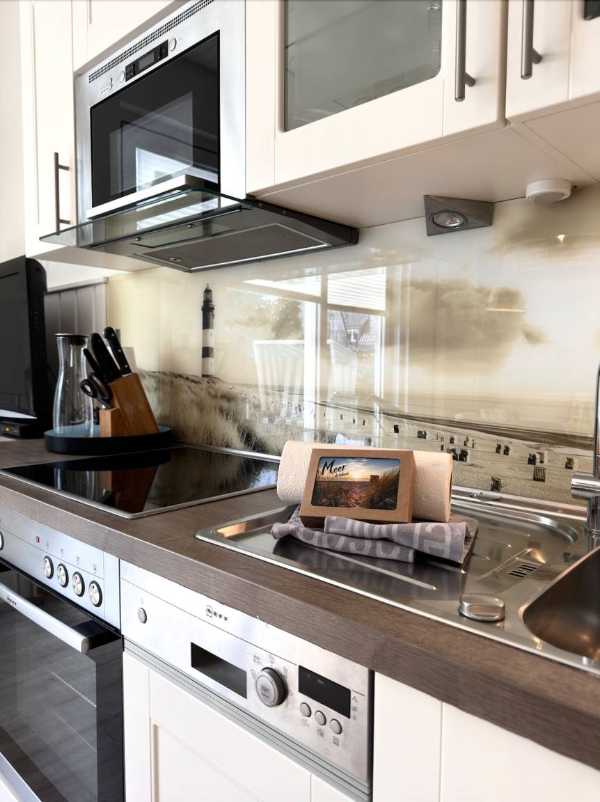 In unmittelbarer Umgebung finden Sie verschiedene Einkaufsmöglichkeiten, Restaurants und Cafés. Das lebendige Zentrum von Wyk und den Fährhafen erreichen Sie mit einem etwa 20-minütigen Spaziergang über die schöne Strandpromenade.
