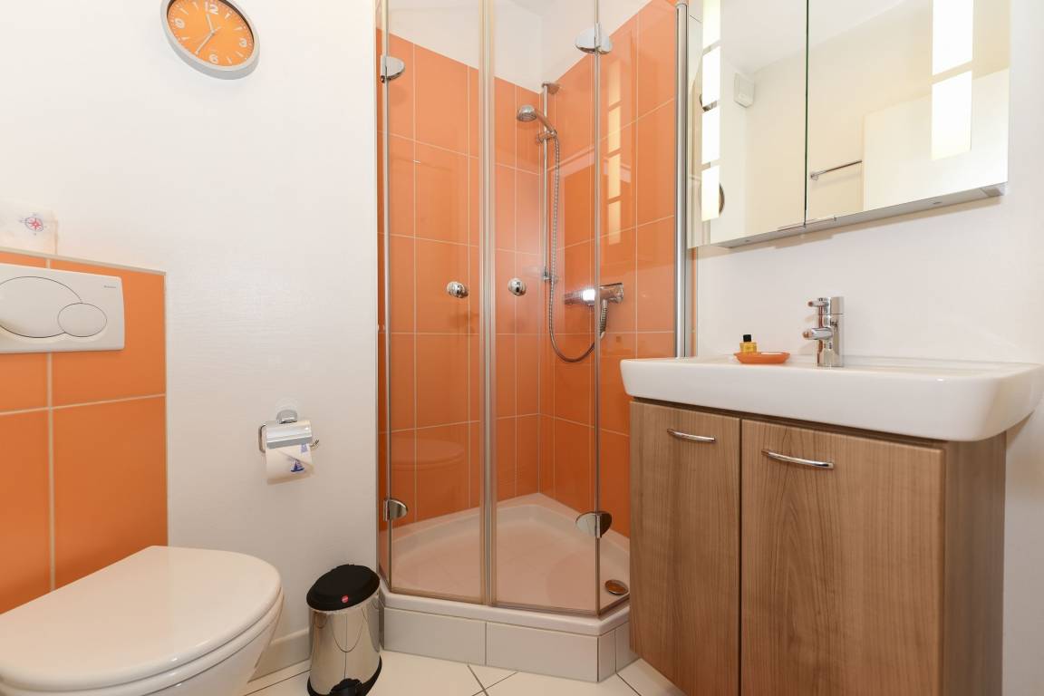 Das moderne und farbenfrohe Duschbad bringt mit seiner frischen Gestaltung gute Laune in Ihre Urlaubstage.