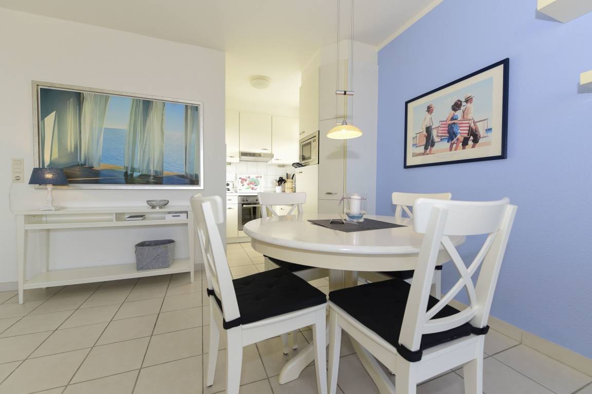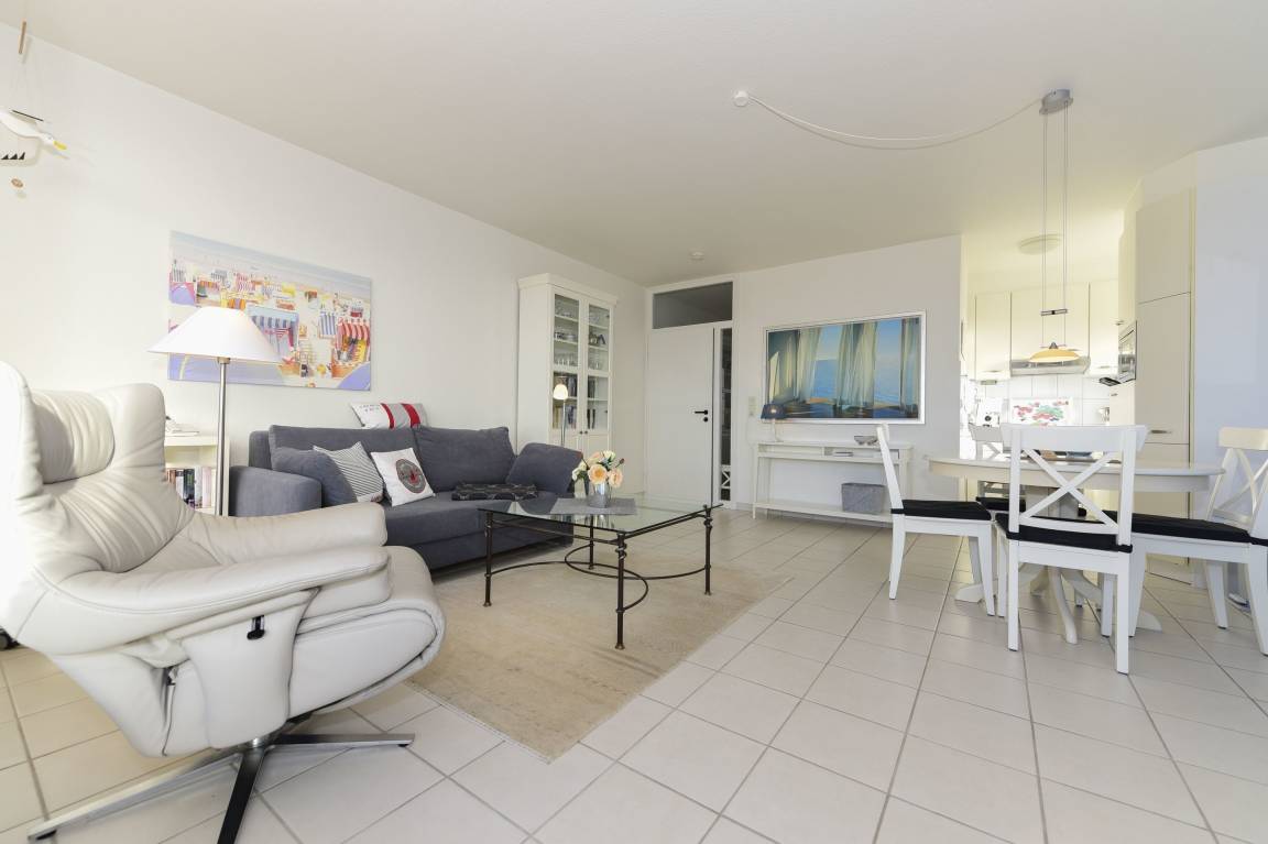 Die liebevoll eingerichtete Wohnung lädt mit ihrem lichtdurchfluteten Wohnbereich zum Entspannen und Wohlfühlen ein. Die Sitzecke mit moderner Unterhaltungstechnik bietet einen gemütlichen Rückzugsort, während die großen Fenster den Raum in natürliches Licht tauchen und einen herrlichen Ausblick auf das Meer ermöglichen.