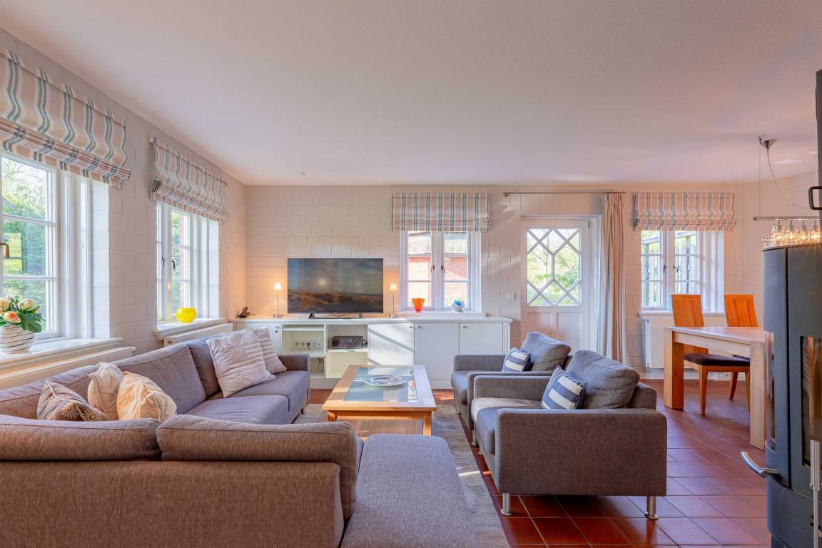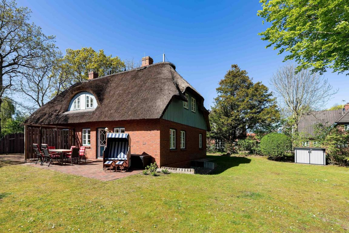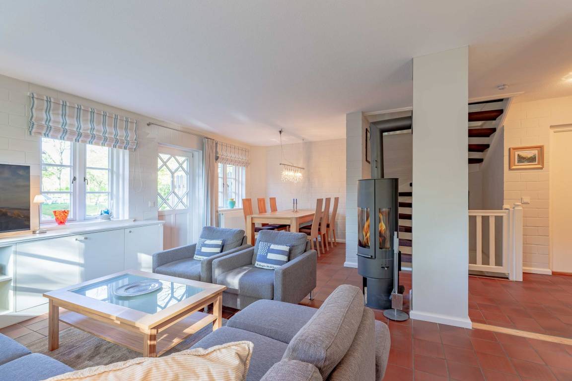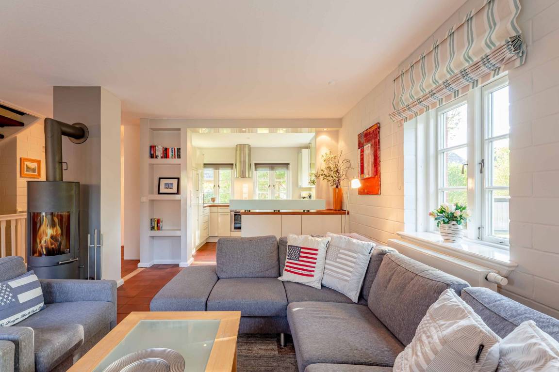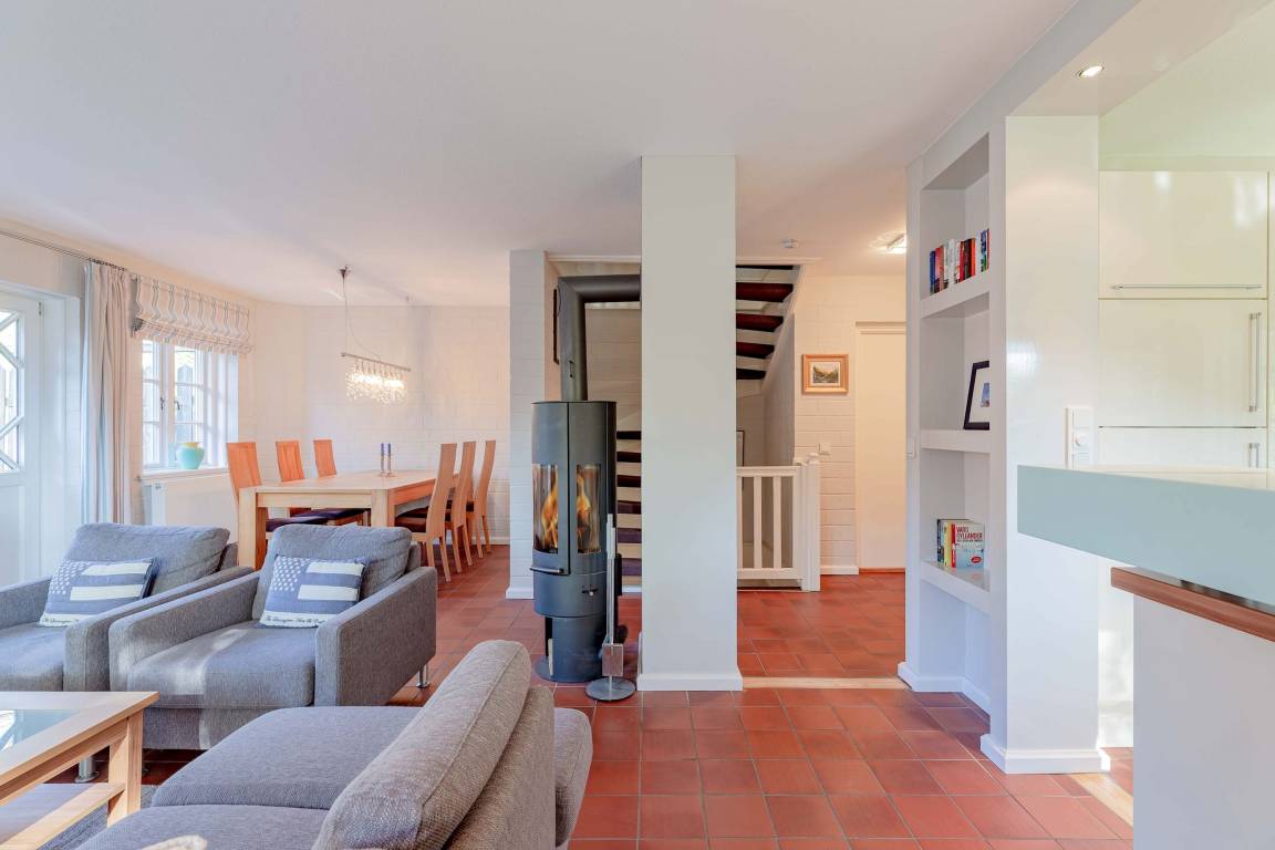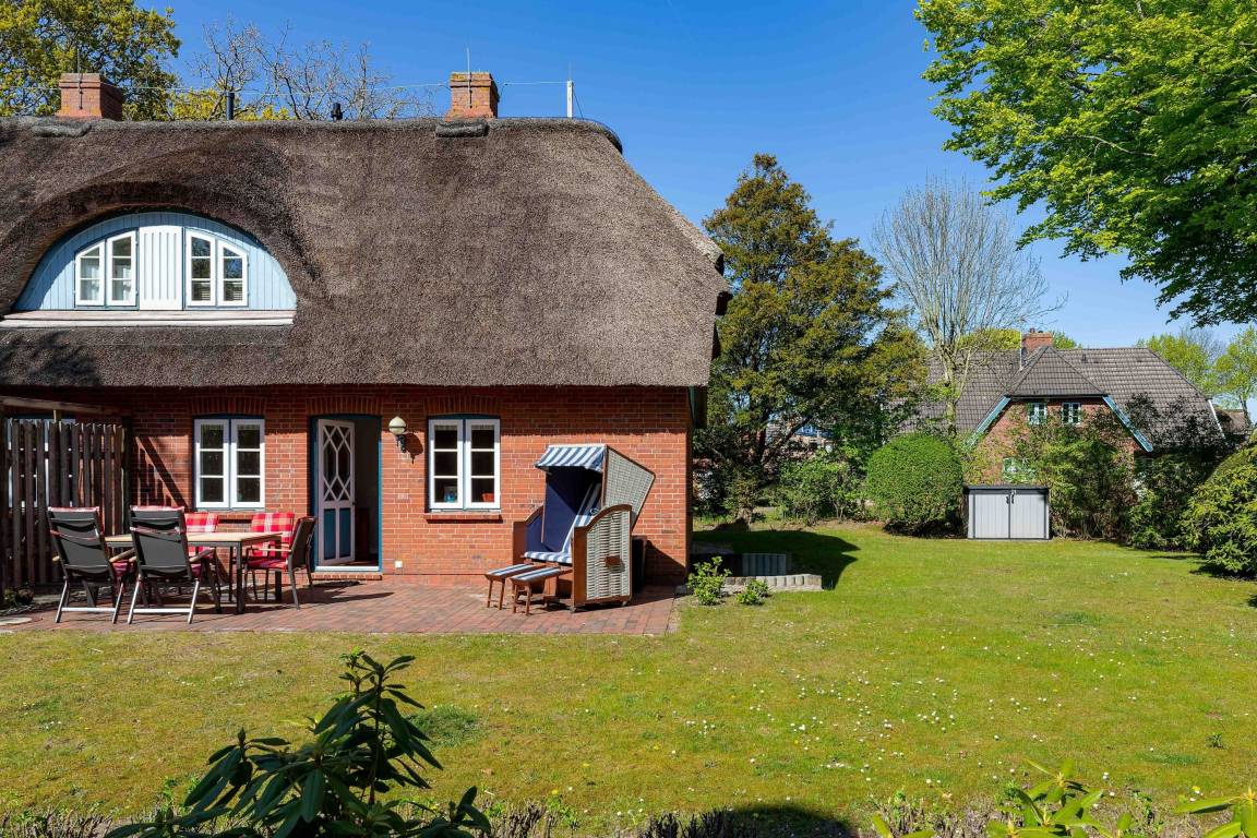 Diese Reetdachdoppelhaushälfte im friesischen Baustil auf einem parkähnlichen Grundstück liegt nur 150m vom Südstrand entfernt. Am Rande des Garten wurde der alte Baumbestand des Kurparks erhalten. Im Erdgeschoss befinden sich ein großes Wohnzimmer mit Essbereich und direktem Zugang zur Südterrasse. Gartenmöbel und Strandkorb warten hier auf Sie. In der kalten Jahreszeit schafft der drehbare Kaminofen eine behagliche Atmosphäre. Im Obergeschoss befinden sich zwei Schlafräume sowie ein begehbares Ankleidezimmer. Das moderne Badezimmer mit Waschtisch und Badewanne lädt zur Entspannung ein. Im Souterrain befindet sich die Sauna, sowie eine Dusche und ein kleiner Hauswirtschaftsraum mit Waschmaschine und Trockner.