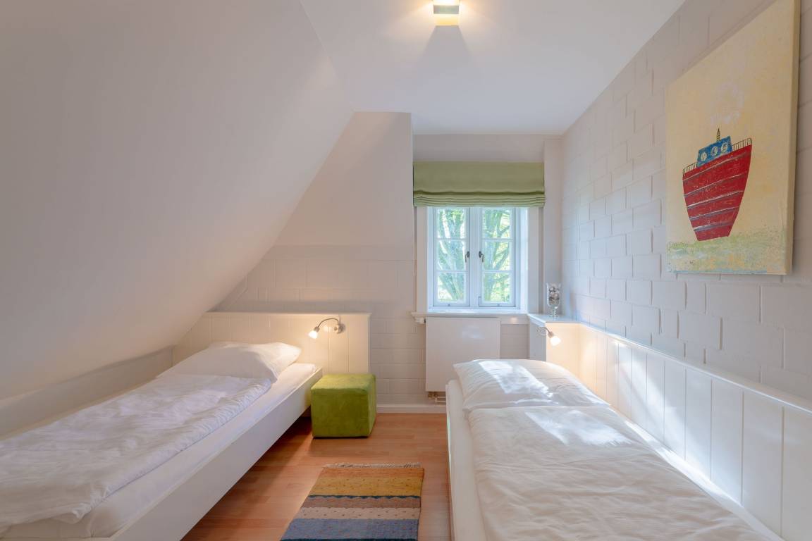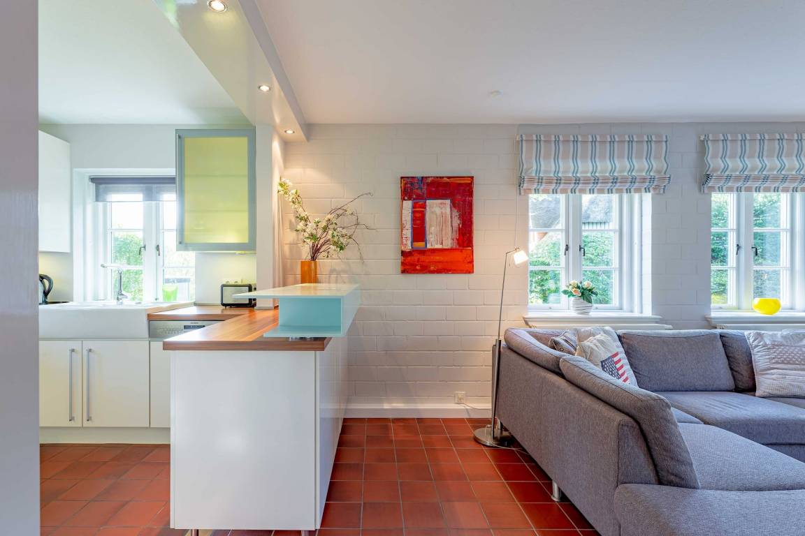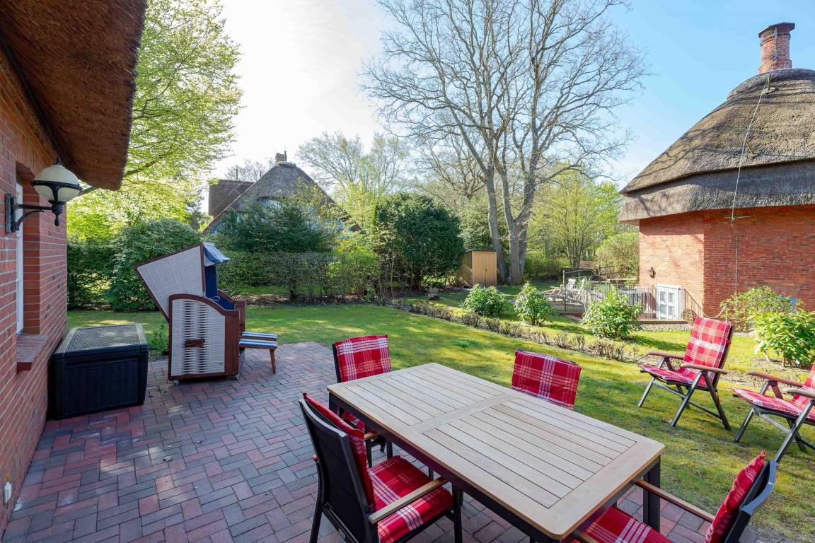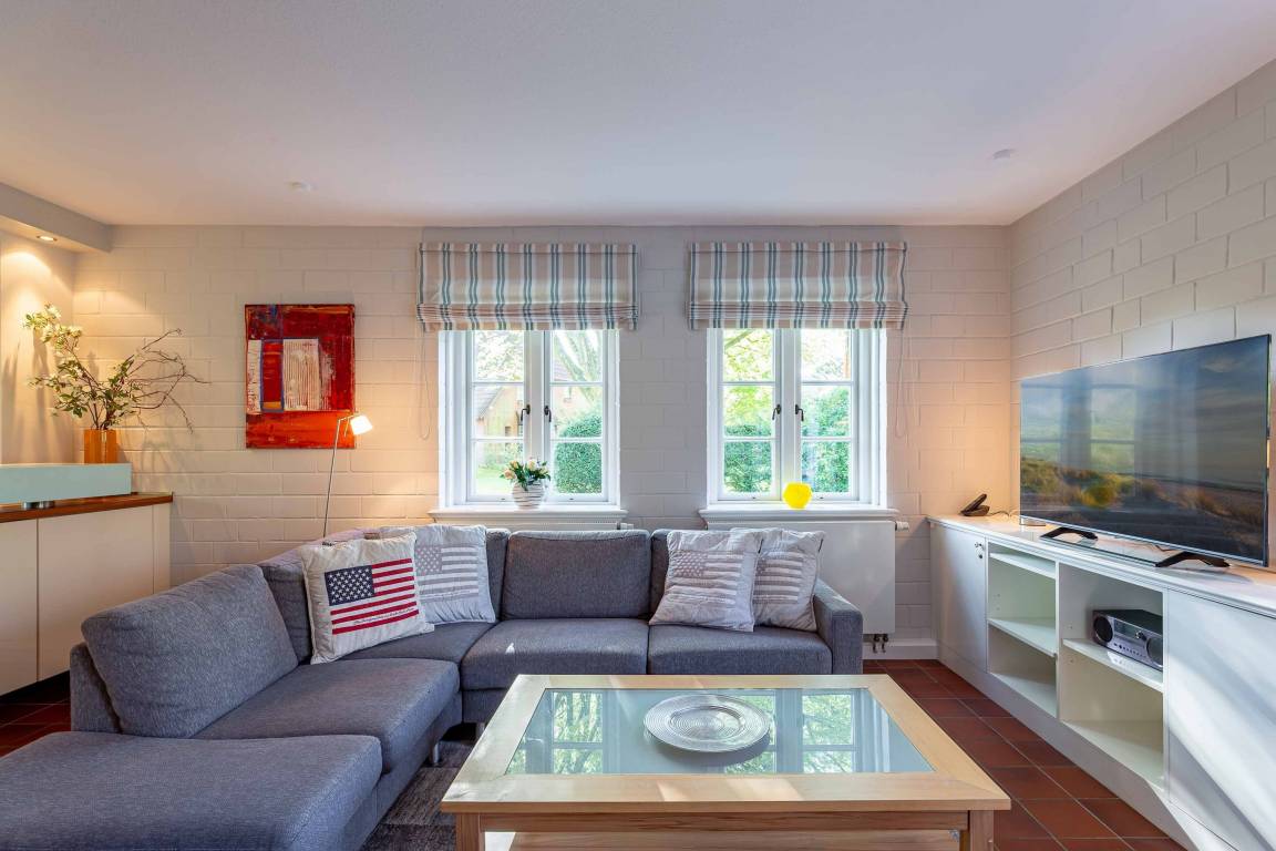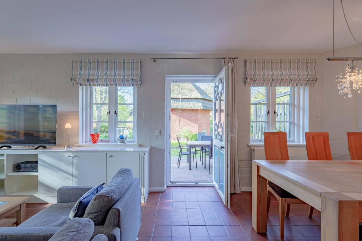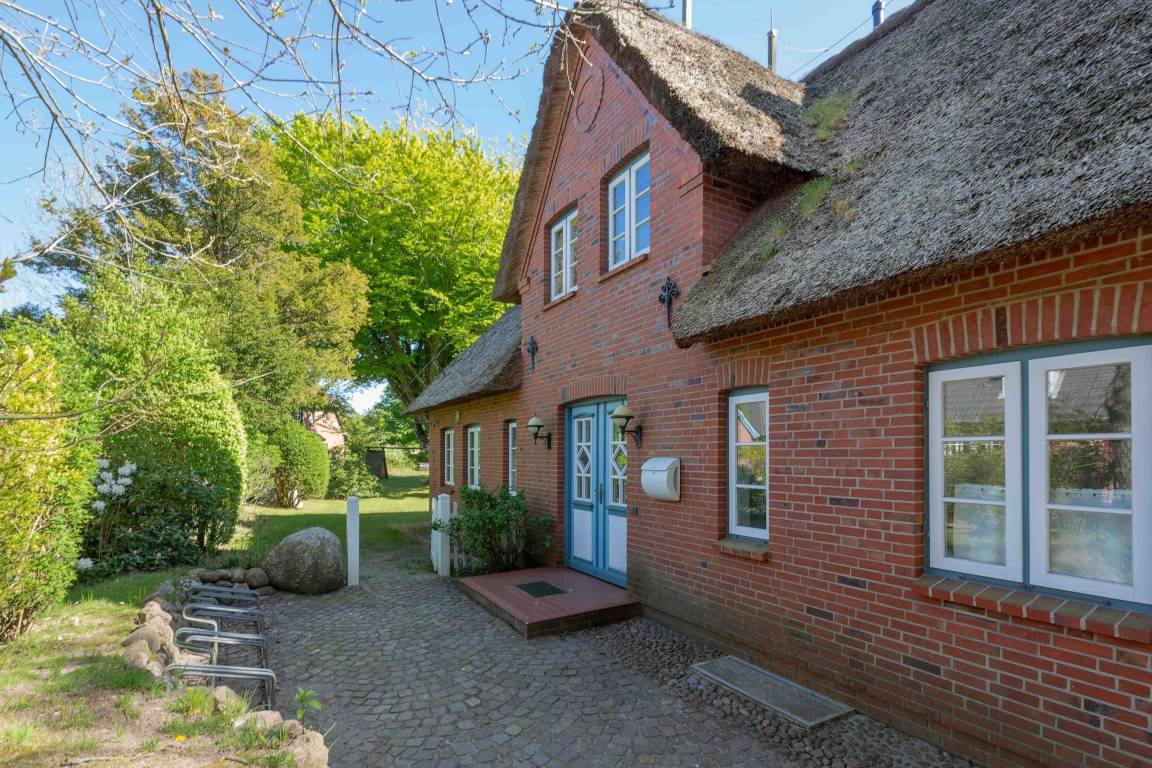 Diese Reetdachdoppelhaushälfte im friesischen Baustil auf einem parkähnlichen Grundstück liegt nur 150m vom Südstrand entfernt. Am Rande des Garten wurde der alte Baumbestand des Kurparks erhalten. Im Erdgeschoss befinden sich ein großes Wohnzimmer mit Essbereich und direktem Zugang zur Südterrasse. Gartenmöbel und Strandkorb warten hier auf Sie. In der kalten Jahreszeit schafft der drehbare Kaminofen eine behagliche Atmosphäre. Im Obergeschoss befinden sich zwei Schlafräume sowie ein begehbares Ankleidezimmer. Das moderne Badezimmer mit Waschtisch und Badewanne lädt zur Entspannung ein. Im Souterrain befindet sich die Sauna, sowie eine Dusche und ein kleiner Hauswirtschaftsraum mit Waschmaschine und Trockner.