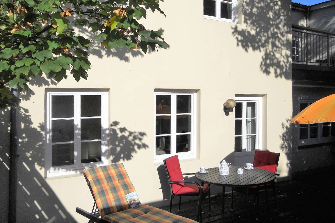 Das Galeriehaus ist ein historisches Gebäude von Wyk, welches außen immer noch den einstigen Charme von vergangenen Zeiten aufweist, doch innerhalb der Fassade umgebaut und renoviert wurde. Jetzt befinden sich im Galeriehaus 4 Wohnungen für je 2 Personen. Die zentrale Lage zur Innenstadt, dem Strand und der Nordsee, dem Meerwasserwellenbad Aqua Föhr und zu den Einkaufläden machen unsere Wohnungen im Galeriehaus sehr beliebt. Die Erdgeschoßwohnung PIcasso lädt Sie und auf Wunsch Ihren Hund zu herrlichen Urlaubstagen ein. Der gemütliche Wohnraum, die Essecke und die Küche sind harmonisch aufeinander abgestimmt und das offene Wohnkonzept verleiht der Wohnung seinen besonderen Charme. Liebevolle Accessoires, der Flachbild-TV, eine Stereoanlange, die einladende Essecke mit Freischwingerstühlen und die gut ausgestattete Küche mit Ceranfeld-Backofen, Dunstabzugshaube, Kühlschrank mit Gefrierfach, Kaffeemaschine (Senseo Duo) und Wasserkocher sorgen dafür, dass man sich sogleich wohlfühlt. Vom Wohnzimmer aus gehen Sie auf die Terrasse, die sich geschützt liegend im Hinterhof befindet und im Sommer mit Gartenmöbeln bestückt ist ( ca. von April bis September). Das Schlafzimmer mit Boxspringbett, Spiegel und geräumigen Kleiderschrank wirkt behaglich. Das modern gestaltete Bad ist ansprechend und funktional.
