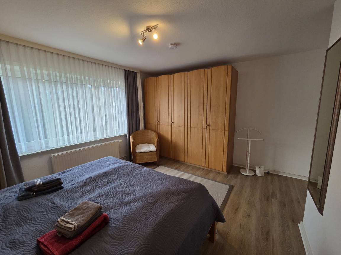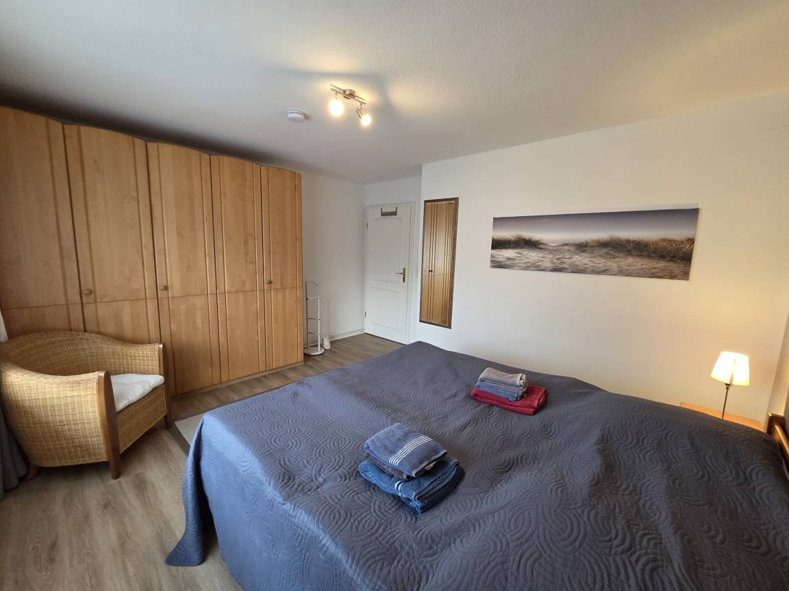 Das Schlafzimmer ist mit einem Doppelbett (1,80 × 2,00 m) mit geschlossenem Fußende sowie einem Kleiderschrank ausgestattet.