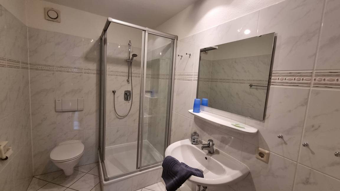 Im Badezimmer befinden sich WC, Waschbecken, Dusche sowie ein Föhn.