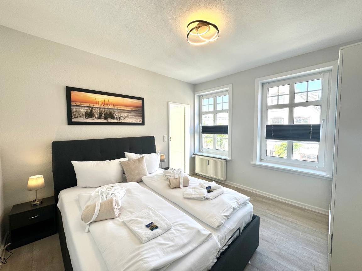 Zwei großzügige Schlafzimmer mit komfortablen Boxspring-Doppelbetten bieten Ihnen erholsame Nächte nach langen Strandspaziergängen. Eines der Schlafzimmer verfügt über ein angeschlossenes Vollbad mit Badewanne, Dusche, WC und Bidet – ein Ort zum Abschalten und Entspannen. Ein weiteres, separates Duschbad sorgt für zusätzlichen Komfort.