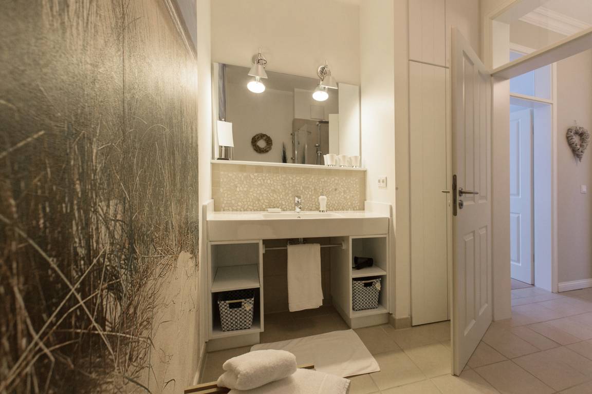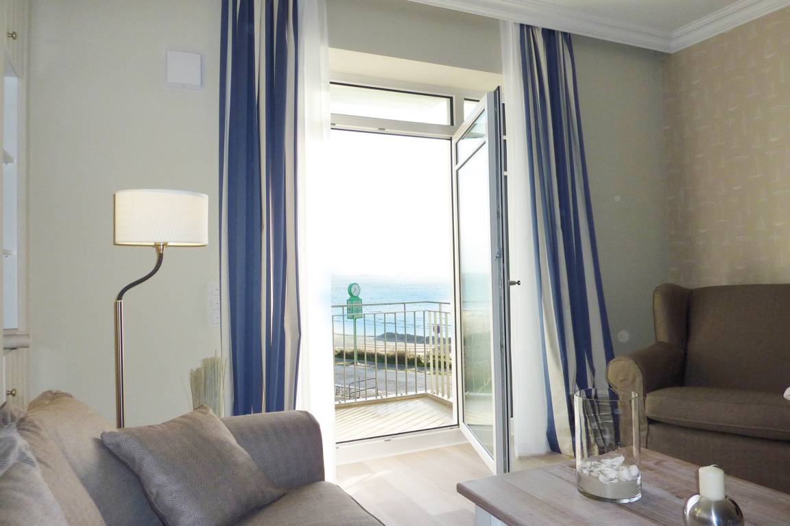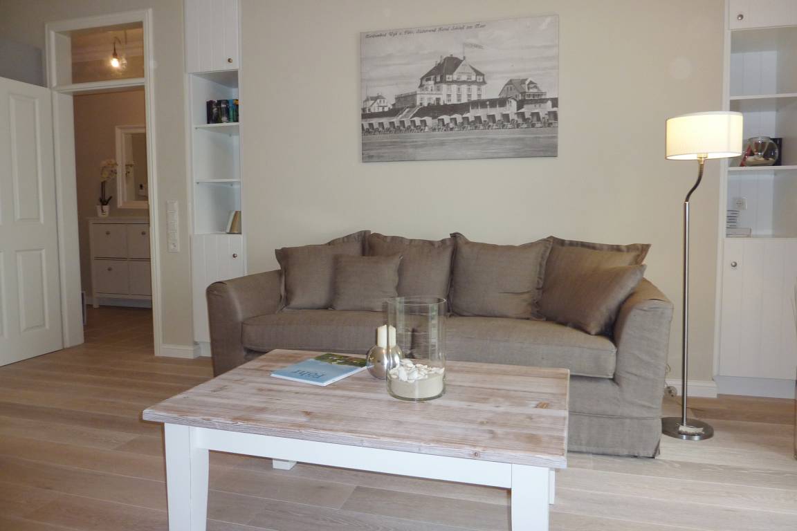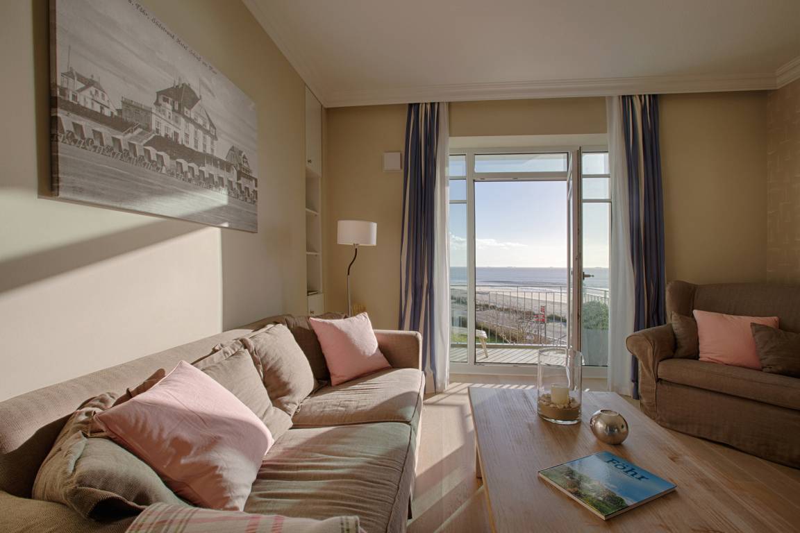 Diese exklusive Wohnung liegt im 2. OG hinter einer historischen Fassade, die beim Neubau erhalten geblieben ist. Sie bietet vom Wohn-, Schlaf- und Essbereich einen wunderschönen Blick auf den Strand, die Nordsee und die Halligen. Die helle 2-Zimmerwohnung ist u.a. mit hochwertigen Einbauschränken, moderner Landhaus-Küche, einer Rain Air Dusche und einem überlangen Bett ausgestattet. Italienische Fliesen [&] Eichenparkett mit Fußbodenheizung sowie die Einrichtung im Riviera Maison Stil schaffen eine Wohlfühlatmosphäre. Der windgeschützte Südost-Balkon (über 10qm) bietet eine Sonnenliege und zwei Sessel zum Träumen. Nach einem langen Urlaubstag entspannen Sie in der hauseigenen Sauna und lassen Ihre Seele baumeln.