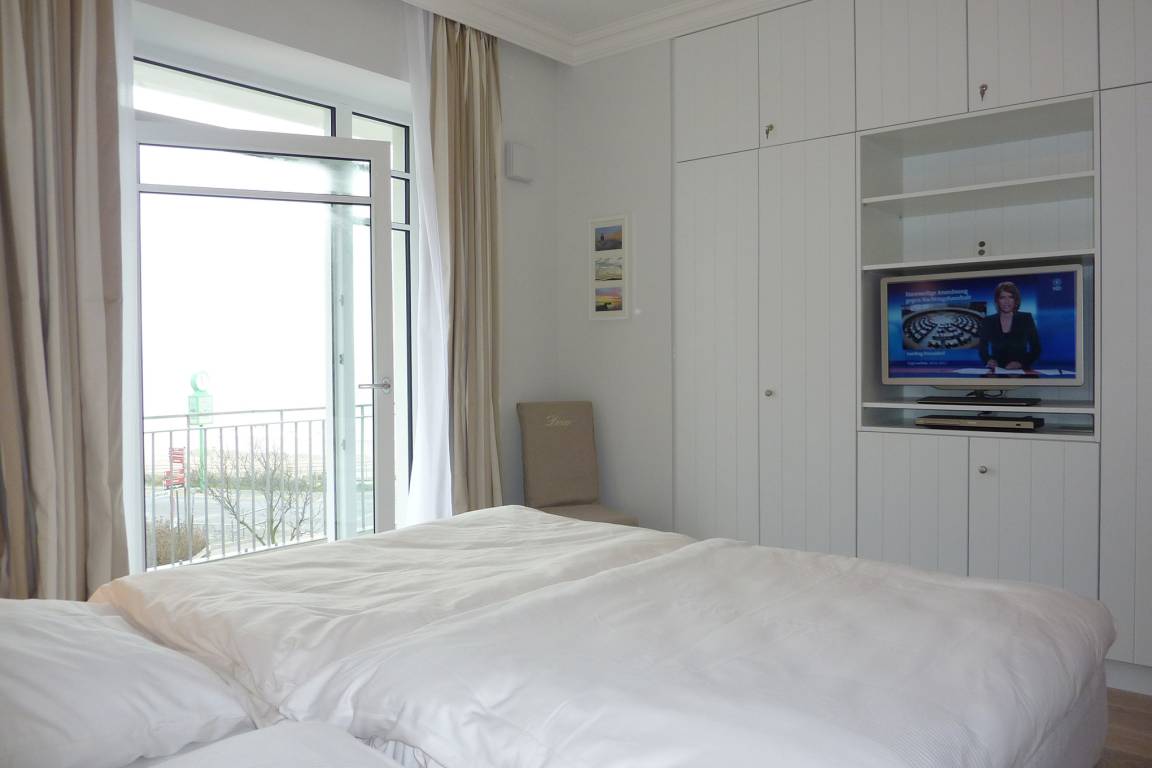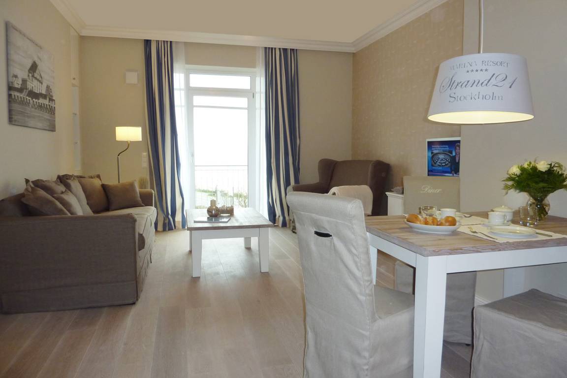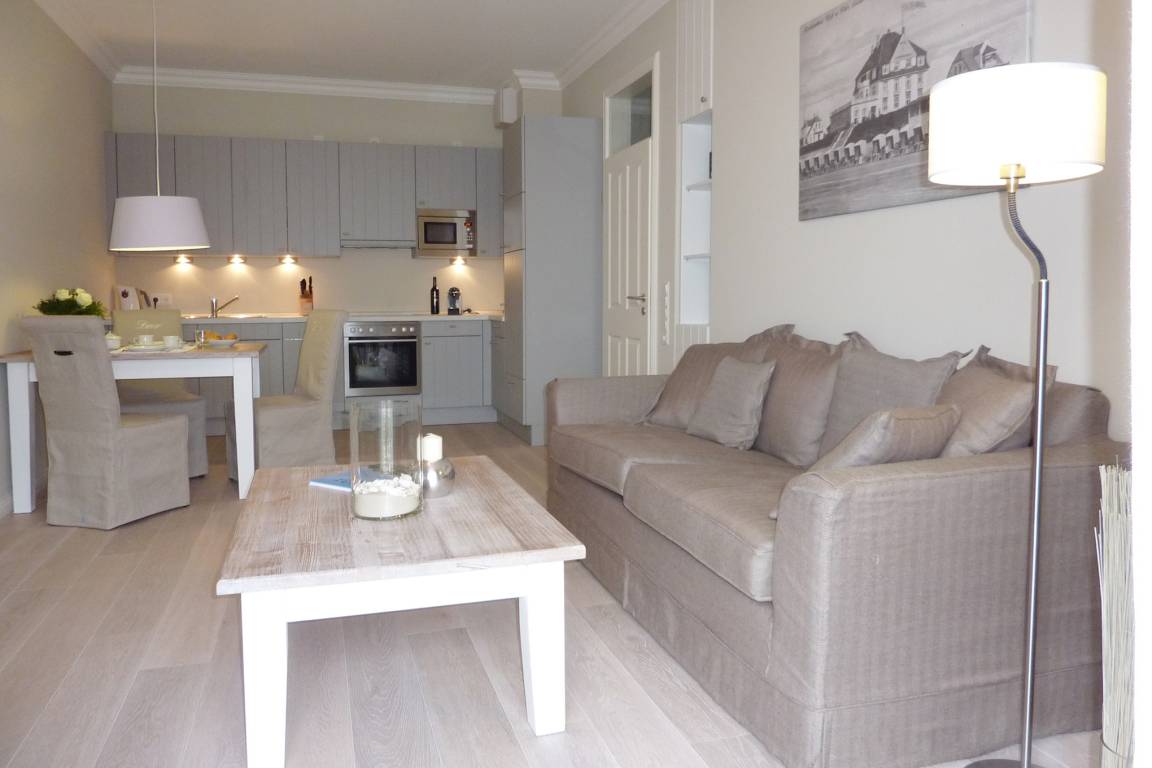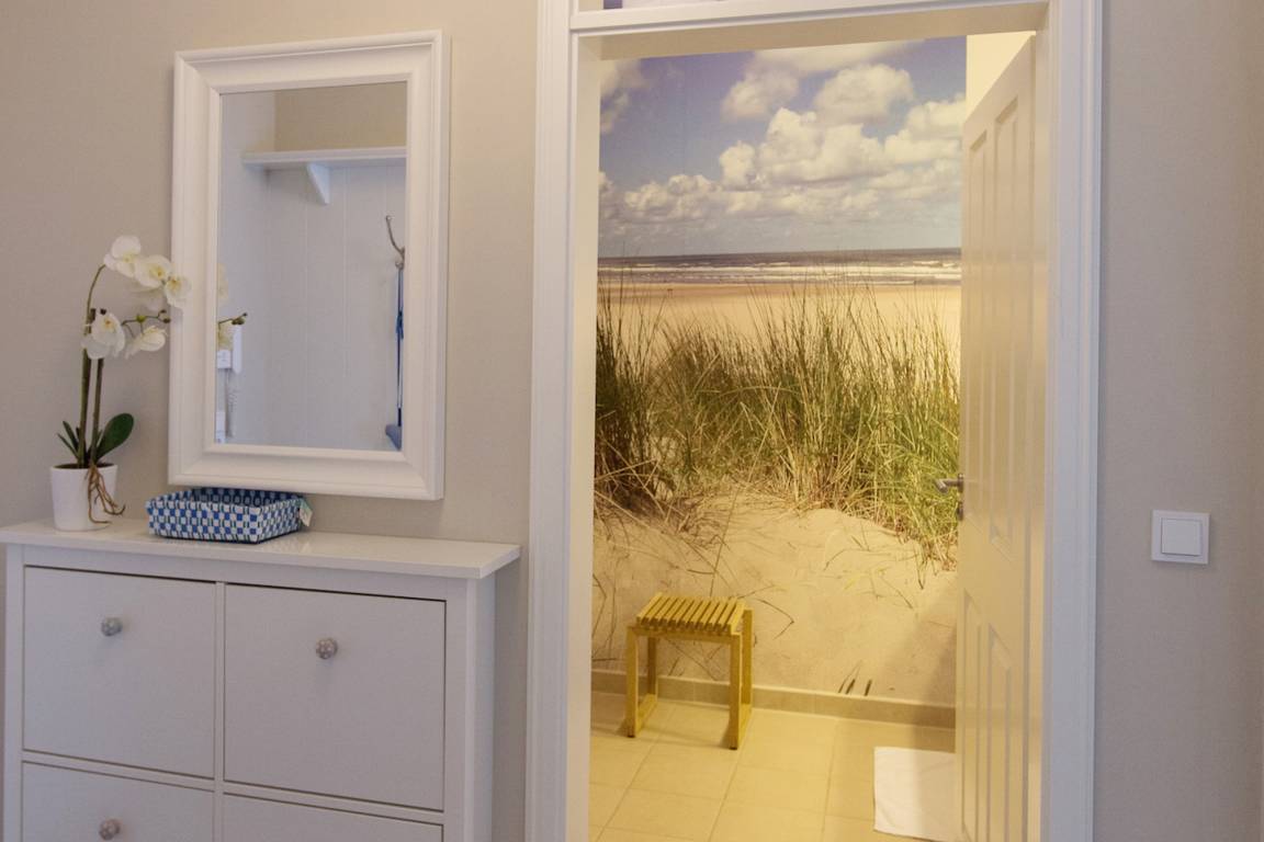Diese exklusive Wohnung liegt im 2. OG hinter einer historischen Fassade, die beim Neubau erhalten geblieben ist. Sie bietet vom Wohn-, Schlaf- und Essbereich einen wunderschönen Blick auf den Strand, die Nordsee und die Halligen. Die helle 2-Zimmerwohnung ist u.a. mit hochwertigen Einbauschränken, moderner Landhaus-Küche, einer Rain Air Dusche und einem überlangen Bett ausgestattet. Italienische Fliesen [&] Eichenparkett mit Fußbodenheizung sowie die Einrichtung im Riviera Maison Stil schaffen eine Wohlfühlatmosphäre. Der windgeschützte Südost-Balkon (über 10qm) bietet eine Sonnenliege und zwei Sessel zum Träumen. Nach einem langen Urlaubstag entspannen Sie in der hauseigenen Sauna und lassen Ihre Seele baumeln.