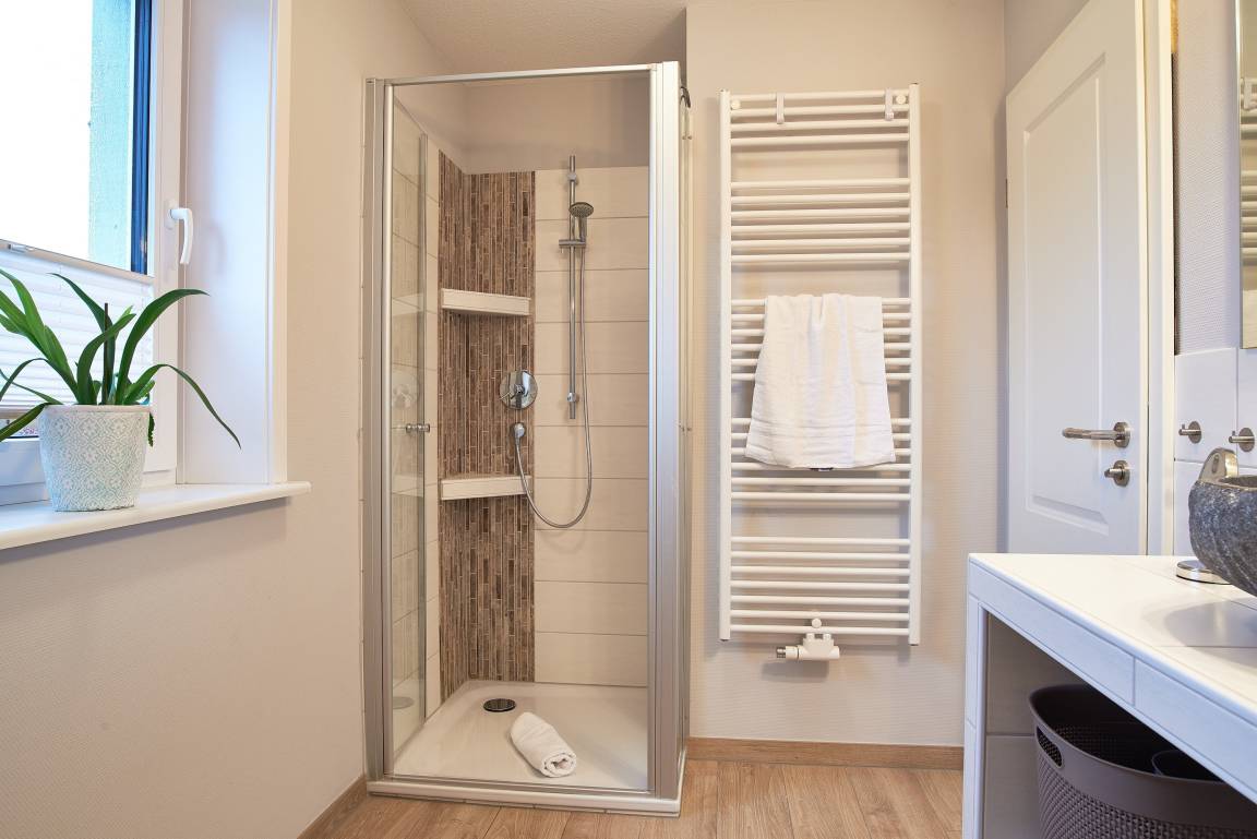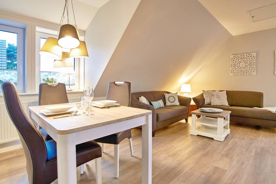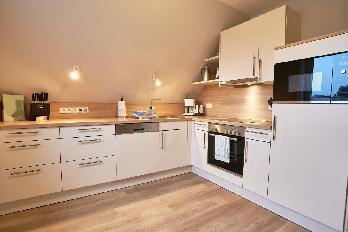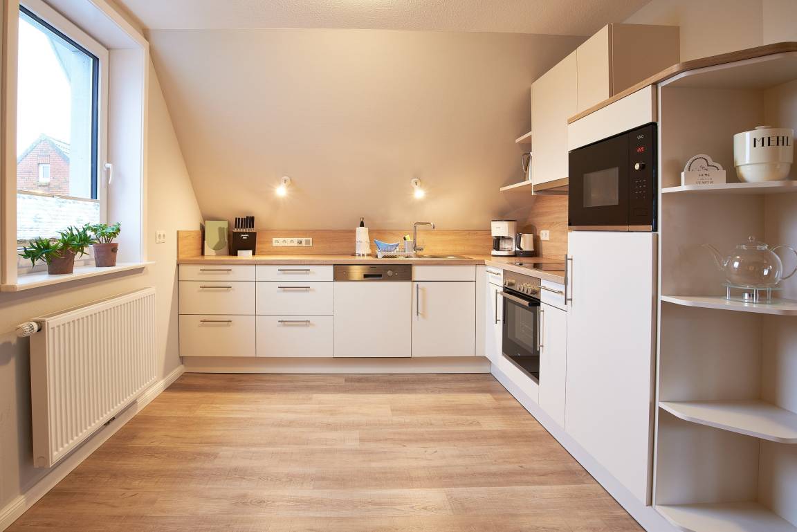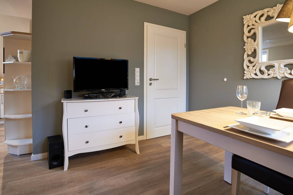 Die ca. 50 qm große, ruhig gelegene OG-Wohnung heißt Sie zu herrlichen Urlaubstagen willkommen. Das Schlafzimmer mit Einbaubett und -Schrank verzaubert und verspricht ruhige Nächte. Im individuellen komfortablen Duschbad mit Fenster steht für Sie ein Waschtrockner zur Verfügung und daran angrenzend befindet sich ein Abstellraum mit Staubsauger, Bügelbrett, Wäscheständer und Platz für Ihre Koffer. Das Herzstück der Wohnung ist der Wohnbereich mit der integrierten, offenen und vollausgestatteten Küche sowie einem komfortablen Essplatz. Bei der Einrichtung, der teilweise mit Dekopaneelen ausgelegten Zimmer, wurde höchster Wert auf Komfort, Ambiente, Funktionalität und eine wohnliche Atmosphäre gelegt. SAT-TV, Radio, Blu-Ray Player, und WLAN gehören selbstverständlich zur Ausstattung. In der Küche profitieren Sie von unserer langjährigen Erfahrung im Vermietungsbereich. Geschirrspüler, Backofen, Mikrowelle, Toaster, Kaffeemaschine (Senseo Duo), Wasserkocher usw. gehören zu der umfangreichen Ausstattung. Für die Fahrräder steht ein Unterstellplatz zur Verfügung. Im gemeinschaftlichen Garten befindet sich eine eigene Sitzgelegenheit mit Strandkorb (in den Sommermonaten). Diese Ferienwohnung ist eine sehr gute Empfehlung und das ideale Feriendomizil für 2 Personen.