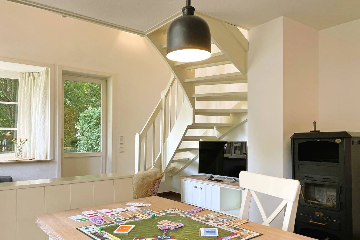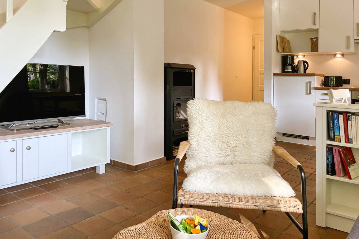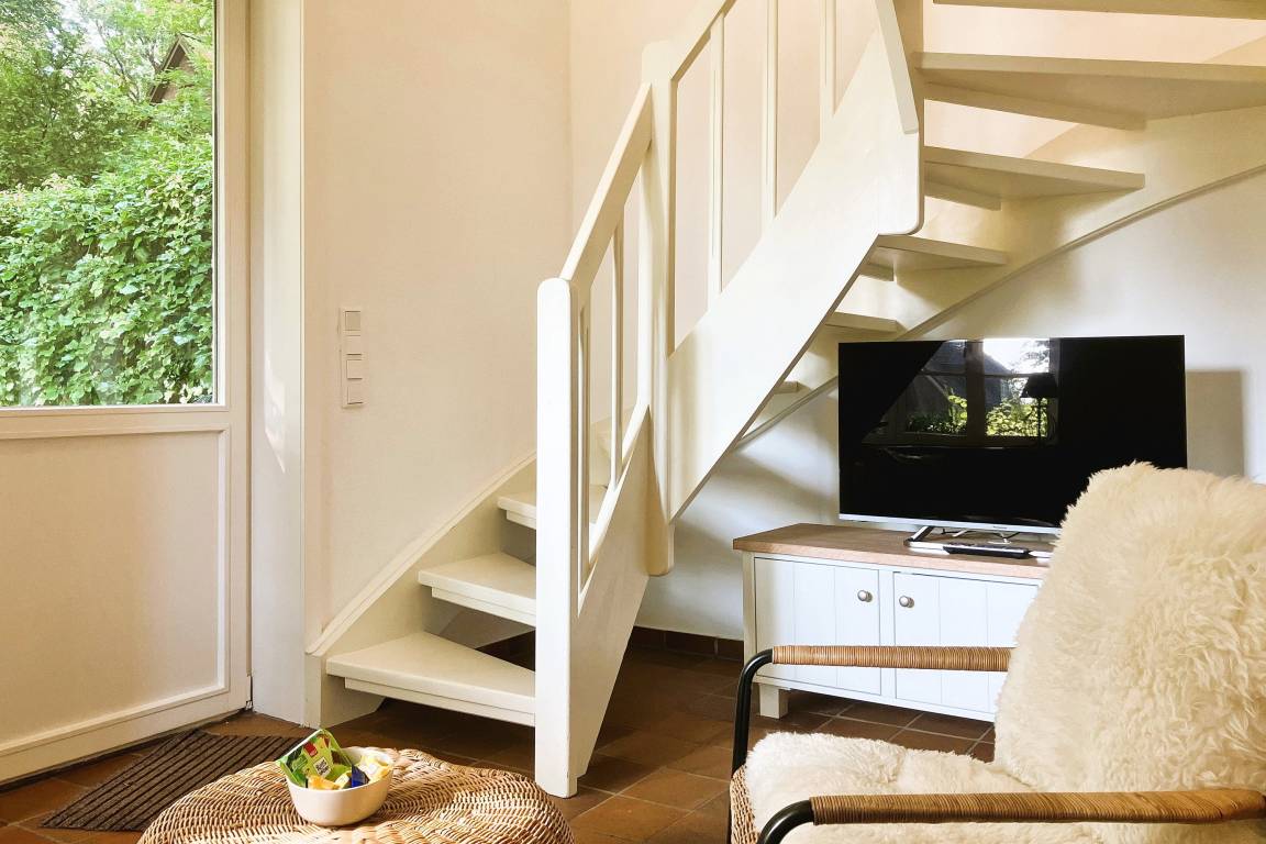 Unser Lütt Strandhus liegt nur wenige Meter entfernt vom beliebten Südstrand mitten im Grünen und erstreckt sich über 2 Etagen. Im Erdgeschoss befindet sich das helle Duschbad mit Fenster sowie der großzügige Wohnraum mit einer Küchenzeile, einer gemütlichen Essecke am Kamin sowie der bequemen Sitzgarnitur bestehend aus einem Sessel und einer Schlafcouch (110 x 190cm; dient als Ausweichmöglichkeit, wenn Sie getrennt schlafen möchten). Von hier gelangen Sie auf den Terrassensitzplatz und den weitläufigen Garten. Eine Treppe führt Sie in die erste Etage, wo das helle Schlafzimmer mit Doppelbett (180x200cm), Kleiderschrank und einem zweiten Fernseher gemütliche Stunden verspricht. Neben dem Schlafzimmer gibt es hier noch ein zweites kleines Bad mit einer Sitzbadewanne. Die zweite Etage verfügt über einen ausgebauten Dachraum, der zum Abstellen der Koffer dient. Das Lütt Strandhus mit seiner offenen Bauweise und der Fußbodenheizung bietet zwei Personen ausreichend Platz für schöne Urlaubstage auf Föhr. Auf der Terrasse umgeben von der idyllischen Natur wartet ein Strandkorb auf Sie: Inseltypisches Relaxen!
