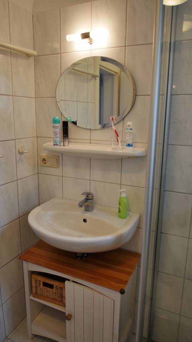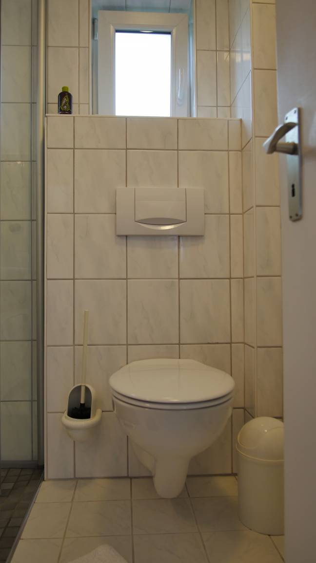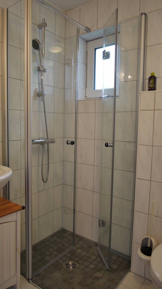 Das kleine, helle Bad mit Dusche und WC ist funktional und einladend. Ein Fenster sorgt für Frische sowie Helligkeit und ein Schränkchen bietet Platz für Ihre Pflegeprodukte.