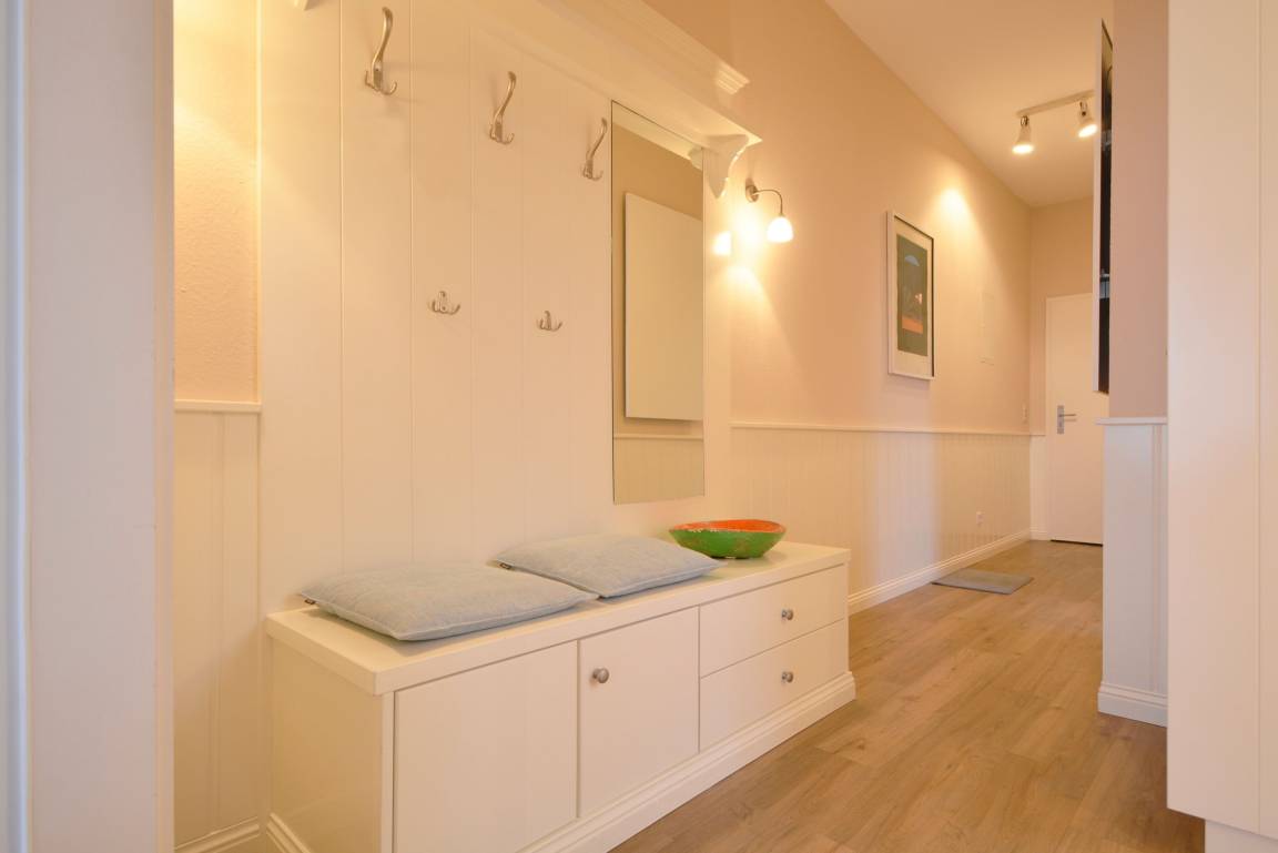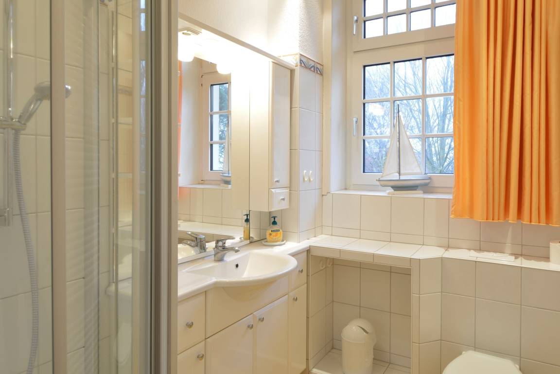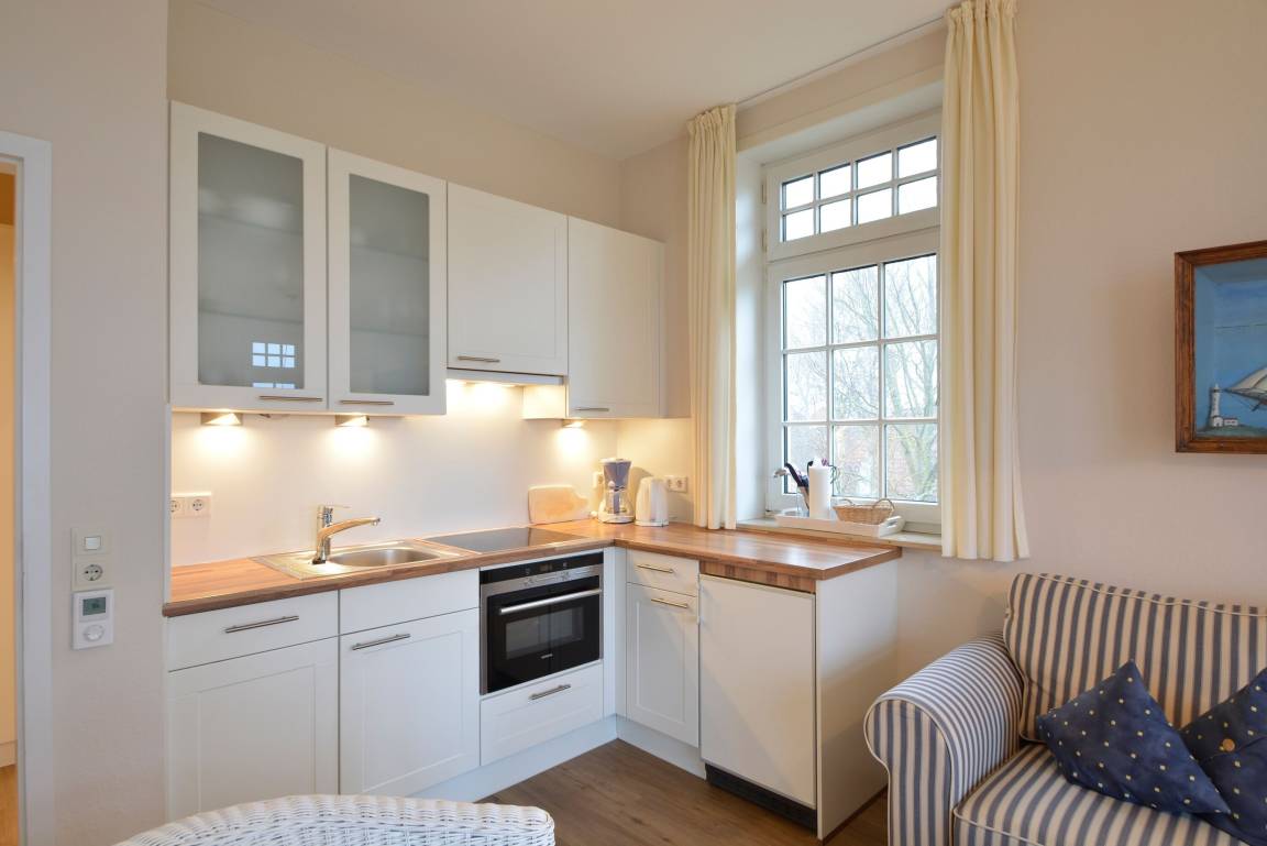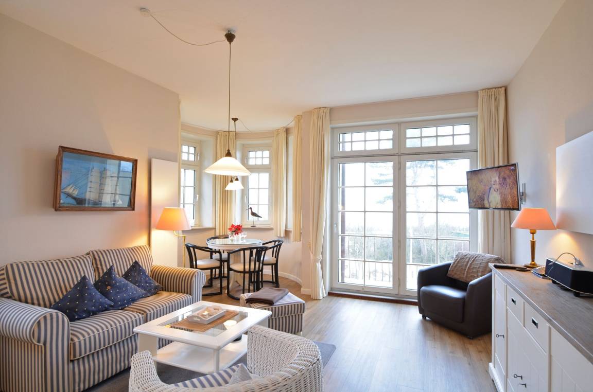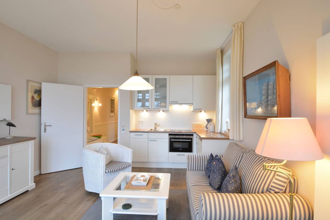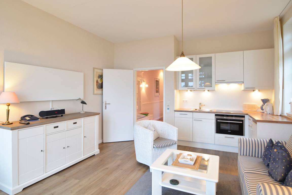 Die Wohnung befindet sich im 2. Obergeschoss und verfügt über einen Balkon mit Meerblick (etwas eingeschränkt durch Bäume). Im Wohnbereich gibt es eine voll ausgestattete Küche, einen Esstisch in dem runden Erker, eine gemütliche Couch, ein Duschbad und ein Schlafzimmer.