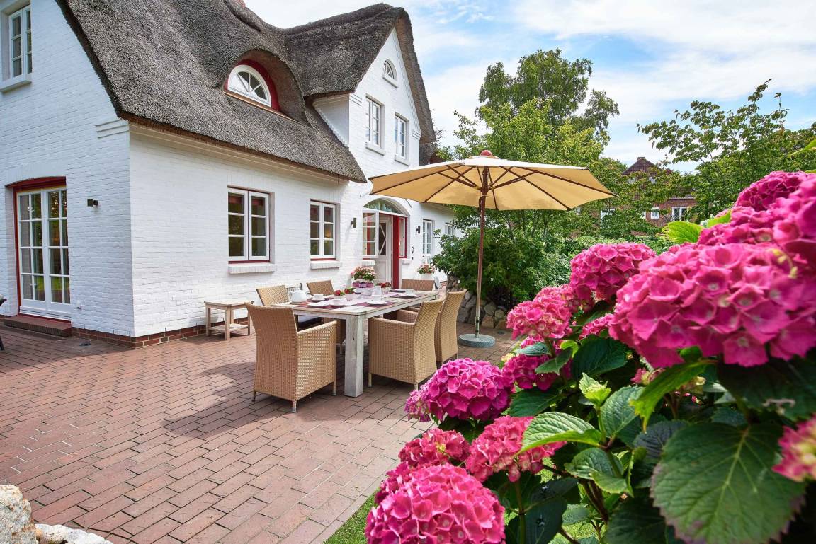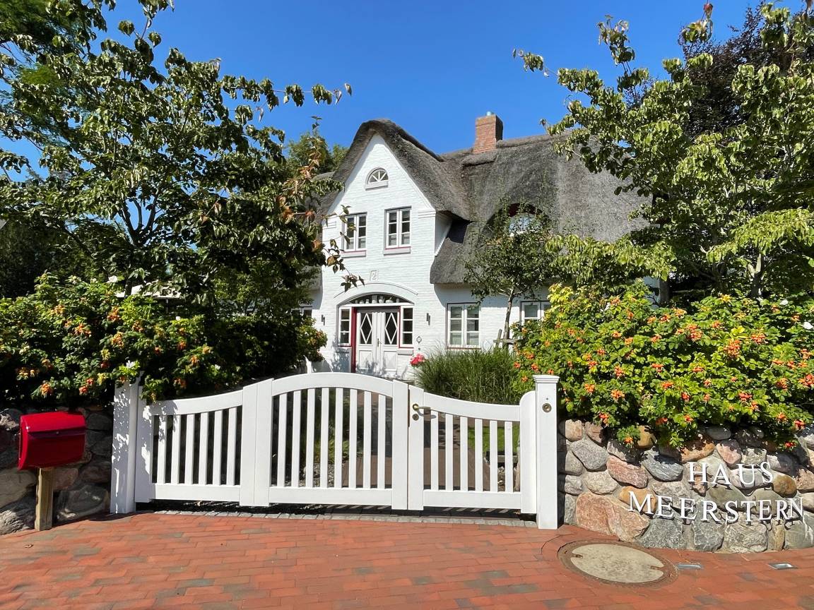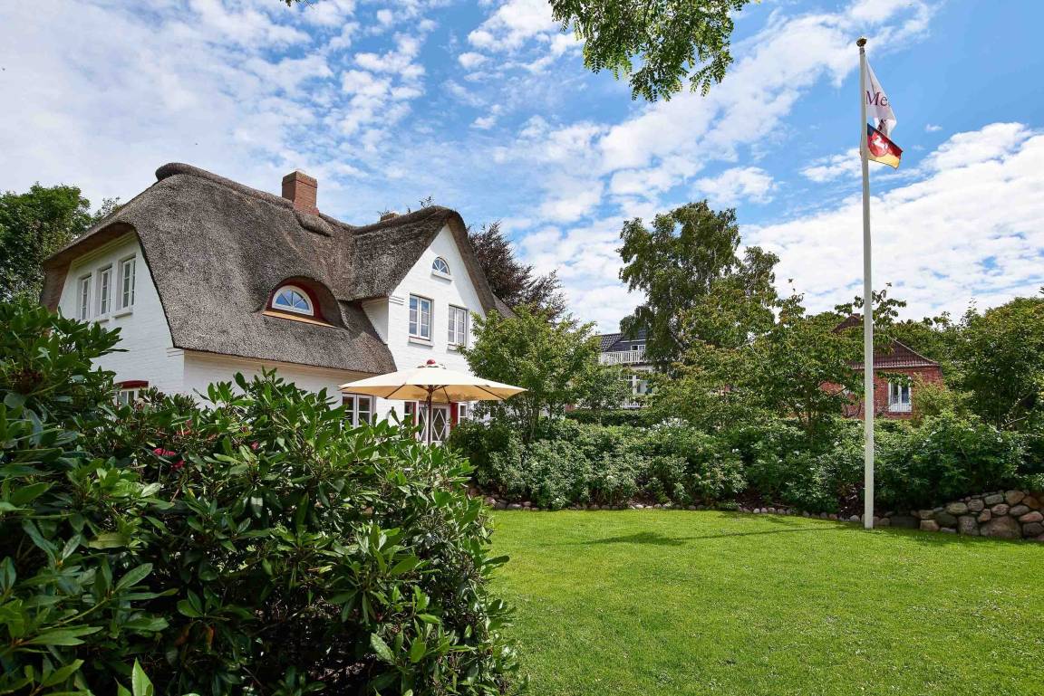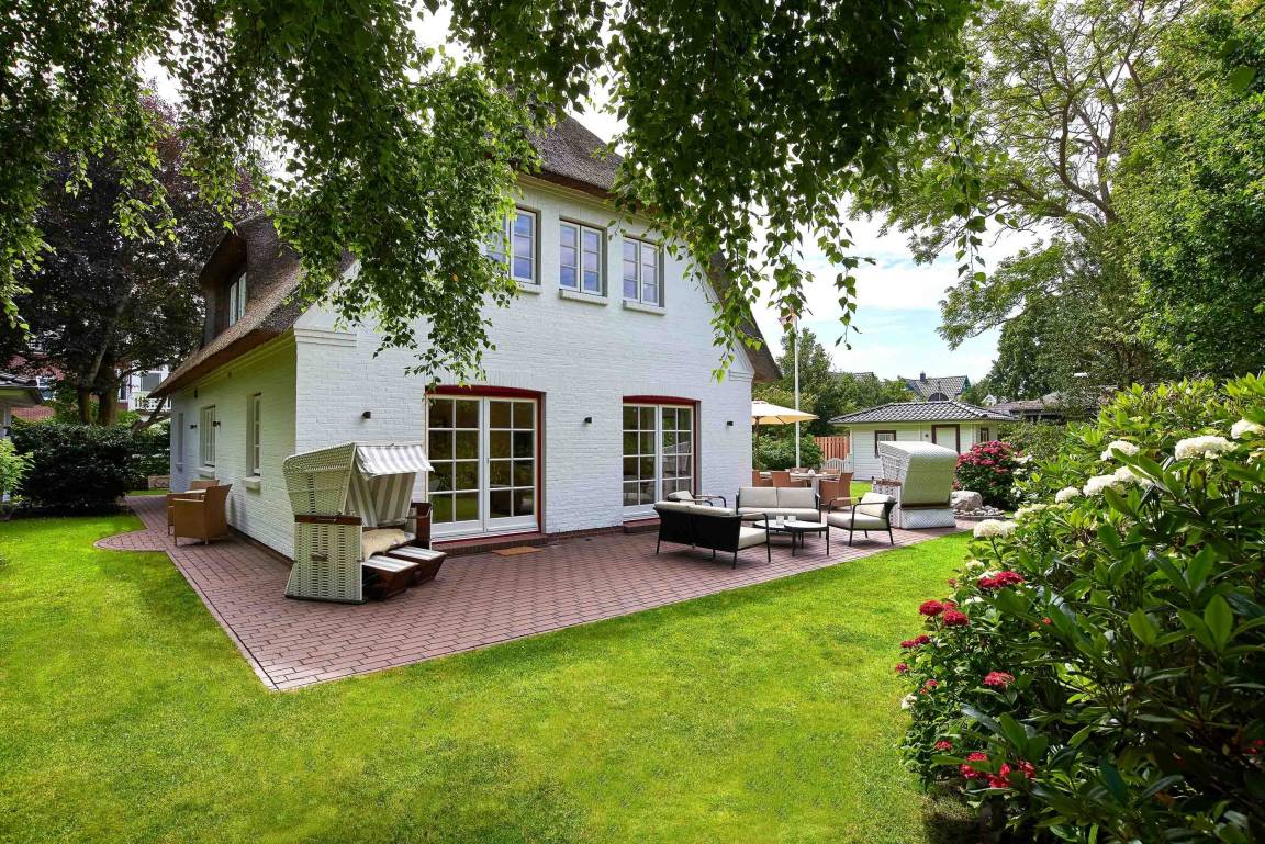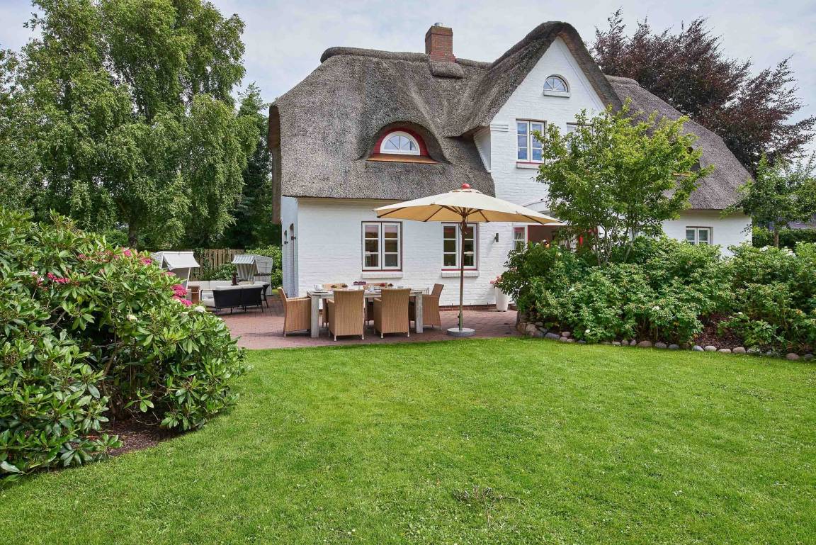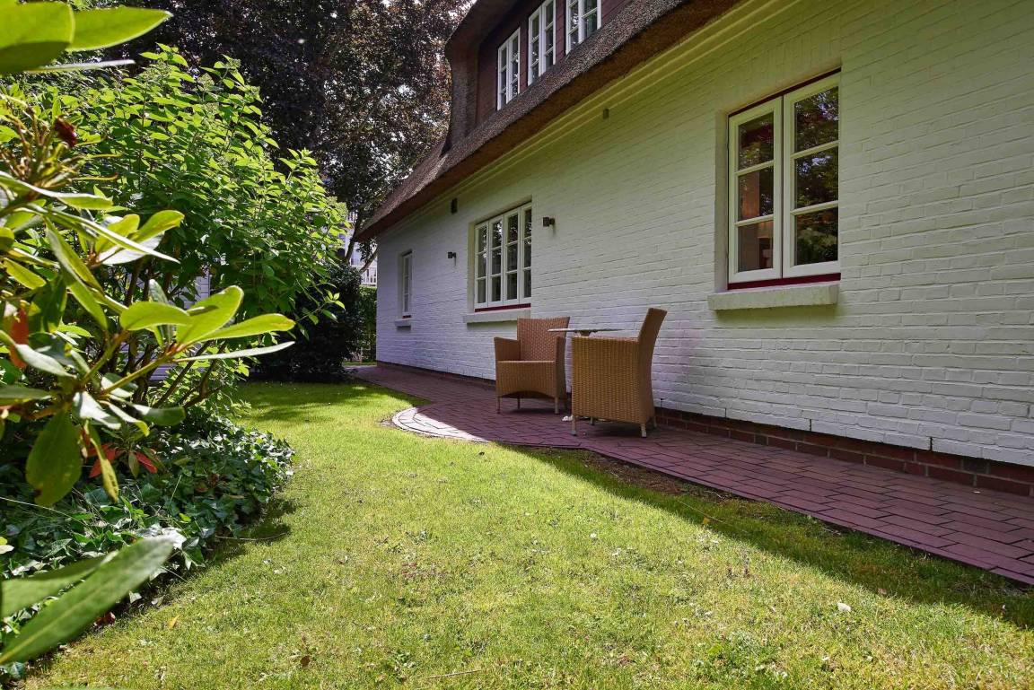 Entdecken Sie das versteckte, märchenhaft im Herzen von Wyk gelegene Einzelhaus unter Reet, das idyllisch und sehr ruhig in zweiter Reihe nur von Gärten umsäumt auf einem ca. 1.000 m² großen, eingewachsenen Grundstück liegt. Der wunderschön angelegte Garten bietet durch innere Friesenwälle viel Privatsphäre und durch Illumination am Abend eine außergewöhnliche Atmosphäre. Die stilvolle Einrichtung der Villa ist ein stimmiger Mix aus modernen Möbeln und antiken Einzelstücken. Genießen Sie die exklusiven Bäder und den Besuch in der geräumigen Gartensauna. Sie werden sich sicher gern an die gemütlichen Abende vor dem historischen Kachelofen im Wohnzimmer erinnern. Auch zwei der geräumigen Schlafräume sind mit je einem Panoramaofen ausgestattet. Nur ein kurzer Fußweg führt Sie zu den Einkaufsmöglichkeiten und der Promenade mit Badestrand, Bars und Cafes.