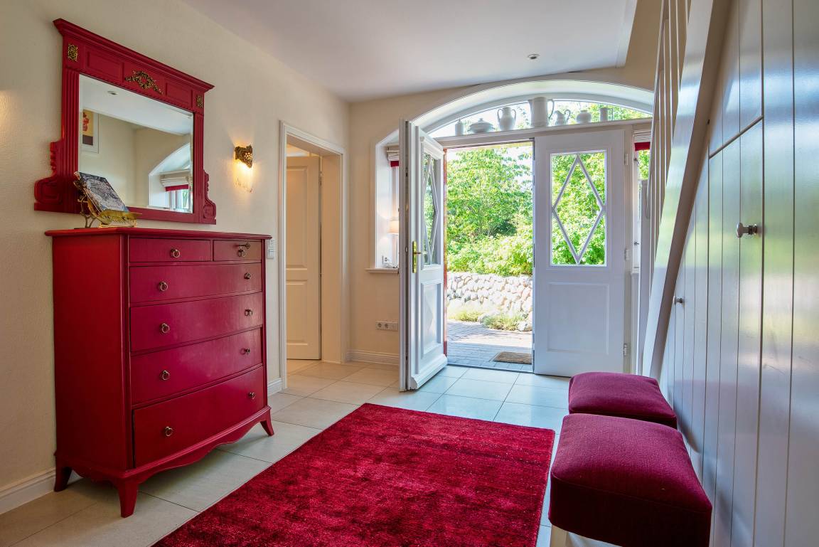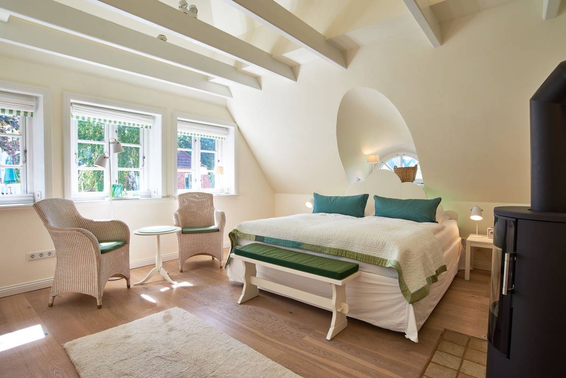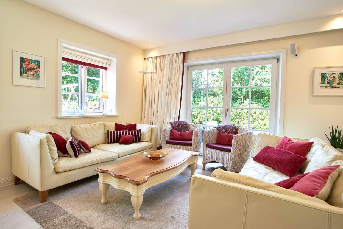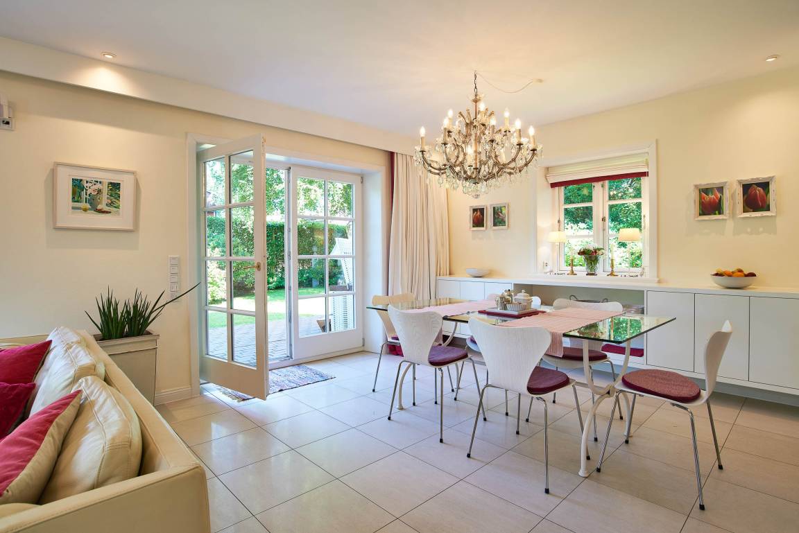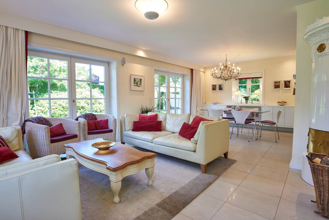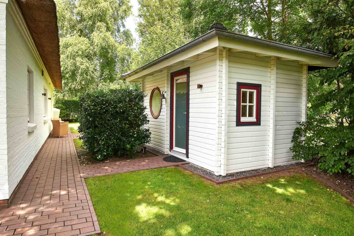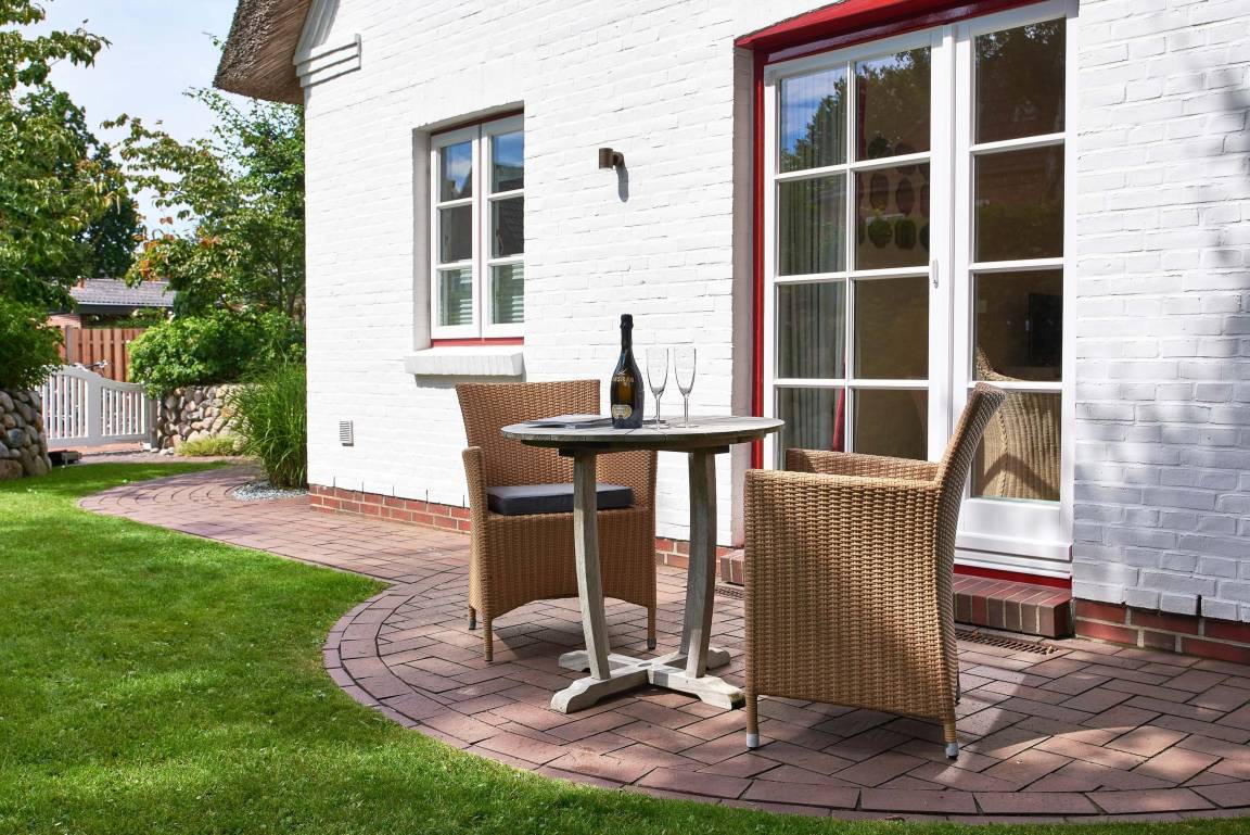 Entdecken Sie das versteckte, märchenhaft im Herzen von Wyk gelegene Einzelhaus unter Reet, das idyllisch und sehr ruhig in zweiter Reihe nur von Gärten umsäumt auf einem ca. 1.000 m² großen, eingewachsenen Grundstück liegt. Der wunderschön angelegte Garten bietet durch innere Friesenwälle viel Privatsphäre und durch Illumination am Abend eine außergewöhnliche Atmosphäre. Die stilvolle Einrichtung der Villa ist ein stimmiger Mix aus modernen Möbeln und antiken Einzelstücken. Genießen Sie die exklusiven Bäder und den Besuch in der geräumigen Gartensauna. Sie werden sich sicher gern an die gemütlichen Abende vor dem historischen Kachelofen im Wohnzimmer erinnern. Auch zwei der geräumigen Schlafräume sind mit je einem Panoramaofen ausgestattet. Nur ein kurzer Fußweg führt Sie zu den Einkaufsmöglichkeiten und der Promenade mit Badestrand, Bars und Cafes.