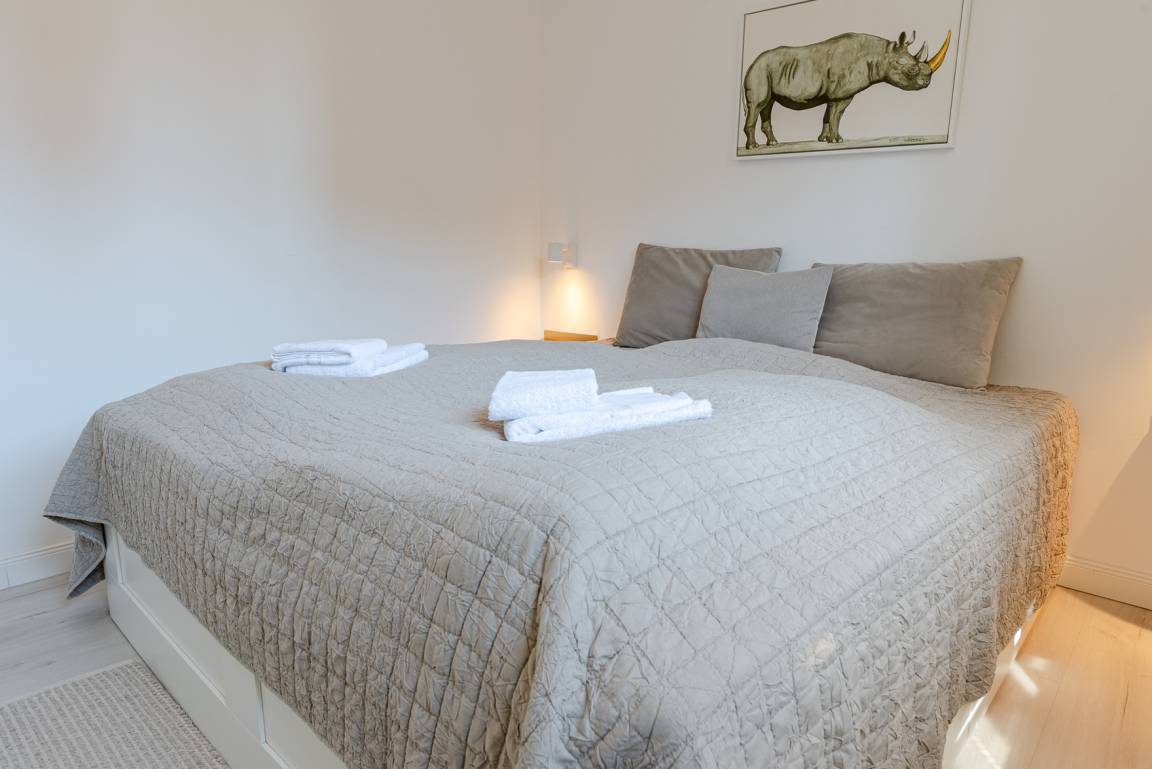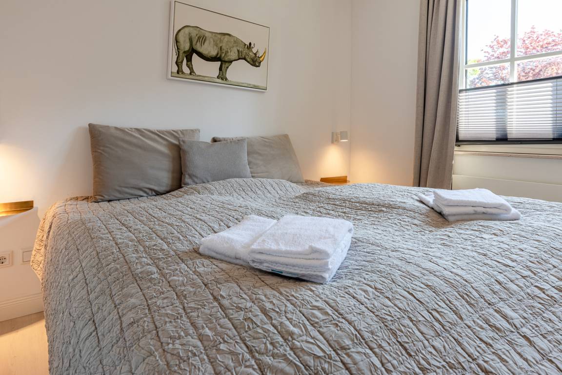 Das Schlafzimmer ist mit einem Doppelbett (1,80 x 2,00 m) mit hochwertigen Matratzen, Allergikerbezügen und neuen Vierjahreszeiten-Bettdecken sowie einem geräumigen Kleiderschrank ausgestattet. Lassen Sie sich von der Morgensonne wecken oder nutzen Sie die praktischen Verdunkelungsvorhänge oder die Plissees für Ihre erholsame Nachtruhe.