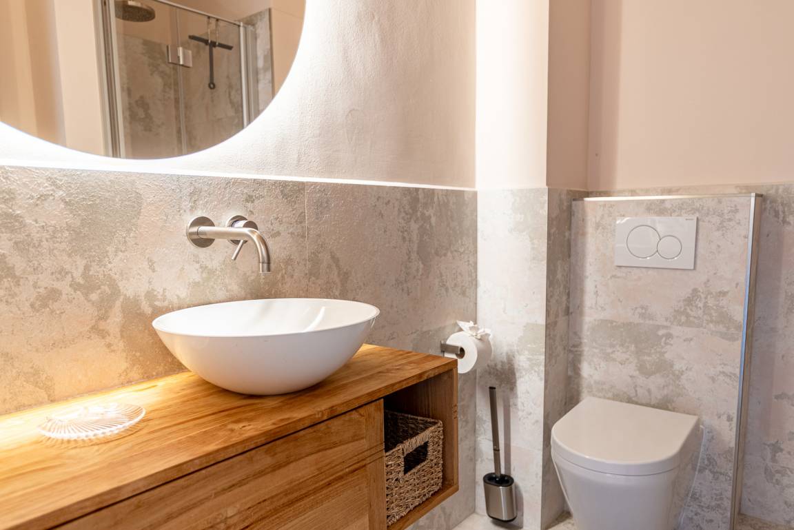 Das Highlight der Wohnung ist das Badezimmer mit geschmackvollen Fliesen aus italienischem Naturstein, dem Echtholz-Waschtisch aus Teak und der Regenschauer-Dusche. Die Fußboden-Heizung und der formschöne Handtuchheizkörper vervollständigen die kleine Wellness-Oase.