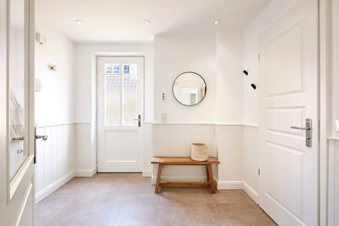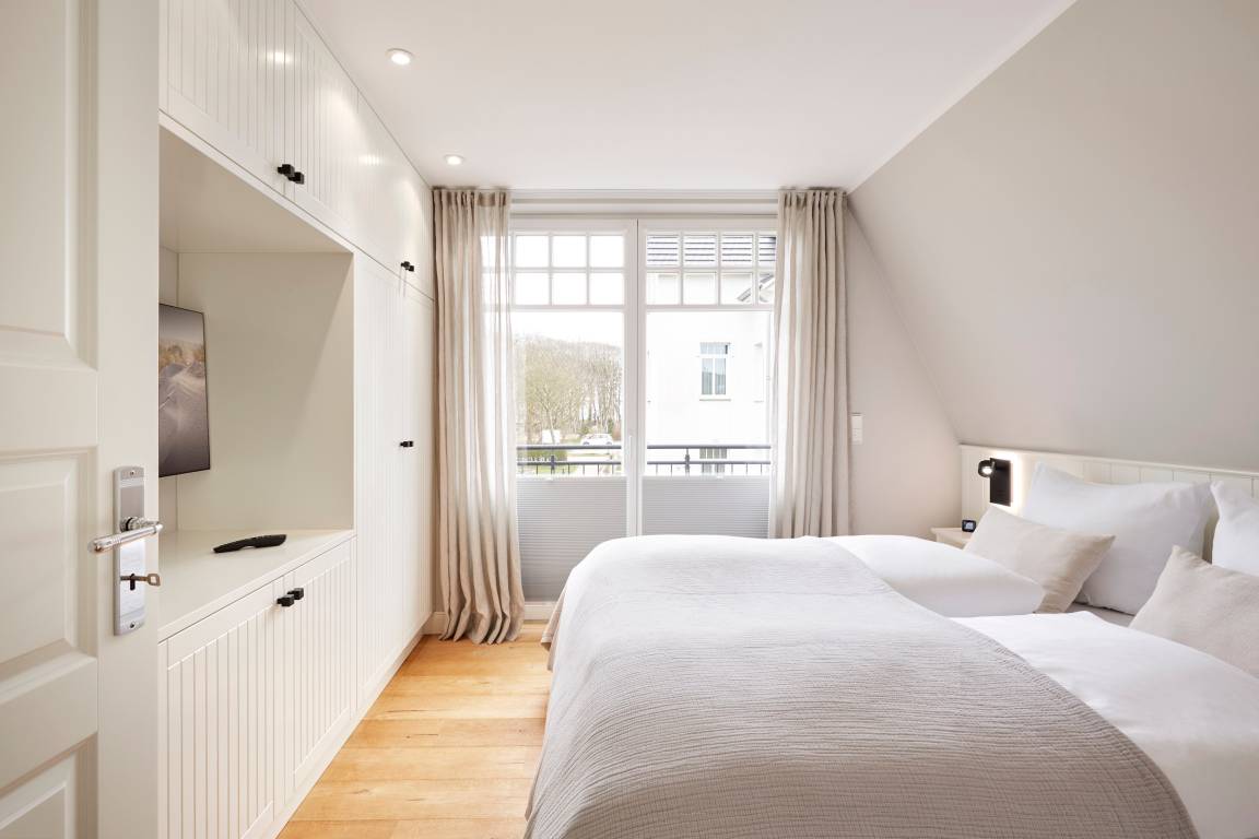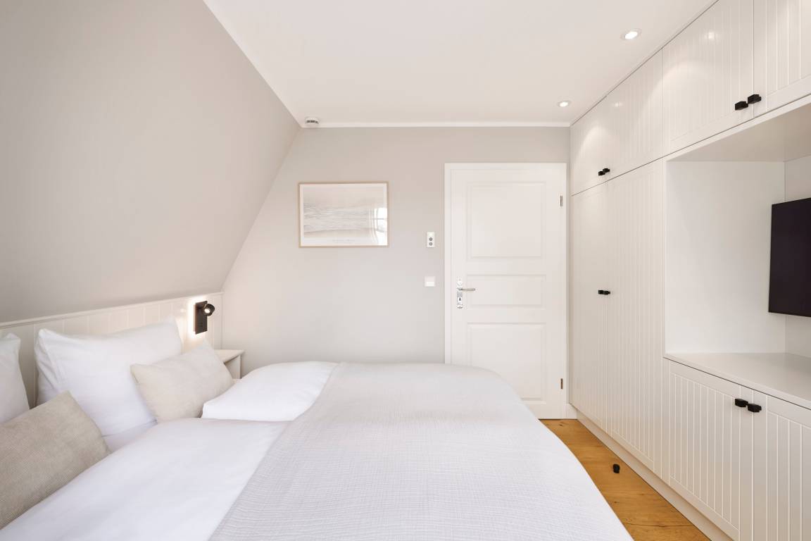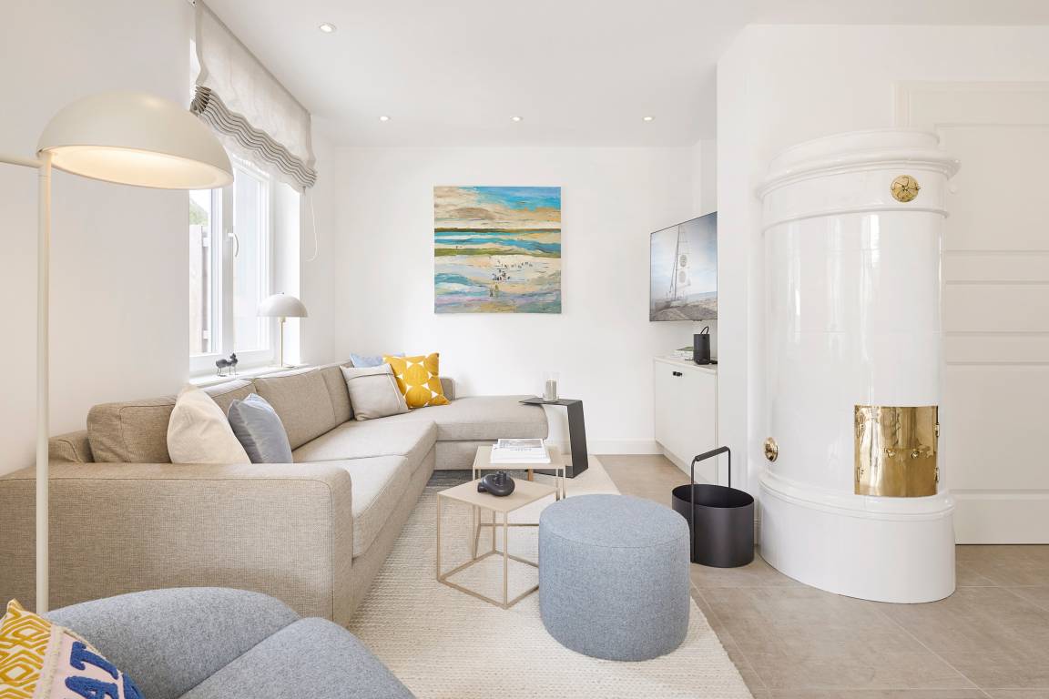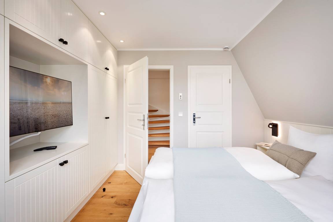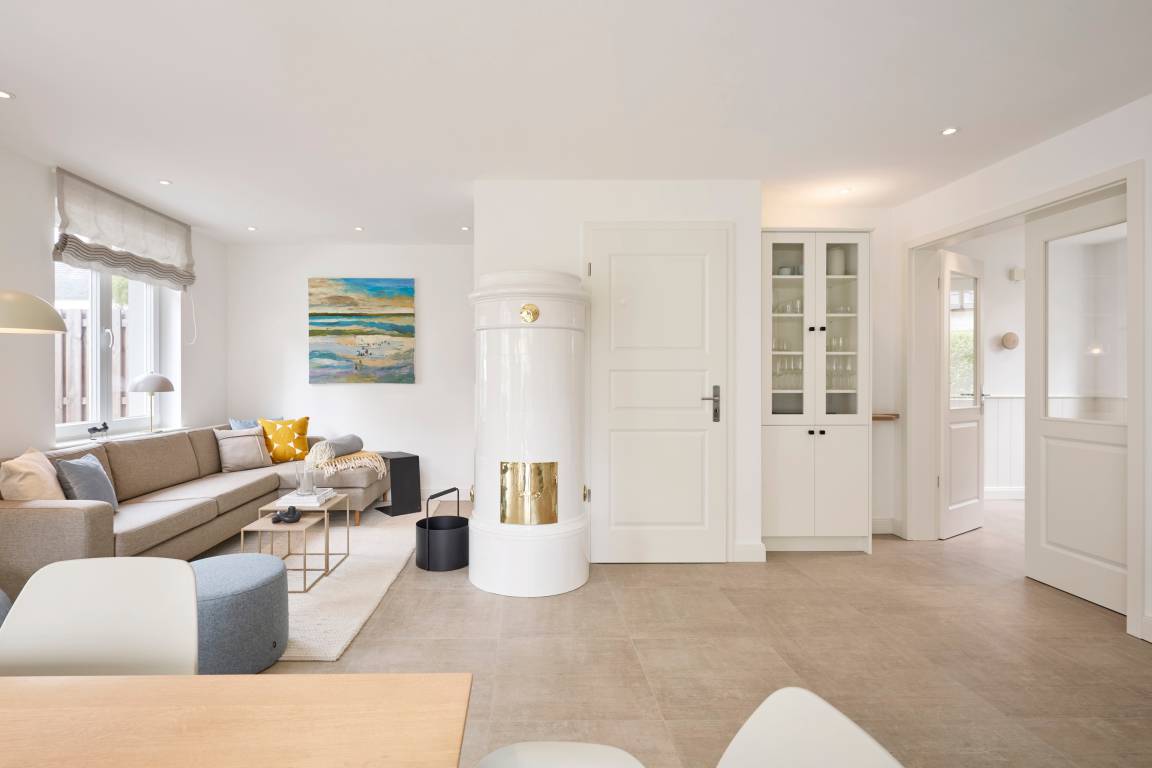 Im Sommer genießen Sie Ihr Frühstück auf der Terrasse und spüren die frische Meeresbrise. Im Obergeschoss befinden sich zwei Schlafzimmer mit Doppelbetten und zwei stilvolle Duschbäder. Aus einem der Schlafzimmer erhaschen Sie sogar einen Blick auf die Nordsee. Beide Schlafzimmer verfügen über kleine Balkone, die perfekt für den ersten Kaffee am Morgen oder ein Glas Wein am Abend sind.