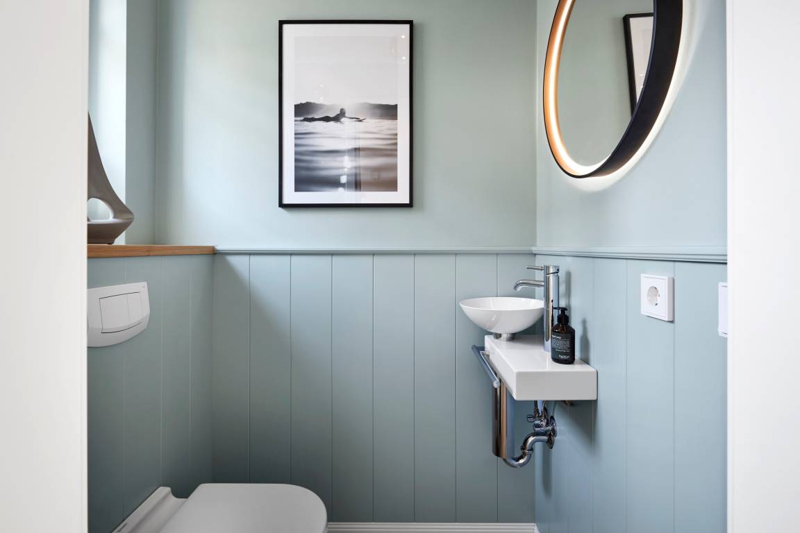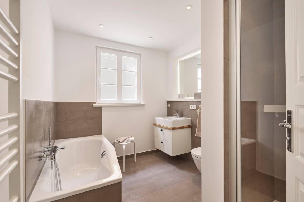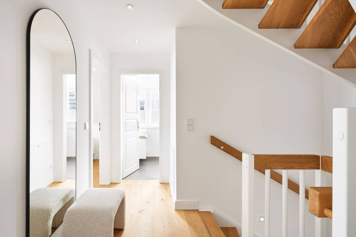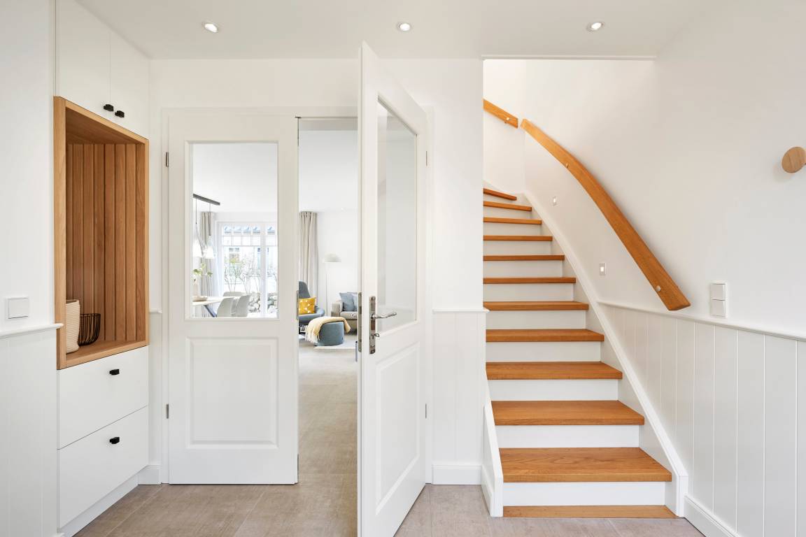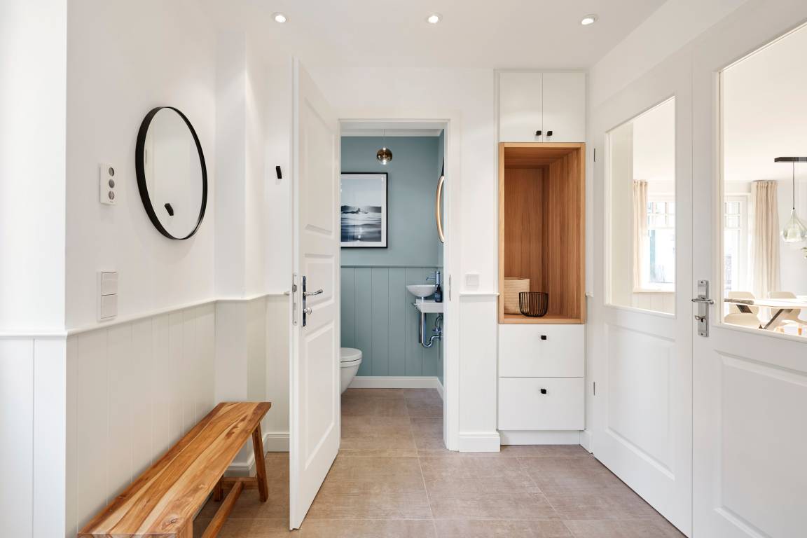 Beim Betreten des Hauses werden Sie von einem lichtdurchfluteten und großzügigen Flur empfangen, von dem aus Sie direkt auch in das Gäste WC im Erdgeschoss gelangen. Durch eine elegante Glastür gelangen Sie in den offenen Wohn- und Essbereich sowie die moderne Küche. Die Einrichtung besticht durch sanfte Farben und Design-Highlights, die eine harmonische und gemütliche Atmosphäre schaffen. Ein Mylin-Kamin im Wohnbereich sorgt im Herbst für wohlige Wärme und Gemütlichkeit.
