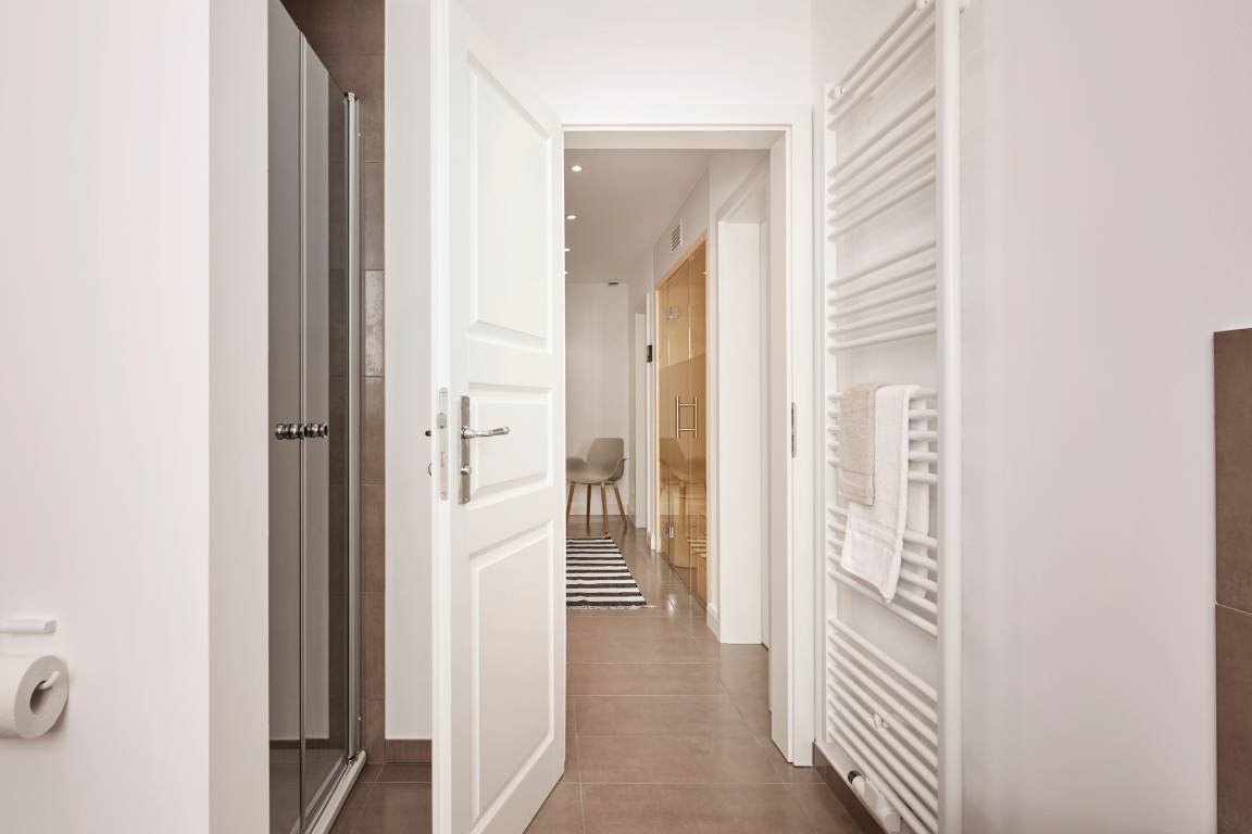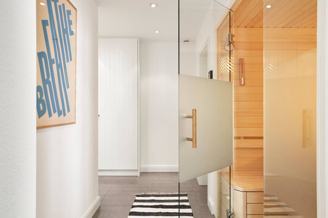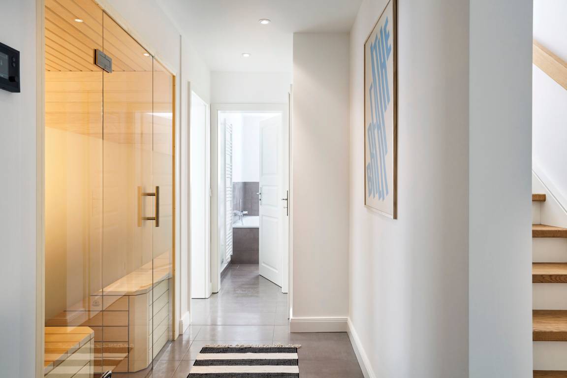 Das Untergeschoss bietet eine Sauna mit Glasfront, die besonders im Winter zu entspannenden Wellnesstagen einlädt. Ein großes Duschbad mit Badewanne befindet sich direkt nebenan. Zusätzlich gibt es einen Raum zum Relaxen und – falls nötig – einen Schreibtisch mit großem Monitor und Docking Station für Arbeit im Urlaub.