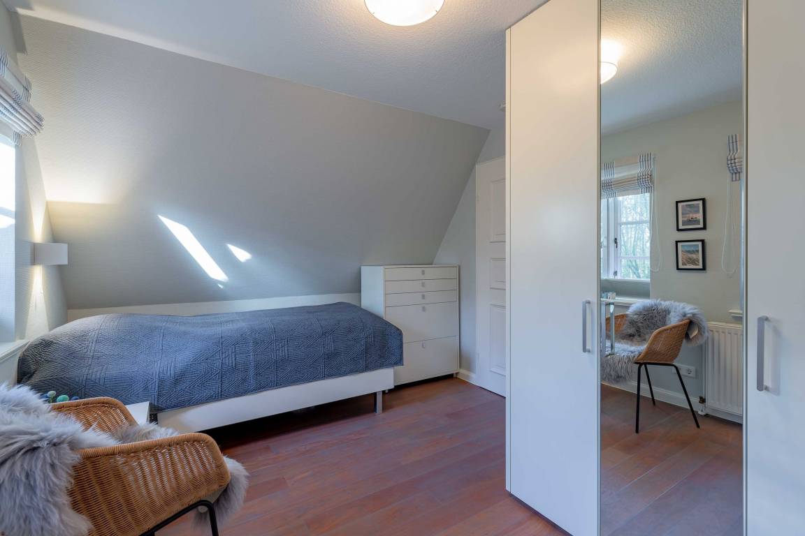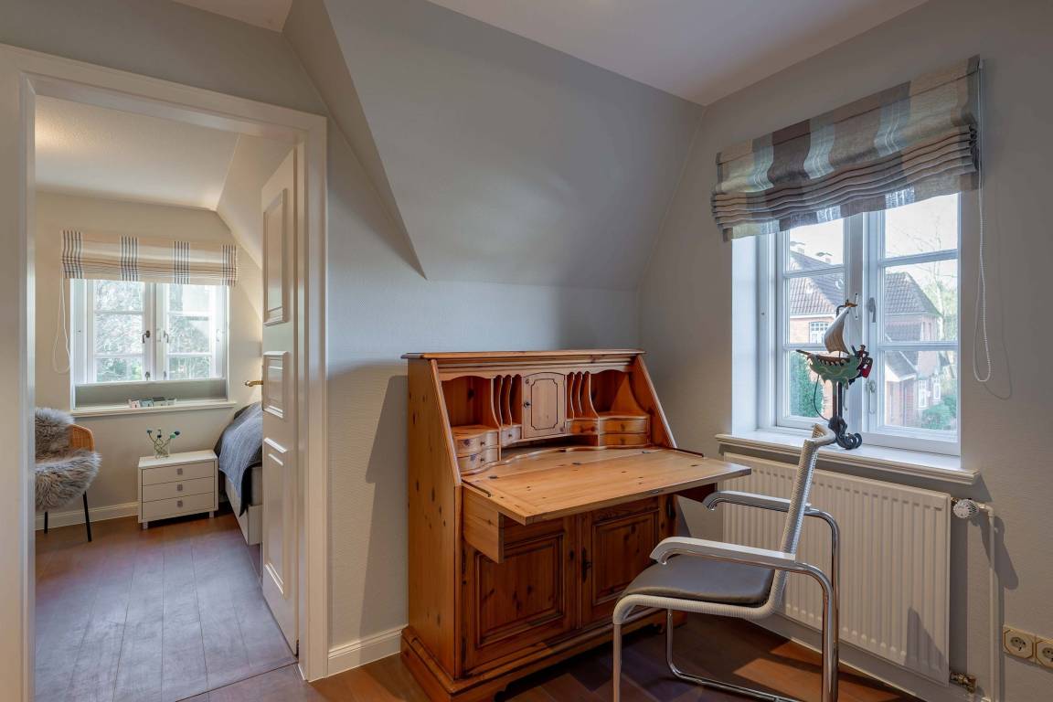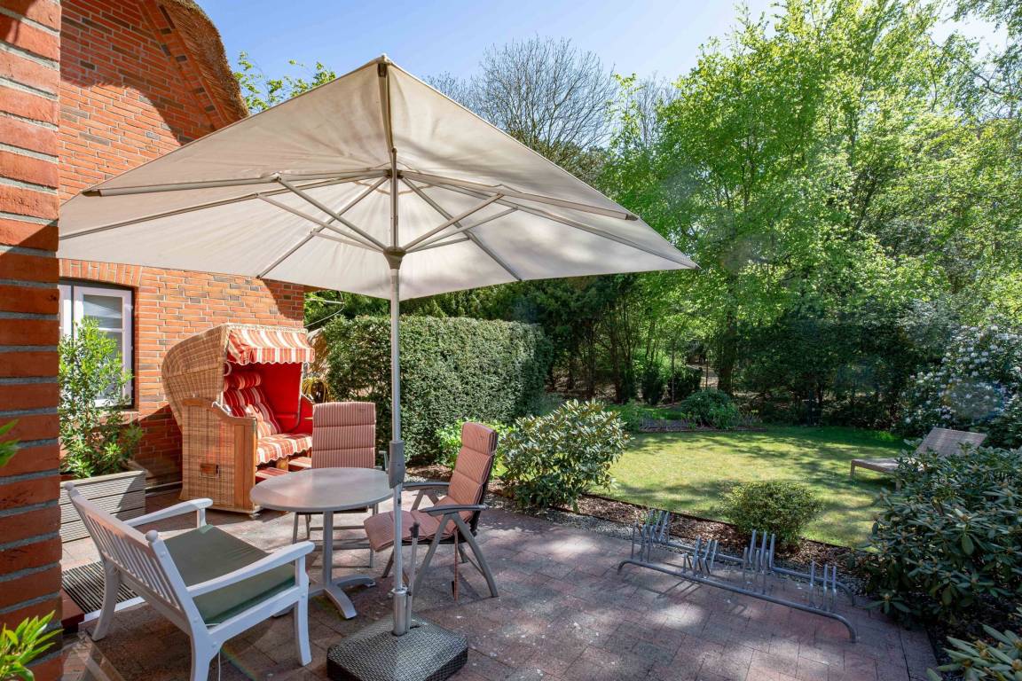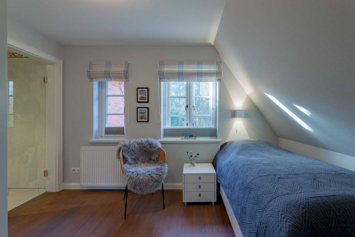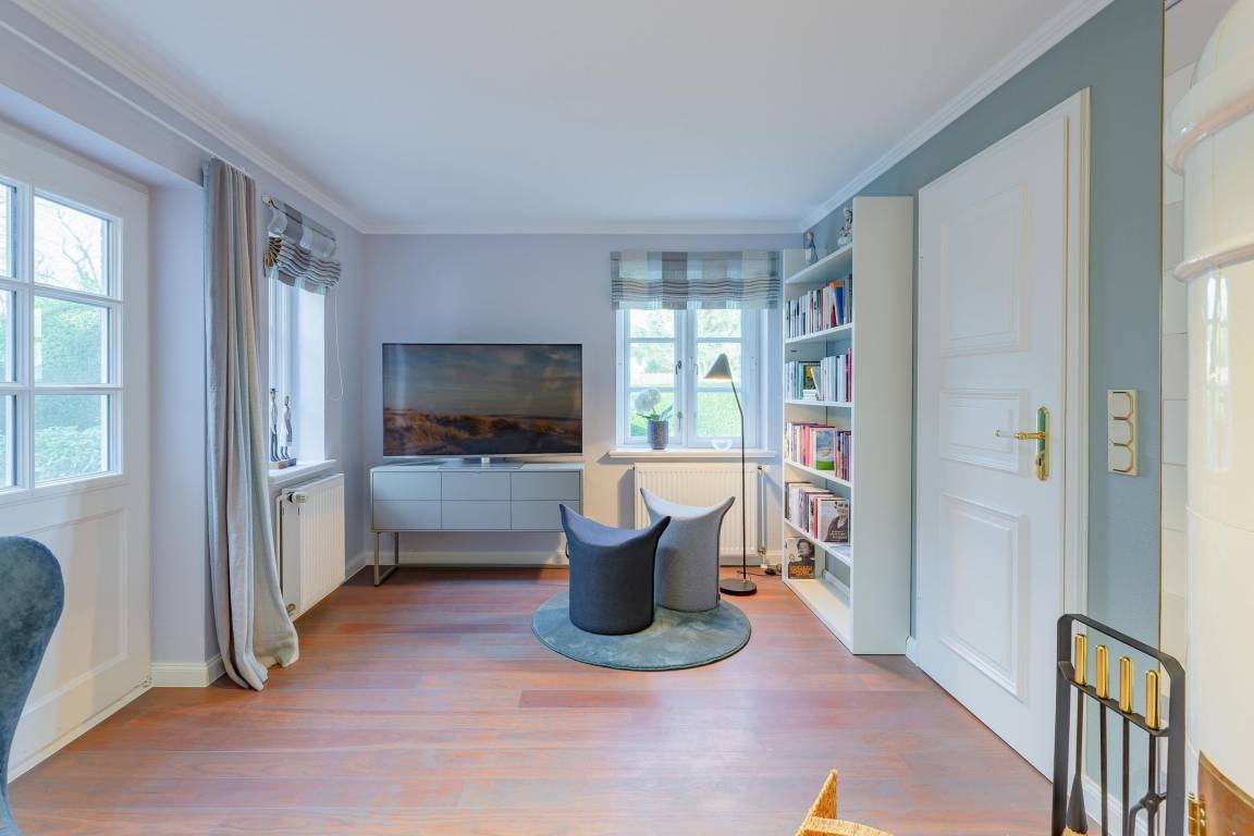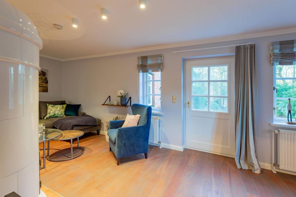 Wir begrüßen Sie im Haus Edda, unter dem Reetdach eines Drei-Parteien-Hauses im friesischen Baustil. Im Haus Edda stehen Ihnen 90 qm sowie ein separater Eingang zur Verfügung. Der kleine feine Garten grenzt direkt an den alten Kurpark in Wyk. Wenn Sie diesen durchqueren, gelangen Sie in wenigen Minuten zur Strandpromenade und haben von dort den freien Blick auf die Nordsee und die Halligen. Genießen Sie die Sonnenstunden im Strandkorb auf der Terrasse. Ein weiterer Strandkorb steht am Strand für Sie bereit. Für gemütliche Abende im Haus sorgt der schöne Mylin-Kachelofen – an windigen und kühlen Herbst- und Winterabenden genau das Richtige, um zu entspannen. Die perfekt ausgestattete Küche mit großer Kochinsel macht Lust auf gemeinsames Kochen. Es schließt sich der Essbereich an, der in den Wohnraum mit Leseecke übergeht. Ein Gäste-WC komplettiert das Erdgeschoss. Die beiden Schlafräume mit jeweils einem angrenzenden Bad befinden sich im Obergeschoss.