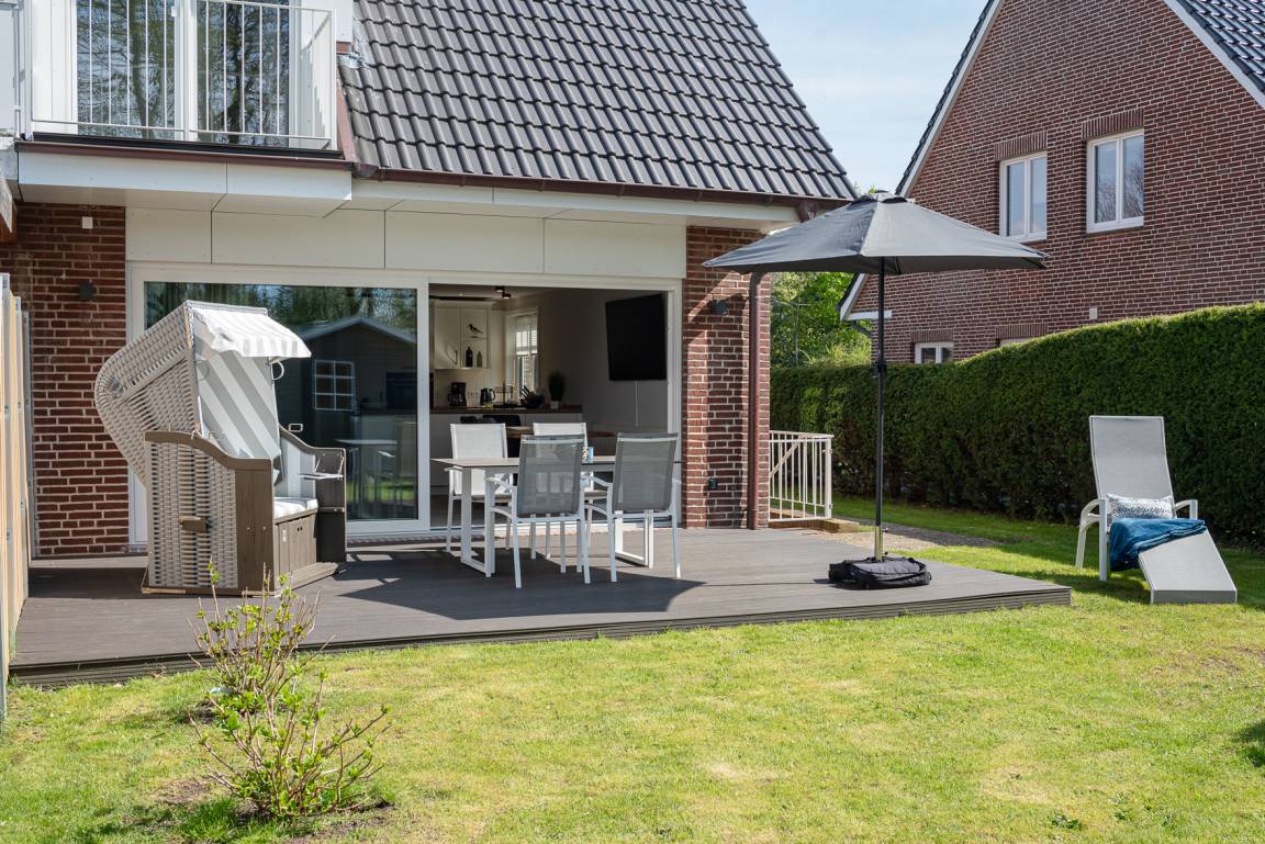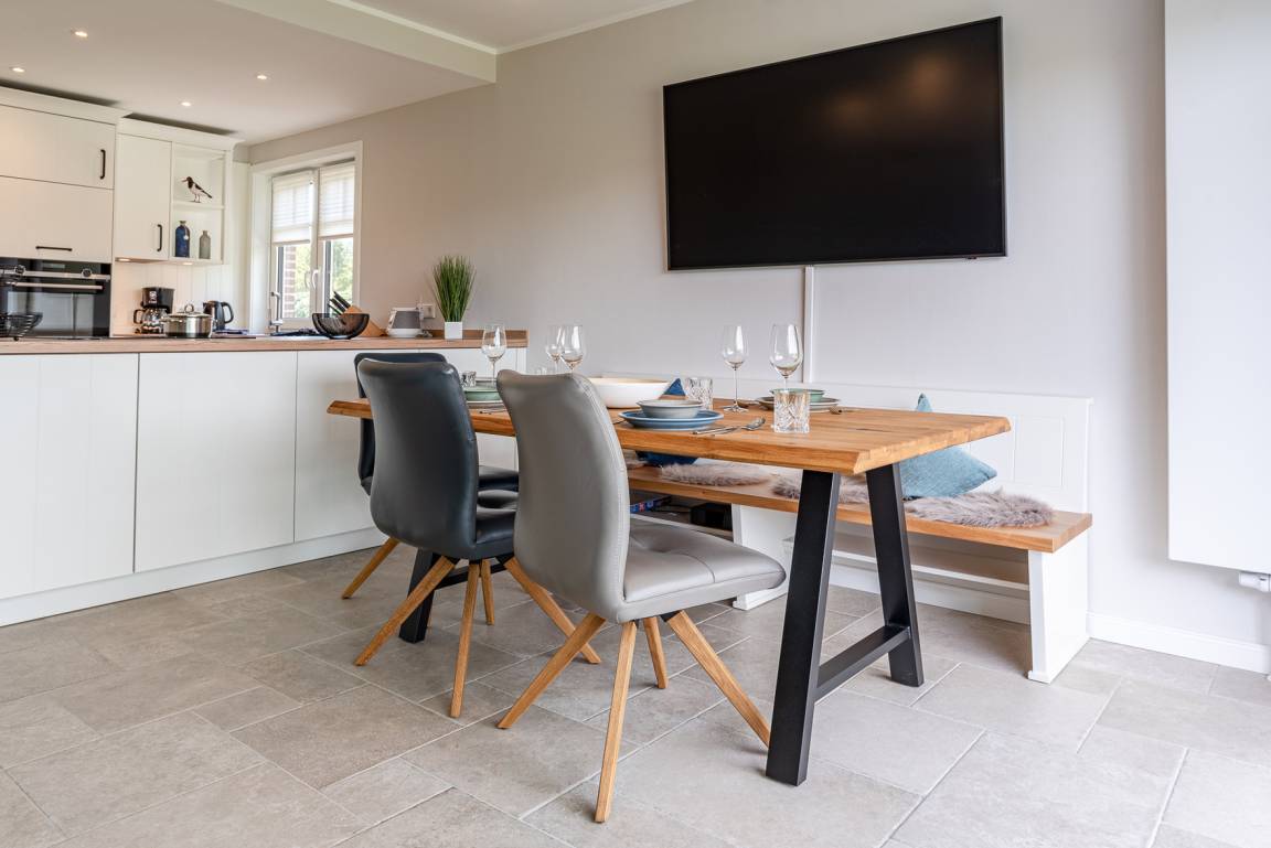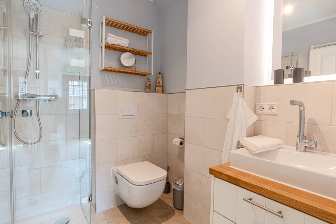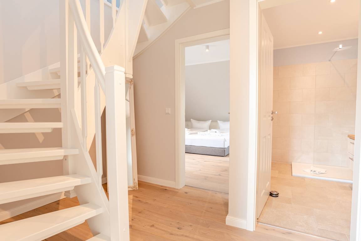 Im Erdgeschoß befindet sich der Wohnbereich mit einer gemütlichen Couch, der Essbereich und eine vollausgestattete Küche. Auf der Terrasse mit angrenzendem Gartenanteil finden Sie Gartenmöbel und einen Strandkorb (während der Saison). Außerdem gibt es ein Schlafzimmer mit Doppelbett und ein Duschbad. Im Obergeschoß gibt es zwei weitere Schlafzimmer mit Doppelbett (davon 1 x mit TV) und ein zweites Bad. Im DG befindet sich ein Platz, der über LAN-Kabel Telearbeit ermöglicht. Im Keller stehen Ihnen neben genügend Abstellfläche Waschmaschine und Trockner zur kostenfreien Nutzung zur Verfügung. Zur Wohnung gehört außerdem ein PKW-Stellplatz vor dem Haus. Ihre Fahrräder können Sie im Gartenschuppen abstellen.