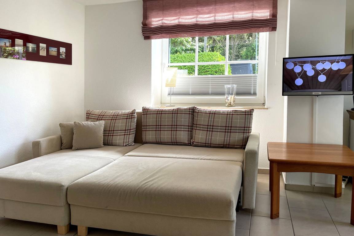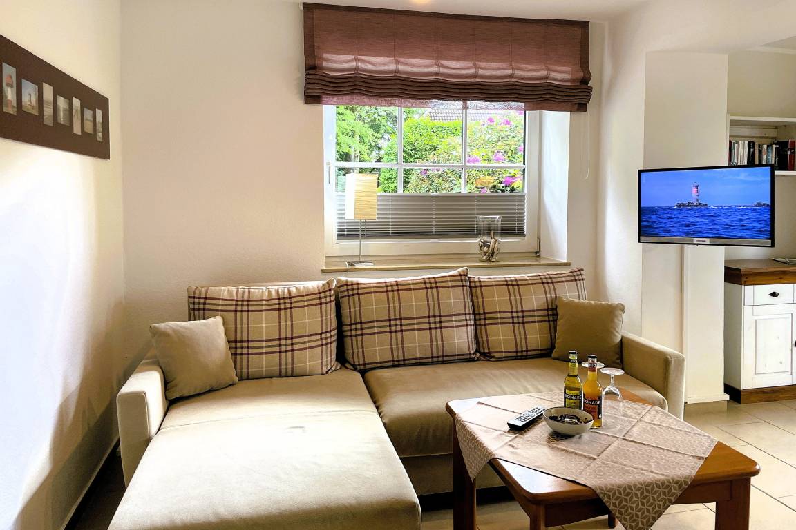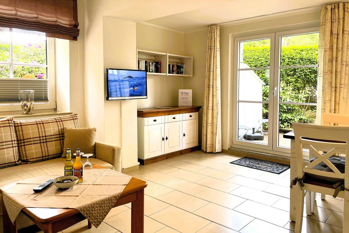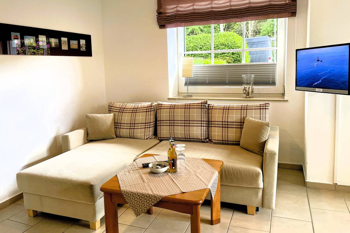Von der in Hochparterre befindlichen Eingangstüre gehen Sie einige Stufen hinab ins Erdgeschoss, wo sich die Unterkunft Blanker Hans befindet. Die modern und liebevoll eingerichtete Ferienwohnung ist für bis zu drei Personen geeignet und verspricht traumhafte Urlaubstage. Der offene Wohnbereich mit einladender hochwertiger Schlafcouch (150 x 200 cm), Flachbild TV, DVD-Player, WLAN, Telefon und Stereoanlage und integrierter vollausgestatteter Küche mit Backofen, Mikrowelle und Geschirrspüler sowie großzügigem Essbereich ist hell und freundlich. Von hier aus gelangen Sie auf die kleine, gepflegte Terrasse, die ruhig und geschützt liegt. Das Schlafzimmer verfügt über zwei Einzelbetten (80 x200 cm), wo Sie morgens ausgeruht aufwachen können. Das Bad ist hell und verfügt über eine Dusche mit Schiebetür und Handtuchheizung. Insgesamt ist dies ein Domizil mit Wohlfühlcharakter. Egal ob Sie einen ruhigen oder aktiven Urlaub planen, die Wohnung Blanker Hans läßt durch Ihre Lage und die Ausstattung keine Wünsche offen!