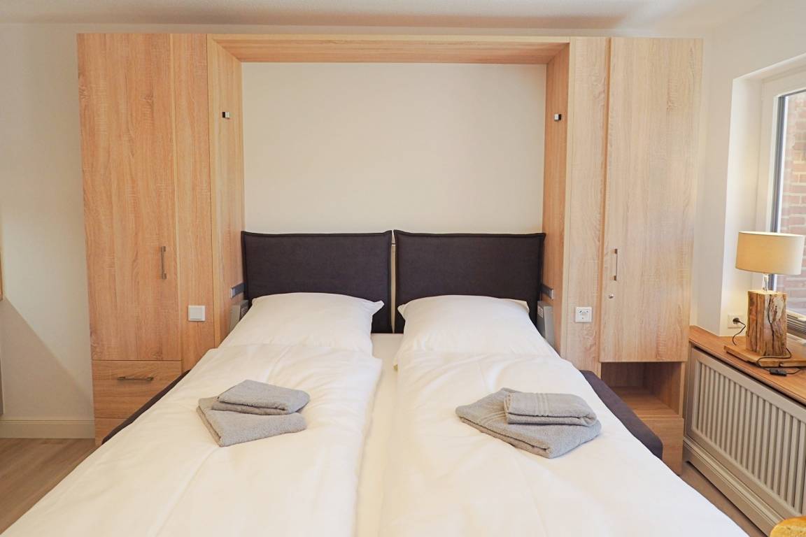 Ihnen steht ein Schlafzimmer mit zwei Einzelbetten (0,90m x 2,00m) über Eck, ein Einbaukleiderschrank mit ausreichend Stauraum und ein 43" Smart-TV zur Verfügung.