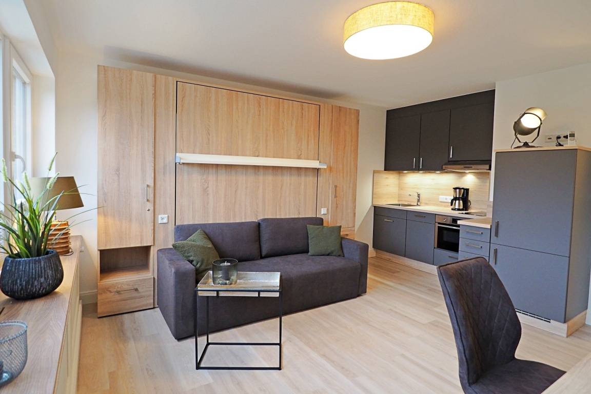 Der "Clou" im Wohnzimmer ist das versteckte Schrankbett (1,60m x 2,00m) hinter dem Sofa für eine eventuell dritte Person.