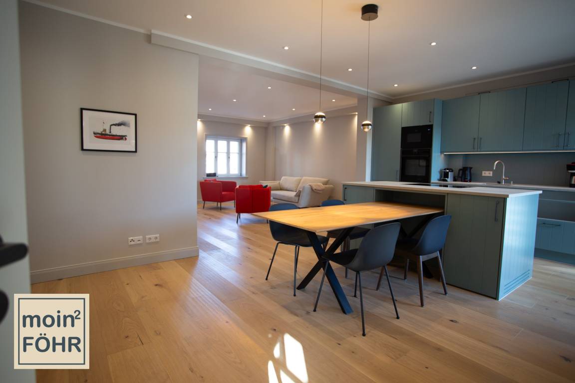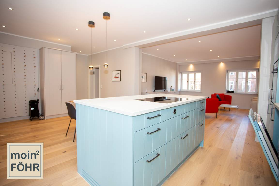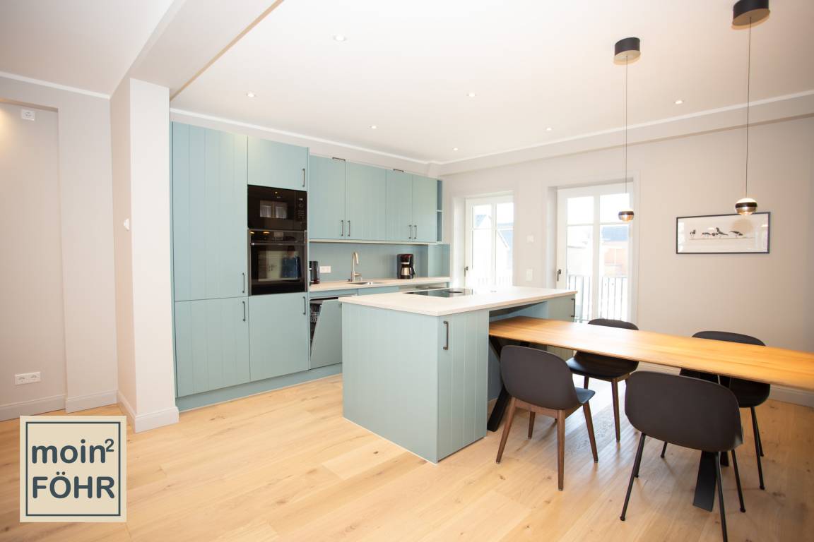 • Kombinierter Wohn-/Essbereich mit Eichenparkett, moderne Einbauküche und Zugang zum Südbalkon
